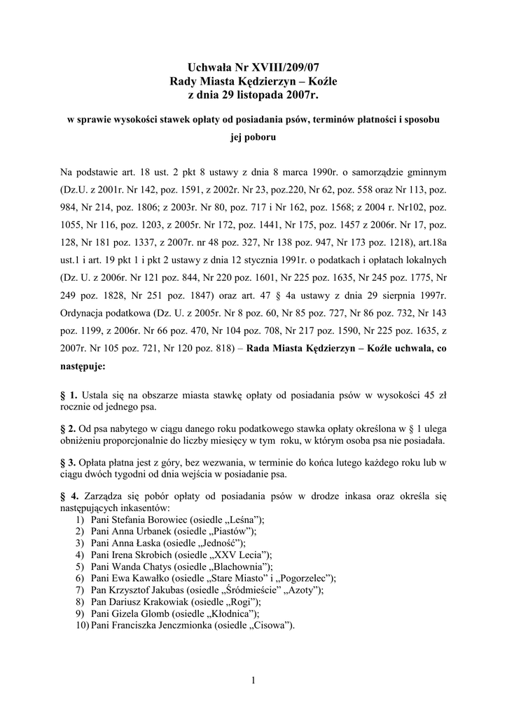 Uchwała Nr XVIII/209/07 Rady Miasta Kędzierzyn – Koźle z dnia 29 listopada 2007r. w sprawie wysokości stawek opłaty od posiadania psów, terminów płatności i sposobu jej poboru Na podstawie art. 18 ust. 2 pkt 8 ustawy z dnia 8 marca 1990r. o samorządzie gminnym (Dz.U. z 2001r. Nr 142, poz. 1591, z 2002r. Nr 23, poz.220, Nr 62, poz. 558 oraz Nr 113, poz. 984, Nr 214, poz. 1806; z 2003r. Nr 80, poz. 717 i Nr 162, poz. 1568; z 2004 r. Nr102, poz. 1055, Nr 116, poz. 1203, z 2005r. Nr 172, poz. 1441, Nr 175, poz. 1457 z 2006r. Nr 17, poz. 128, Nr 181 poz. 1337, z 2007r. nr 48 poz. 327, Nr 138 poz. 947, Nr 173 poz. 1218), art.18a ust.1 i art. 19 pkt 1 i pkt 2 ustawy z dnia 12 stycznia 1991r. o podatkach i opłatach lokalnych (Dz. U. z 2006r. Nr 121 poz. 844, Nr 220 poz. 1601, Nr 225 poz. 1635, Nr 245 poz. 1775, Nr 249 poz. 1828, Nr 251 poz. 1847) oraz art. 47 § 4a ustawy z dnia 29 sierpnia 1997r. Ordynacja podatkowa (Dz. U. z 2005r. Nr 8 poz. 60, Nr 85 poz. 727, Nr 86 poz. 732, Nr 143 poz. 1199, z 2006r. Nr 66 poz. 470, Nr 104 poz. 708, Nr 217 poz. 1590, Nr 225 poz. 1635, z 2007r. Nr 105 poz. 721, Nr 120 poz. 818) – Rada Miasta Kędzierzyn – Koźle uchwala, co następuje: § 1. Ustala się na obszarze miasta stawkę opłaty od posiadania psów w wysokości 45 zł rocznie od jednego psa. § 2. Od psa nabytego w ciągu danego roku podatkowego stawka opłaty określona w § 1 ulega obniŜeniu proporcjonalnie do liczby miesięcy w tym roku, w którym osoba psa nie posiadała. § 3. Opłata płatna jest z góry, bez wezwania, w terminie do końca lutego kaŜdego roku lub w ciągu dwóch tygodni od dnia wejścia w posiadanie psa. § 4. Zarządza się pobór opłaty od posiadania psów w drodze inkasa oraz określa się następujących inkasentów: 1) Pani Stefania Borowiec (osiedle „Leśna”); 2) Pani Anna Urbanek (osiedle „Piastów”); 3) Pani Anna Łaska (osiedle „Jedność”); 4) Pani Irena Skrobich (osiedle „XXV Lecia”); 5) Pani Wanda Chatys (osiedle „Blachownia”); 6) Pani Ewa Kawałko (osiedle „Stare Miasto” i „Pogorzelec”); 7) Pan Krzysztof Jakubas (osiedle „Śródmieście” „Azoty”); 8) Pan Dariusz Krakowiak (osiedle „Rogi”); 9) Pani Gizela Glomb (osiedle „Kłodnica”); 10) Pani Franciszka Jenczmionka (osiedle „Cisowa”). 1 § 5. Za pobór opłaty od posiadania psów inkasentowi przysługuje wynagrodzenie w wysokości 15 % zainkasowanej opłaty. § 6. Ustala się termin płatności dla inkasentów do dni 7-miu, po ostatnim dniu płatności w którym wpłata powinna nastąpić zgodnie z przepisami prawa podatkowego. § 7. Traci moc uchwała Rady Miejskiej w Kędzierzynie-Koźlu Nr XLVI/564/2001 z dnia 29 listopada 2001r. w sprawie wysokości stawek podatku od posiadania psów, terminów płatności i sposobu jego poboru (Dz. Urz. Woj. Opolskiego z 2005r. Nr 84 poz. 2879). § 8. Wykonanie uchwały powierza się Prezydentowi Miasta. § 9. Uchwała podlega ogłoszeniu w Dzienniku Urzędowym Województwa Opolskiego i wchodzi w Ŝycie z dniem 1 stycznia 2008r. 2