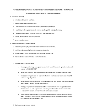 PROCEDURY POSTĘPOWANIA PRACOWNIKÓW SZKOŁY PODSTAWOWEJ NR 2 W PUŁAWACH W SYTUACJACH KRYZYSOWYCH Z UDZIAŁEM UCZNIA I . Procedury dotyczą: 1. nieobecności ucznia w szkole, 2. agresywnego zachowania ucznia, 3. posiadania przez ucznia substancji przypominającej narkotyk, 4. kradzieży i celowego zniszczenia mienia szkolnego lub cudzej własności, 5. ucznia pod wpływem alkoholu lub środka psychoaktywnego, 6. ucznia, który zgłasza złe samopoczucie, 7. przemocy domowej. II. Sposób prowadzenia postępowania 1. działania powinny być prowadzone niezwłocznie po zdarzeniu, 2. rodzice mają prawo być poinformowani o zdarzeniu, 3. uczeń biorący udział w zdarzeniu musi czuć się bezpiecznie, 4. każde zdarzenie powinno być udokumentowane. 1. Nieobecność ucznia w szkole • Rodzic powinien tego samego dnia osobiście lub telefonicznie zgłosić nieobecność ucznia - tel. 81 886 44 27. • Jeżeli tego nie zrobi, wychowawca kontaktuje się tego samego dnia z rodzicem. • Rodzic zobowiązany jest do usprawiedliwienia nieobecności ucznia pisemnie lub ustnie w ciągu tygodnia. • Jeżeli nieobecności powtarzają się lub przekraczają pięć dni bez usprawiedliwienia, wychowawca zgłasza ten fakt do pedagoga. • Pedagog wzywa rodzica i przeprowadza z uczniem rozmowę w jego obecności. Rozmowa ma na celu wyjaśnieniu przyczyny nieobecności, zawarcie kontraktu z uczniem i rodzicem, poinformowanie o konsekwencjach. • W przypadku powtarzających się nadal nieusprawiedliwionych nieobecności lub braku kontaktu z rodzicem, dyrektor kieruje pismo do Sądu Rodzinnego z prośbą o interwencję w środowisko ucznia. 2. Zachowanie agresywne ucznia • Nauczyciel zdecydowanie przerywa agresywne zachowanie sprawcy wobec ofiary. • Zawiadamia wychowawcę i pedagoga. • Pedagog zajmuje się uczniem, który zachował się agresywnie. Wychowawca zawiadamia rodziców ucznia i informuje o agresywnym zachowaniu. • Wychowawca zawiadamia rodziców ucznia poszkodowanego i jeśli to konieczne prosi o przybycie do szkoły. • Wicedyrektor, wychowawca i pedagog przeprowadzają rozmowę z rodzicem ucznia mającego problemy z zachowaniem: - analizują przyczyny niewłaściwego zachowania, - zobowiązują rodzica do systematycznego kontaktowania się ze szkołą, - pedagog proponuje rodzicom formy oddziaływania na ucznia, które pomogą w zmianie jego zachowania. - podpisują kontrakt z uczniem. • W sytuacji, kiedy uczeń w dalszym ciągu stwarza zagrożenie dla innych uczniów dyrektor, w porozumieniu z wychowawcą i pedagogiem, kieruję wniosek do Sąd Rodzinnego. • Ze wszystkich działań wychowawca lub pedagog sporządza notatki służbowe podpisane przez osoby uczestniczące. 3. Posiadanie przez ucznia substancji przypominającej narkotyk • Nauczyciel zabezpiecza substancję do czasu przyjazdu policji. • Powiadamia dyrektora szkoły i wzywa w trybie natychmiastowym rodziców/opiekunów ucznia. • Pedagog bądź dyrektor próbuje ustalić od kogo uczeń nabył substancję. • Dyrektor przekazuje zabezpieczoną substancję policji oraz informacje dotyczące zdarzenia. • Z przeprowadzonych działań wychowawca lub pedagog sporządza notatkę służbową. 4. Kradzież i celowe zniszczenie mienia szkolnego lub cudzej własności • Wychowawca powiadamia dyrektora szkoły. • Sprawca kradzieży zostaje pod opieką właściwej osoby (wychowawca, pedagog). • Wychowawca na podstawie informacji świadków wyjaśnia okoliczności kradzieży lub zniszczenia mienia. • Wychowawca zawiadamia rodziców ucznia-sprawcy, którzy mają obowiązek zgłosić się do szkoły. • W przypadku szkody dyrektor szkoły ma prawo obciążyć rodzica odpowiedzialnością finansową. • Konsekwencją dla ucznia jest obniżona ocena z zachowania. • Wychowawca lub pedagog sporządza notatkę służbową ze zdarzenia. 5. Uczeń pod wpływem alkoholu lub środka psychoaktywnego • Wychowawca lub osoba interweniująca odizolowuje ucznia, ale nie pozostawia go samego (np. pozostawia go pod opieką pielęgniarki lub wzywa lekarza). • Powiadamia o tym fakcie rodziców/opiekunów, których zobowiązuje do natychmiastowego odebrania ucznia ze szkoły. • Dyrektor zawiadamia policję i Sąd Rodzinny. • Uczeń i rodzice są kierowani przez pedagoga do odpowiednich instytucji. • Z przeprowadzonych działań pedagog sporządza notatkę służbową. 6. Uczeń, który zgłasza złe samopoczucie • W przypadku zgłoszenia złego samopoczucia przez ucznia, wychowawca lub nauczyciel kieruje go do pielęgniarki szkolnej lub, w przypadku jej nieobecności, do pedagoga szkolnego. • Wychowawca lub pielęgniarka powiadamia rodziców/opiekunów prawnych ucznia, aby odebrali go ze szkoły. • W nagłych wypadkach dyrektor lub jego zastępca podejmuje decyzję o wezwaniu pogotowia. • Chorego ucznia ze szkoły może odebrać rodzic/opiekun prawny lub bliski członek rodziny. 7. Przemoc domowa • Nauczyciel lub wychowawca, który podejrzewa, że uczeń jest ofiarą przemocy domowej zawiadamia pedagoga oraz pielęgniarkę szkolną, która dyskretnie dokonuje oględzin ucznia. • Pedagog szkolny przeprowadza rozmowę z uczniem, a następnie z jego rodzicami/opiekunami prawnymi w celu wyjaśnienia sytuacji. • Jeżeli sygnały świadczące o przemocy powtarzają się, dyrektor i pedagog kierują pismo do Sądu Rodzinnego w celu zbadania środowiska ucznia. • Z przeprowadzonych działań pedagog sporządza notatkę służbową.