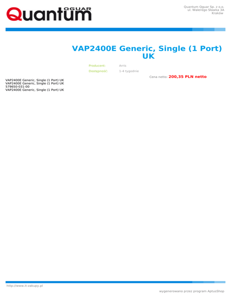 Quantum Qguar Sp. z o.o. ul. Walerego Sławka 3A Kraków VAP2400E Generic, Single (1 Port) UK Producent: Arris Dostępność: 1-4 tygodnie Cena netto: 200,35 PLN netto VAP2400E Generic, Single (1 Port) UK VAP2400E Generic, Single (1 Port) UK 579650-031-00 VAP2400E Generic, Single (1 Port) UK http://www.it-zakupy.pl wygenerowano przez program AptusShop