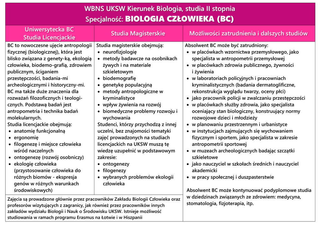 W WBBN NSS U UK KSSW WK Kiieerruunneekk BBiioollooggiiaa,, ssttuuddiiaa IIII ssttooppnniiaa SSppeeccjjaallnnoośśćć:: BIOLOGIA CZŁOWIEKA (BC) U Unniiw weerrssyytteecckkaa BBCC SSttuuddiiaa LLiicceennccjjaacckkiiee SSttuuddiiaa M Maaggiisstteerrsskkiiee BC to nowoczesne ujęcie antropologii Studia magisterskie obejmują: fizycznej (biologicznej), która jest neurofizjologię blisko związana z genety-ką, ekologią metody badawcze na osobnikach człowieka, biodemo-grafią, zdrowiem żywych i na materiale publicznym, ściganiem szkieletowym przestępczości, badania-mi biodemografię archeologicznymi i historyczny-mi. genetykę populacyjną BC ma także duże znaczenia dla metody antropologiczne w rozważań filozoficznych i teologikryminalistyce cznych. Podstawą badań jest wpływ żywienia na rozwój antropometria i technika badań biomedyczne problemy rozwoju i molekularnych. wychowania Studia licencjackie obejmują: Studenci, którzy przychodzą z innej anatomię funkcjonalną uczelni, bez znajomości tematyki ergonomię zajęć prowadzonych na studiach filogenezę i miejsce człowieka licencjackich na UKSW muszą tę wśród naczelnych wiedzę uzupełnić w podstawowym ontogenezę (rozwój osobniczy) zakresie: ekologię człowieka ontogenezy (przystosowanie człowieka do filogenezy różnych biomów - ekspresja wybranych problemów ekologii genów w różnych warunkach człowieka środowiskowych) Zajęcia są prowadzone głównie przez pracowników Zakładu Biologii Człowieka oraz profesorów wizytujących z zagranicy, jak również przez pracowników innych zakładów wydziału Biologii i Nauk o Środowisku UKSW. Istnieje możliwość studiowania w ramach programu Erasmus na Łotwie i w Hiszpanii M Moożżlliiw woośśccii zzaattrruuddnniieenniiaa ii ddaallsszzyycchh ssttuuddiióów w Absolwent BC może być zatrudniony: w placówkach wzornictwa przemysłowego, jako specjalista w antropometrii przemysłowej w placówkach zdrowia publicznego, żywności i żywienia w laboratoriach policyjnych i pracowniach kryminalistycznych (badania dermatoglificzne, rekonstrukcja wyglądu twarzy, oceny płci) jako pracownik policji w zwalczaniu przestępczości w placówkach służby zdrowia, jako specjalista oceniający stan biologiczny, konstruujący normy rozwojowe dzieci i młodzieży w planowaniu przestrzennym i urbanistyce w instytucjach zajmujących się wychowaniem fizycznym i sportem, jako specjalista w zakresie antropometrii sportowej w muzeach archeologicznych badając szczątki szkieletowe jako nauczyciel w szkołach średnich i nauczyciel akademicki w pracy społecznej i duszpasterstwie Absolwent BC może kontynuować podyplomowe studia w dziedzinach związanych ze zdrowiem: medycyna, stomatologia, fizjoterapia, itp.