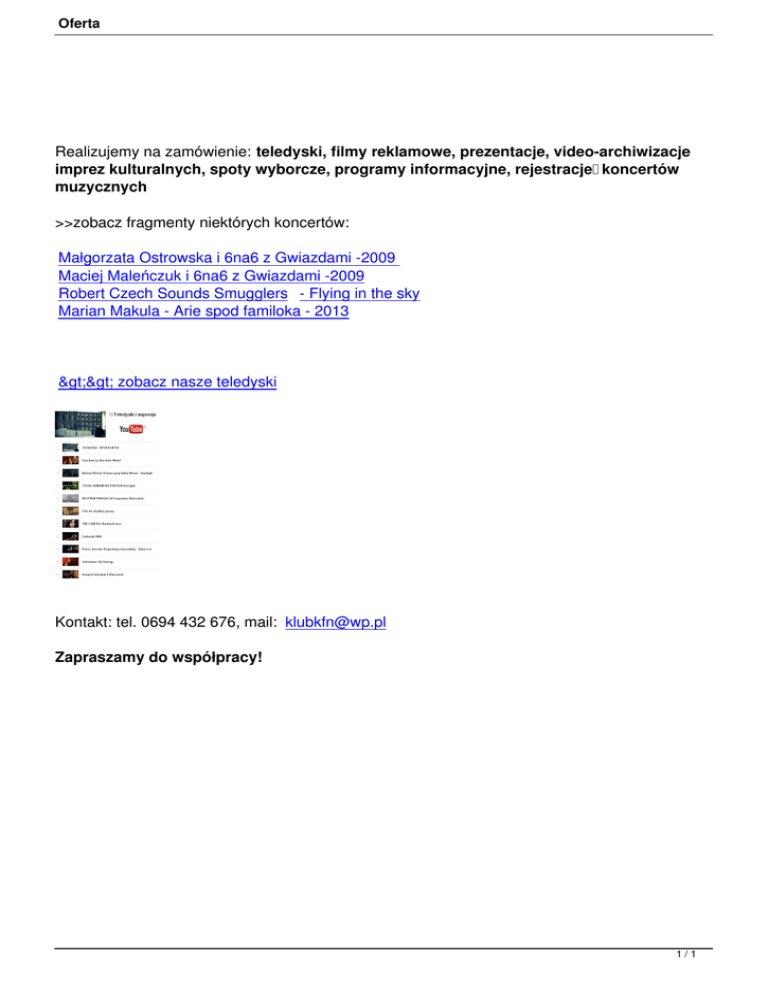 Oferta Realizujemy na zamówienie: teledyski, filmy reklamowe, prezentacje, video-archiwizacje imprez kulturalnych, spoty wyborcze, programy informacyjne, rejestracje koncertów muzycznych >>zobacz fragmenty niektórych koncertów: Małgorzata Ostrowska i 6na6 z Gwiazdami -2009 Maciej Maleńczuk i 6na6 z Gwiazdami -2009 Robert Czech Sounds Smugglers - Flying in the sky Marian Makula - Arie spod familoka - 2013 >> zobacz nasze teledyski Kontakt: tel. 0694 432 676, mail: [email protected] Zapraszamy do współpracy! 1/1