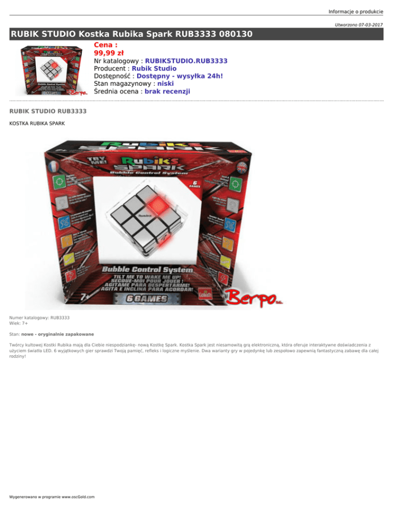 Informacje o produkcie Utworzono 07-03-2017 RUBIK STUDIO Kostka Rubika Spark RUB3333 080130 Cena : 99,99 zł Nr katalogowy : RUBIKSTUDIO.RUB3333 Producent : Rubik Studio Dostępność : Dostępny - wysyłka 24h! Stan magazynowy : niski Średnia ocena : brak recenzji RUBIK STUDIO RUB3333 KOSTKA RUBIKA SPARK Numer katalogowy: RUB3333 Wiek: 7+ Stan: nowe - oryginalnie zapakowane Twórcy kultowej Kostki Rubika mają dla Ciebie niespodziankę- nową Kostkę Spark. Kostka Spark jest niesamowitą grą elektroniczną, która oferuje interaktywne doświadczenia z użyciem światła LED. 6 wyjątkowych gier sprawdzi Twoją pamięć, refleks i logiczne myślenie. Dwa warianty gry w pojedynkę lub zespołowo zapewnią fantastyczną zabawę dla całej rodziny! Wygenerowano w programie www.oscGold.com Dostępność w salonach: Ilość: Sklep - Złotniki: 1 Sklep - zlikwidowany: 0 Sklep - Szczepankowo: 1 Dostępne opcje RUBIK STUDIO Kostka Rubika Spark RUB3333 080130 » Wiek: 5 - 7 lat, 8 - 11 lat, 12 lat i więcej.