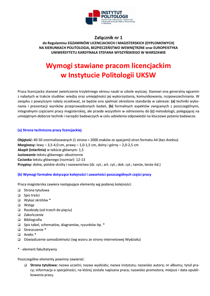 Załącznik nr 1 do Regulaminu EGZAMINÓW LICENCJACKICH I MAGISTERSKICH (DYPLOMOWYCH) NA KIERUNKACH POLITOLOGIA, BEZPIECZEŃSTWO WEWNĘTRZNE oraz EUROPEISTYKA UNIWERSYTETU KARDYNAŁA STEFANA WYSZYŃSKIEGO W WARSZAWIE Wymogi stawiane pracom licencjackim w Instytucie Politologii UKSW Praca licencjacka stanowi zwieńczenie trzyletniego okresu nauki w szkole wyższej. Stanowi ona generalny egzamin z nabytych w trakcie studiów: wiedzy oraz umiejętności jej wykorzystania, komunikowania, rozpowszechniania. W związku z powyższym należy oczekiwać, że będzie ona spełniać określone standardy w zakresie: (a) techniki wykonania i prezentacji wyników przeprowadzonych badań, (b) formalnych aspektów związanych z poszczególnymi, integralnymi częściami pracy magisterskiej, ale przede wszystkim w odniesieniu do (c) metodologii, polegającej na umiejętnym doborze technik i narzędzi badawczych w celu udzielenia odpowiedzi na kluczowe pytania badawcze. (a) Strona techniczna pracy licencjackiej Objętość: 40-50 znormalizowanych (1 strona = 2000 znaków ze spacjami) stron formatu A4 (bez Aneksu) Marginesy: lewy – 3,5-4,0 cm, prawy – 1,0-1,5 cm, dolny i górny – 2,0-2,5 cm Akapit (interlinia) w tekście głównym: 1,5 Justowanie tekstu głównego: obustronne Czcionka tekstu głównego (rozmiar): 12-13 Przypisy: dolne, polskie skróty i nazewnictwo (dz. cyt.; art. cyt.; dok. cyt.; tamże, tenże itd.) (b) Wymogi formalne dotyczące kolejności i zawartości poszczególnych części pracy Praca magisterska zawiera następujące elementy wg podanej kolejności: Strona tytułowa Spis treści Wykaz skrótów * Wstęp Rozdziały (od trzech do pięciu) Zakończenie Bibliografia Spis tabel, schematów, diagramów, rysunków itp. * Streszczenie * Aneks * Oświadczenie samodzielności (wg wzoru ze strony internetowej Wydziału) * - element fakultatywny Poszczególne elementy powinny zawierać: Strona tytułowa: nazwa uczelni; nazwa wydziału; nazwa instytutu; nazwisko autora; nr albumu; tytuł pracy; informacja o specjalności, na której została napisana praca; nazwisko promotora; miejsce i data opublikowania pracy. Wykaz skrótów (i symboli): wszystkie skróty i symbole użyte w pracy wraz z wyjaśnieniem; jeśli chodzi o skróty i nazwy obcojęzyczne, należy obok nazwy obcojęzycznej zamieścić tłumaczenie na język polski; układ alfabetyczny. Wstęp: ogólne wprowadzenie do obszaru problemowego pracy; zwięzła prezentacja dotychczasowych badań i ich wyników odnośnie do poruszanej problematyki (tzw. stan badań); szczegółowa prezentacja własnego zagadnienia badawczego (motywy i racje podjęcia danego tematu; problem badawczy; cel pracy; hipoteza; zakres pracy; metody, techniki i narzędzia badawcze; struktura pracy). Rozdziały: wprowadzenie do rozdziału – szczegółowe pytania badawcze; analiza poszczególnych zagadnień w ramach podrozdziałów i paragrafów; wnioski z analiz. Zakończenie: zwięzłe ustosunkowanie się do postawionych na wstępie hipotez, w świetle uzyskanych w trakcie badań danych; omówienie występujących w trakcie prowadzonych badań trudności; perspektywa nowych badań (nowe pytania badawcze). Bibliografia: podział na źródła i opracowania; próba typologizacji poszczególnych źródeł i opracowań; w obrębie poszczególnych działów – układ alfabetyczny; minimum: 20 pozycji „nieinternetowych” (nie dotyczy czasopism naukowych dostępnych przez internet). Spis tabel, schematów, diagramów, rysunków itp.: wykaz wg numerów poszczególnych pozycji, oddzielny dla każdego typu prezentacji graficznych. Streszczenie: objętość 1-2 stron maszynopisu w języku polskim oraz jednym z języków konferencyjnych (angielski, francuski, niemiecki, rosyjski, chiński). Aneks: spis poszczególnych pozycji – załączników, następnie – załączniki. (c) Wymogi metodologiczne (poziom zaawansowania teoretycznego) W ramach pracy magisterskiej student/ka powinien/powinna: sprecyzować najważniejsze pojęcia używane w swojej pracy, zwłaszcza jeśli są one niejednoznaczne i budzące kontrowersje (we Wstępie lub w jednym z rozdziałów); przedstawić problem badawczy, hipotezy oraz metody, techniki i narzędzia analizy, za pomocą których student/studentka zamierza odpowiedzieć na główne pytanie problemowe (we Wstępie lub w jednym z rozdziałów). doprecyzować obszar badawczy – zakres przedmiotowy pracy (zakresy: podmiotowy, materialny, terytorialny i czasowy) Praca licencjacka spośród trzech głównych funkcji badań naukowych (deskryptywna, eksplanacyjna i prognostyczna), powinna realizować pierwszą z nich. Możliwa i pożądana jest realizacja funkcji diagnostycznej. W ramach pracy licencjackiej powinien mieć miejsce szczegółowy opis wybranego fenomenu społeczno-politycznego, uwzględniający jego cechy ilościowe i jakościowe (np. szczegółowa charakterystyka działalności wybranej instytucji). Charakterystyki tej należy dokonać na podstawie zgromadzonej literatury (opracowań) oraz źródeł. Szczegółowe standardy w publikacjach: R. Zenderowski, Technika pisania prac magisterskich, Wyd. CeDeWu, Warszawa 2005. K. Pawlik, R. Zenderowski, Dyplom z Internetu. Jak korzystać z Internetu pisząc prace dyplomowe?, Wyd. CeDeWu, Warszawa 2010.