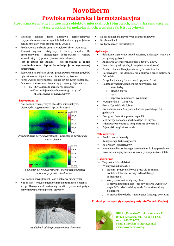 Novotherm Powłoka malarska i termoizolacyjna Stosowana wewnątrz i na zewnątrz obiektów mieszkalnych i biurowych, jako farba renowacyjna o właściwościach termoizolacyjnych, w miejsce farb tradycyjnych • • • • • Wysokiej jakości farba akrylowa termoizolacyjna z wypełniaczem ceramicznym i dodatkami wiążącymi (ziarna ceramiczne zawierają próżnię rzędu 280hPa) Produkowana na bazie emulsji winylowej i bieli tytanowej. Stanowi wystrój estetyczny i barierę cieplną dla promieniowania słonecznego, podczerwieni i ruchów konwekcyjnych (np. znad pieców i kaloryferów). Jest to istotą tej izolacji - nie pochłania a odbija promieniowanie cieplne kumulując je w ogrzewanej przestrzeni. Stosowana na sufitach chroni przed powstawaniem grzybów i pleśni, wzmacniając jednocześnie izolację stropów. Farba wysoce ekonomiczna – dająca szybki zwrot nakładów. Znacznie zwiększa opór termiczny przegrody, dając efekty: o 15 – 20% oszczędności energii grzewczej o do 40% zmniejszenie poboru energii urządzeń chłodniczych i klimatyzacyjnych Zastosowanie: • Na ścianach wewnętrznych obiektów mieszkalnych, biurowych, magazynowych i produkcyjnych. Na chłodniach magazynowych i samochodowych Na zbiornikach Na kontenerach mieszkalnych • • • Aplikacja: • • • • • • • • • • • • • • Przed aplikacją powłoki Novotherm – widoczne są bardzo duże mostki cieplne dokładnie wymieszać przed użyciem, dolewając wody do pożądanej gęstości Aplikować w temperaturze pomiędzy 50C a 300C. Usunąć starą luźną farbę, krawędzie przeszlifować Powierzchnia aplikacji powinna być czysta i sucha Na zewnątrz – po deszczu, nie aplikować przed upływem 2-3 godzin Po aplikacji nie myć ścian przed upływem 5 dni Nakładać wałkiem, pędzlem lub natryskiem, na: o starą farbę o gładź gipsową o tynk o zaprawę cementowo - wapienną Wydajność: 5,5 – 7,0m2/ kg Grubość powłoki do 0,3mm Czas schnięcia ok. 5-6 godzin, kolejna powłoka po 6-7 godzinach Dostępna również w postaci szpachli Myć narzędzia wodą natychmiast po ich użyciu. Składować wewnątrz w temperaturze powyżej 5oC. Pojemniki zamykać szczelnie Właściwości: • • • • • Produkt na bazie wody Konsystencja farby akrylowej Kolor biały – podstawowy Istnieje możliwość łatwego barwienia na kolory pastelowe żywotność magazynowa w zamkniętym pojemniku – 2 lata Ostrzeżenia • • Po aplikacji powłoki Novotherm – mostki cieplne zostały w znaczący sposób zniwelowane. • • Na ścianach zewnętrznych, jako finalna warstwa tynku Na sufitach – w dużej mierze eliminuje potrzebę ocieplania stropu. Blokuje ciepło wytrącając punkt rosy – zapobiega tym samym powstawaniu pleśni i grzybów Trzymać z dala od dzieci. W przypadku kontaktu z : o oczami – przepłukać wodą przez ok. 15 minut. Kontakt z lekarzem w przypadku dalszego podrażnienia. o skórę – przemyć wodą z mydłem; W przypadku połknięcia – nie powodować wymiotów, wypić 1-2 szklanki mleka/ wody. Skontaktować się z lekarzem. o W przypadku wdechu – zaczerpnąć świeżego powietrza Produkt posiada pozytywną opinię Instytutu Techniki Cieplnej Na dachach odbija promieniowanie słoneczne BHU „Boexim” ul. Francuska 53 40-028 Katowice, tel. 32-255-54-83, kom. 602-753-572, e-mail : [email protected] www.novotherm.com.pl