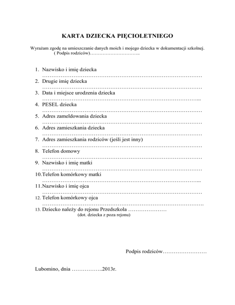 KARTA DZIECKA PIĘCIOLETNIEGO Wyrażam zgodę na umieszczanie danych moich i mojego dziecka w dokumentacji szkolnej. ( Podpis rodziców)………………………….. 1. Nazwisko i imię dziecka …………………………………………………………………………… 2. Drugie imię dziecka …………………………………………………………………………… 3. Data i miejsce urodzenia dziecka …………………………………………………………………………... 4. PESEL dziecka …………………………………………………………………………… 5. Adres zameldowania dziecka …………………………………………………………………………… 6. Adres zamieszkania dziecka …………………………………………………………………………… 7. Adres zamieszkania rodziców (jeśli jest inny) …………………………………………………………………………… 8. Telefon domowy …………………………………………………………………………… 9. Nazwisko i imię matki …………………………………………………………………………… 10.Telefon komórkowy matki …………………………………………………………………………... 11.Nazwisko i imię ojca …………………………………………………………………………… 12. Telefon komórkowy ojca ……………………………………………………………………………. 13. Dziecko należy do rejonu Przedszkola ………………… (dot. dziecka z poza rejonu) Podpis rodziców…………………… Lubomino, dnia ……………..2013r.
