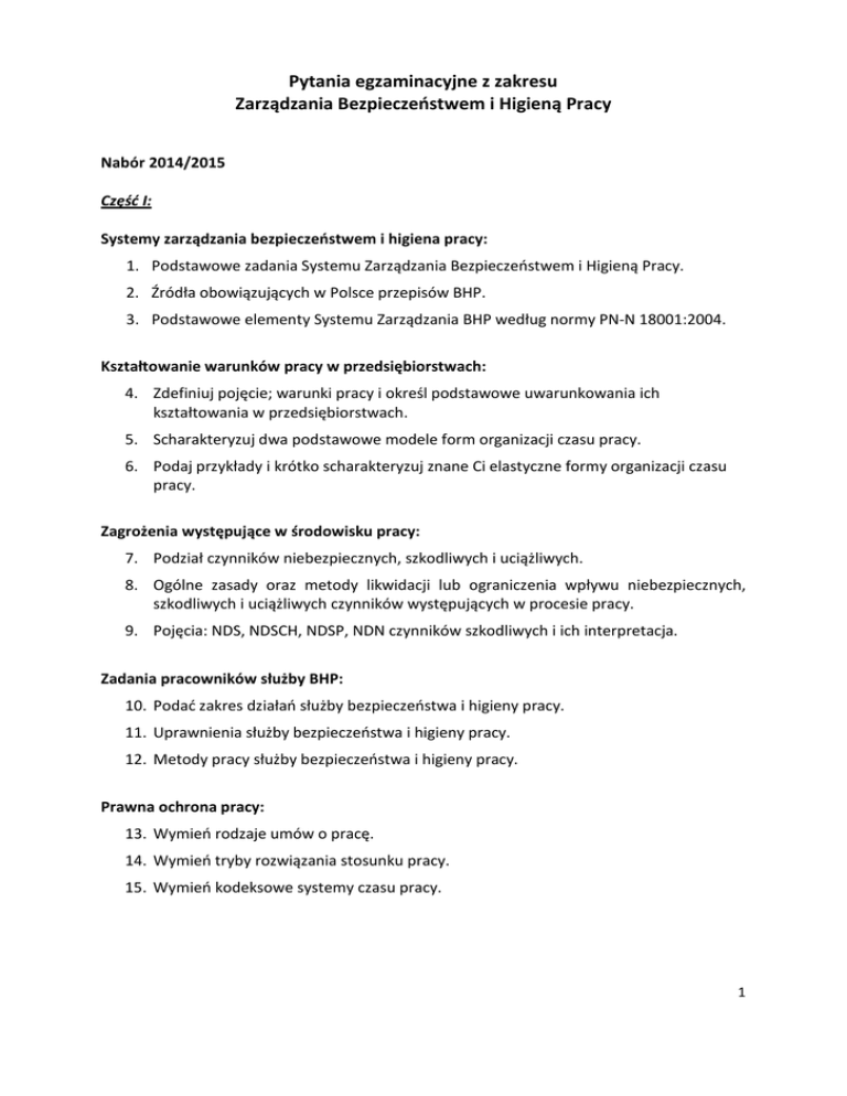 Pytania egzaminacyjne z zakresu Zarządzania Bezpieczeństwem i Higieną Pracy Nabór 2014/2015 Część I: Systemy zarządzania bezpieczeństwem i higiena pracy: 1. Podstawowe zadania Systemu Zarządzania Bezpieczeństwem i Higieną Pracy. 2. Źródła obowiązujących w Polsce przepisów BHP. 3. Podstawowe elementy Systemu Zarządzania BHP według normy PN-N 18001:2004. Kształtowanie warunków pracy w przedsiębiorstwach: 4. Zdefiniuj pojęcie; warunki pracy i określ podstawowe uwarunkowania ich kształtowania w przedsiębiorstwach. 5. Scharakteryzuj dwa podstawowe modele form organizacji czasu pracy. 6. Podaj przykłady i krótko scharakteryzuj znane Ci elastyczne formy organizacji czasu pracy. Zagrożenia występujące w środowisku pracy: 7. Podział czynników niebezpiecznych, szkodliwych i uciążliwych. 8. Ogólne zasady oraz metody likwidacji lub ograniczenia wpływu niebezpiecznych, szkodliwych i uciążliwych czynników występujących w procesie pracy. 9. Pojęcia: NDS, NDSCH, NDSP, NDN czynników szkodliwych i ich interpretacja. Zadania pracowników służby BHP: 10. Podać zakres działań służby bezpieczeństwa i higieny pracy. 11. Uprawnienia służby bezpieczeństwa i higieny pracy. 12. Metody pracy służby bezpieczeństwa i higieny pracy. Prawna ochrona pracy: 13. Wymień rodzaje umów o pracę. 14. Wymień tryby rozwiązania stosunku pracy. 15. Wymień kodeksowe systemy czasu pracy. 1 Część II: Ergonomia i fizjologia pracy: 16. Omów na dowolnym przykładzie, w jakim celu wykorzystuje się zasady ergonomii i fizjologii pracy w przepisach BHP. 17. Omów, uwzględniając zasady ergonomii, bezpieczny i higieniczny sposób wykonywania pracy na stanowisku wyposażonym w monitory ekranowe. Zarządzanie jakością w przedsiębiorstwie: 18. Rola normalizacji europejskiej we współczesnym zarządzaniu jakością i bezpieczeństwem. 19. Omów zasady zarządzania jakością w przedsiębiorstwie. 20. Idea i zadania tworzenia zintegrowanego systemu zarządzania w przedsiębiorstwie. Szkolenia w zakresie BHP: 21. Jakie akty prawne normalizują konieczność przeprowadzenia szkoleń w zakresie BHP. 22. Zasady, zakres, wymogi oraz sposób dokumentowania szkoleń na podstawie rozporządzenia MGiP z dnia 27 lipca 2004r. wraz z późniejszymi zmianami. 23. Przebieg zajęć dydaktycznych z uwzględnieniem wybranej przez siebie metody nauczania. 24. Jakie są formy szkolenia dla poszczególnych grup pracowniczych. 25. Obowiązki organizatora szkolenia. Europejskie standardy warunków pracy: 26. Wskaż zakres przedmiotowy wspólnotowego prawa pracy w obszarze warunków pracy. 27. Jakie przepisy określają wymiar i formy organizacji czasu pracy w Unii Europejskiej? 28. Określ wpływ ustawodawstwa wspólnotowego na działania podejmowane w polskich przedsiębiorstwach w obszarze warunków pracy. 29. Omów istotę zjawiska mobbingu oraz wskaż na relacje mobbing a BHP. Organizacja i techniczne bezpieczeństwo stanowiska pracy: 30. Omów zasady postępowania pracodawcy tworzącego nowe stanowiska pracy w nowych obiektach (odbiór). 31. Podaj podstawowe wymiary dotyczące wysokości, kubatury pomieszczeń pracy (stanowisk pracy) w zależności od rodzaju prowadzonych procesów. 32. Obowiązki pracodawcy osób kierujących pracownikami oraz pracowników wynikające z działu X Kodeksu Pracy. 33. Rodzaje badań lekarskich jakim należy poddawać pracowników. 34. Pomieszczenia pracy – wymagania ogólne. 2 Część III: Bezpieczeństwo produktów w UE: 35. Różnice w procedurze prowadzącej do umieszczenia na wyrobie znaku „B” i „CE”. 36. Omów zasady stosowania dyrektyw nowego podejścia i ich rola w bezpieczeństwie wyrobów (w tym maszyn). Ocena i analiza ryzyka związanego z zagrożeniami zawodowymi: 37. Ryzyko zawodowe – definicja, podstawowe pojęcia i podstawy prawne. 38. Metody oceny ryzyka zawodowego. 39. Metoda RISK SCORE – charakterystyka. Ocena zgodności maszyn, urządzeń i środków ochronnych z wymogami BHP i ochrony zdrowia: 40. Wymagania zasadnicze, a minimalne – podstawowe różnice. 41. Etapy prowadzące do umieszczenia na wyrobie oznakowania CE. 42. Rodzaje dokumentów jakie muszą towarzyszyć nabytej nowej maszynie. Nadzór nad warunkami pracy. Organy nadzoru: 43. Podstawowe różnice w zasadach funkcjonowania w zakładzie służby bezpieczeństwa i higieny pracy, a społecznej inspekcji pracy. 44. Rodzaje organów nadzoru i kontroli nad warunkami pracy. Wypadki przy pracy i choroby zawodowe: 45. Obowiązki pracodawcy wynikające z zaistnienia wypadku przy pracy. 46. Dokumentacja związana z ustalaniem okoliczności i przyczyn wypadku przy pracy. 47. Świadczenia z tytułu wypadków przy pracy i chorób zawodowych. 3