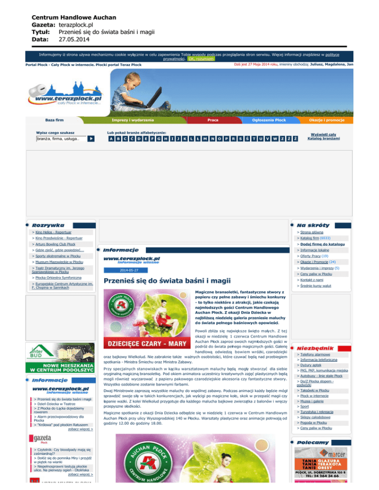 Centrum Handlowe Auchan Gazeta: terazplock.pl Tytu³: Przenie siê do wiata bani i magii Data: 27.05.2014 Informujemy iż strona używa mechanizmu cookie wyłącznie w celu zapewnienia Tobie wygody podczas przeglądania stron serwisu. Więcej informacji znajdziesz w polityce prywatności. OK, rozumiem Dziś jest 27 Maja 2014 roku, imieniny obchodzą: Juliusz, Magdalena, Jan Portal Płock - Cały Płock w internecie. Płocki portal Teraz Płock Baza firm Imprezy i wydarzenia Wpisz czego szukasz branża, firma, usługa.. Praca Lub pokaż branże alfabetycznie: A B C Ć D E F G H Ogłoszenia Płock Okazje i promocje I J K L Ł M N O P R S Ś T U V W Z Ż Ź Wyświetl cały Katalog branżami > Kino Helios - Repertuar > Strona główna > Kino Przedwiośnie - Repertuar > Katalog firm (6533) > Arturo Bowling Club Płock > Dodaj firmę do katalogu > Gdzie zjeść, gdzie posiedzieć... > Informacje lokalne > Sporty ekstremalne w Płocku > Oferty Pracy (19) > Muzeum Mazowieckie w Płocku > Okazje i Promocje (24) > Teatr Dramatyczny im. Jerzego Szaniawskiego w Plocku > Płocka Orkiestra Symfoniczna > Europejskie Centrum Artystyczne im. F. Chopina w Sannikach > Wydarzenia i imprezy (5) 2014-05-27 > Ceny paliw w Płocku Przenieś się do świata baśni i magii > Kontakt z nami > Średnie kursy walut Magiczne bransoletki, fantastyczne stwory z papieru czy pełne zabawy i śmiechu konkursy - to tylko niektóre z atrakcji, jakie czekają najmłodszych gości Centrum Handlowego Auchan Płock. Z okazji Dnia Dziecka w najbliższą niedzielę galeria przeniesie maluchy do świata pełnego baśniowych opowieści. Powoli zbliża się największe święto małych. Z tej okazji w niedzielę 1 czerwca Centrum Handlowe Auchan Płock zaprosi swoich najmłodszych gości w podróż do świata pełnego magicznych gości. Galerię handlową odwiedzą bowiem wróżki, czarodziejki oraz bajkowy Wielkolud. Nie zabraknie także ważnych osobistości, które czuwać będą nad przebiegiem spotkania - Ministra Śmiechu oraz Ministra Zabawy. Przy specjalnych stanowiskach w kąciku warsztatowym maluchy będą mogły stworzyć dla siebie oryginalną magiczną bransoletkę. Pod okiem animatora uczestnicy kreatywnych zajęć plastycznych będą mogli również wyczarować z papieru pakowego czarodziejskie akcesoria czy fantastyczne stwory. Wszystko ozdobione zostanie barwnymi farbami. > Przenieś się do świata baśni i magii > Dzień Dziecka w Teatrze > Z Płocka do Łącka dojedziemy rowerem > Alarm przeciwpowodziowy dla Płocka > "Królowa" pod płockim Ratuszem zobacz więcej > > Czytelnik: Czy bioodpady mają się zaśmiardnąć? > Dołóż się do pomnika Miry i przyjdź w piątek na wianki > Niepełnosprawni testują płockie ulice. Na pierwszy ogień - Otolińska zobacz więcej > > Telefony alarmowe > Informacja telefoniczna > Dyżury aptek > PKS, PKP, komunikacja miejska > Autobusy - linie stałe Płock > Do/Z Płocka stopem podwózki Dwaj Ministrowie zaproszą wszystkie maluchy do wspólnej zabawy. Podczas animacji każdy będzie mógł sprawdzić swoje siły w takich konkurencjach, jak wyścigi po magiczne koło, skok w przepaść magii czy > Taksówki w Płocku łapanie ważki. Z kolei Wielkolud przygotuje dla każdego malucha bajkowe zwierzątka z balonów i wręczy przepyszne słodkości. > Muzea i galerie Magiczne spotkanie z okazji Dnia Dziecka odbędzie się w niedzielę 1 czerwca w Centrum Handlowym > Turystyka i rekreacja Auchan Płock przy ulicy Wyszogrodzkiej 140 w Płocku. Warsztaty plastyczne oraz animacje potrwają od godziny 12.00 do godziny 18.00. > Sklepy całodobowe > Płock w internecie > Sport > Pogoda w Płocku > Ceny paliw w Płocku Centrum Handlowe Auchan Gazeta: terazplock.pl Tytu³: Przenie siê do wiata bani i magii Data: 27.05.2014 > Pogotowie przeciwpowodziowe odwołane > Transport dla osób niepełnosprawnych w dniu wyborów > Płock Orlen Polish Open po raz dwudziesty zobacz więcej > > Mustangi się zmieniają > Anioł wśród nafciarzy > Ergowiosła w "realu" i w Internecie zobacz więcej > > Areszt za spowodowanie obrażeń ciała skutkujących śmiercią > Nietrzeźwa matka przewoziła dziesięcioletnie dziecko do szkoły > I Międzyszkolny Dzień Profilaktyki zobacz więcej > > Serdecznie zapraszamy do piłkarskiego przedszkola > Gramy do końca! > Uczniowie zwiedzali stadion zobacz więcej > > Nafciarze ze srebrem w sezonie 2013/2014 > Zbiórka dla serbskiej Loznicy > 50 lat piłki ręcznej w Płocku wspomnienia Artura Górala i Krzysztofa Kisiela zobacz więcej > Galeria do tej informacji (klknij na miniaturze, aby ją powiększyć): > Prawo strażnika do legitymowania > Uwaga na kolejkę turystyczną i parking przy zoo > Fotradar w maju zobacz więcej > źródło: terazplock.pl < wróć Zobacz również z terazplock.pl: Wiadomości 1 - 10 z 2580 dodano: 2014-05-27 Dzień Dziecka w Teatrze Serdecznie zapraszamy na weekend z bajkami z okazji Dnia Dziecka PODRÓŻE GULIWERA I CUDOWNA LAMPA ALLADYNA 31 maja (sobota), godz. 11.00 i 16.00 PODRÓŻE GULIWERA Gdzieś indziej musi być lepiej. Gdzieś indziej n czytaj więcej > dodano: 2014-05-23 Z Płocka do Łącka dojedziemy rowerem Jeszcze przed wakacjami rowerzystów czeka ważne wydarzenie: połączenie dwóch sieci dróg rowerowych - Płocka i Łącka. Sąsiadująca z Płockiem gmina Łąck zaczęła właśnie budowę brakującego odcinka ścieżki rowerowej wzdłuż d czytaj więcej > dodano: 2014-05-21 Alarm przeciwpowodziowy dla Płocka W związku z osiągnięciem stanów alarmowych na rzece Wiśle, Prezydent Andrzej Nowakowski od godziny 16.00 dnia 21 maja 2014 r. roku, ogłosił alarm przeciwpowodziowy dla Płocka. W rejonie Płocka następuje stabilizacja poziomu wody na Wiśle. czytaj więcej > dodano: 2014-05-21 "Królowa" pod płockim Ratuszem ORLEN Cup 2014 - 4 czerwca godz. 17.00 "To jest wielka frajda i dla nas i dla kibiców" - tak podsumował ubiegłoroczny start w Płocku dwukrotny mistrz olimpijski w pchnięciu kulą
