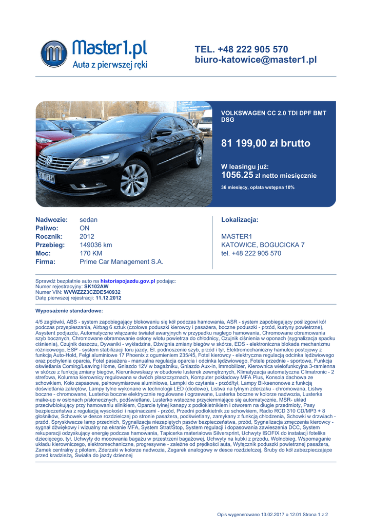TEL. +48 222 905 570 [email protected] VOLKSWAGEN CC 2.0 TDI DPF BMT DSG 81 199,00 zł brutto W leasingu już: 1056.25 zł netto miesięcznie 36 miesięcy, opłata wstępna 10% Nadwozie: Paliwo: Rocznik: Przebieg: Moc: Firma: sedan ON 2012 149036 km 170 KM Prime Car Management S.A. Lokalizacja: MASTER1 KATOWICE, BOGUCICKA 7 tel. +48 222 905 570 Sprawdź bezpłatnie auto na historiapojazdu.gov.pl podając: Numer rejestracyjny: SK102AW Numer VIN: WVWZZZ3CZDE540932 Datę pierwszej rejestracji: 11.12.2012 Wyposażenie standardowe: 4/5 zagłówki, ABS - system zapobiegający blokowaniu się kół podczas hamowania, ASR - system zapobiegający poślizgowi kół podczas przyspieszania, Airbag 6 sztuk (czołowe poduszki kierowcy i pasażera, boczne poduszki - przód, kurtyny powietrzne), Asystent podjazdu, Automatyczne włączanie świateł awaryjnych w przypadku nagłego hamowania, Chromowane obramowania szyb bocznych, Chromowane obramowanie osłony wlotu powietrza do chłodnicy, Czujnik ciśnienia w oponach (sygnalizacja spadku ciśnienia), Czujnik deszczu, Dywaniki - wykładzina, Dźwignia zmiany biegów w skórze, EDS - elektroniczna blokada mechanizmu różnicowego, ESP - system stabilizacji toru jazdy, El. podnoszenie szyb, przód i tył, Elektromechaniczny hamulec postojowy z funkcją Auto-Hold, Felgi aluminiowe 17 Phoenix z ogumieniem 235/45, Fotel kierowcy - elektryczna regulacją odcinka lędźwiowego oraz pochylenia oparcia, Fotel pasażera - manualna regulacja oparcia i odcinka lędźwiowego, Fotele przednie - sportowe, Funkcja oświetlania Coming/Leaving Home, Gniazdo 12V w bagażniku, Gniazdo Aux-in, Immobilizer, Kierownica wielofunkcyjna 3-ramienna w skórze z funkcją zmiany biegów, Kierunkowskazy w obudowie lusterek zewnętrznych, Klimatyzacja automatyczna Climatronic - 2 strefowa, Kolumna kierownicy regulowana w dwóch płaszczyznach, Komputer pokładowy MFA Plus, Konsola dachowa ze schowkiem, Koło zapasowe, pełnowymiarowe aluminiowe, Lampki do czytania - przód/tył, Lampy Bi-ksenonowe z funkcją doświetlania zakrętów, Lampy tylne wykonane w technologii LED (diodowe), Listwa na tylnym zderzaku - chromowana, Listwy boczne - chromowane, Lusterka boczne elektrycznie regulowane i ogrzewane, Lusterka boczne w kolorze nadwozia, Lusterka make-up w osłonach p/słonecznych, podświetlane, Lusterko wsteczne przyciemniające się automatycznie, MSR- układ przeciwblokujący przy hamowaniu silnikiem, Oparcie tylnej kanapy z podłokietnikiem i otworem na długie przedmioty, Pasy bezpieczeństwa z regulacją wysokości i napinaczami - przód, Przedni podłokietnik ze schowkiem, Radio RCD 310 CD/MP3 + 8 głośników, Schowek w desce rozdzielczej po stronie pasażera, podświetlany, zamykany z funkcją chłodzenia, Schowki w drzwiach przód, Spryskiwacze lamp przednich, Sygnalizacja niezapiętych pasów bezpieczeństwa, przód, Sygnalizacja zmęczenia kierowcy sygnał dźwiękowy i wizualny na ekranie MFA, System Strat/Stop, System regulacji i dopasowania zawieszenia DCC, System rekuperacji odzyskujący energię podczas hamowania, Tapicerka materiałowa Silversprint, Uchwyty ISOFIX do instalacji fotelika dziecięcego, tył, Uchwyty do mocowania bagażu w przestrzeni bagażowej, Uchwyty na kubki z przodu, Wolnobieg, Wspomaganie układu kierowniczego, elektromechaniczne, progresywne - zależne od prędkości auta, Wyłącznik poduszki powietrznej pasażera, Zamek centralny z pilotem, Zderzaki w kolorze nadwozia, Zegarek analogowy w desce rozdzielczej, Śruby do kół zabezpieczające przed kradzieżą, Światła do jazdy dziennej Opis wygenerowano 13.02.2017 o 12:01 Strona 1 z 2 Wyposażenie dealerskie: Czujnik odległości przy parkowaniu przód/tył, Komputer pokładowy MFA Premium, Lakier metalik, Lusterka boczne składane elektrycznie z funkcją oświetlenia przestrzeni wokół drzwi, Pakiet 5 miejsc, Przygotowanie do GSM Start z bluetooth + system głośnomówiący dla nawigacji RNS 315, Roleta tylnej szyby - elektryczna, System nawigacji satelitarnej RNS 315 z dotykowym ekranem, pakiet, Szyby tylne dodatkowo przyciemniane, Tempomat, Światła przeciwmgielne z funkcją doświetlania skrętu Master1 to punkt sprzedaży samochodów Masterlease, pierwszego właściciela. Wszystkie auta zostały zakupione w polskim salonie, posiadają wycenę rzeczoznawcy, były regularnie serwisowane podczas użytkowania i posiadają udokumentowaną historię zdarzeń serwisowych. W Master1.pl znajdziecie Państwo szeroki wachlarz ubezpieczeń komunikacyjnych. Nasza oferta skierowana jest zarówno do klientów indywidualnych jak i firm. Wszelkich formalności można dokonać na miejscu. Opis wygenerowano 13.02.2017 o 12:01 Strona 2 z 2