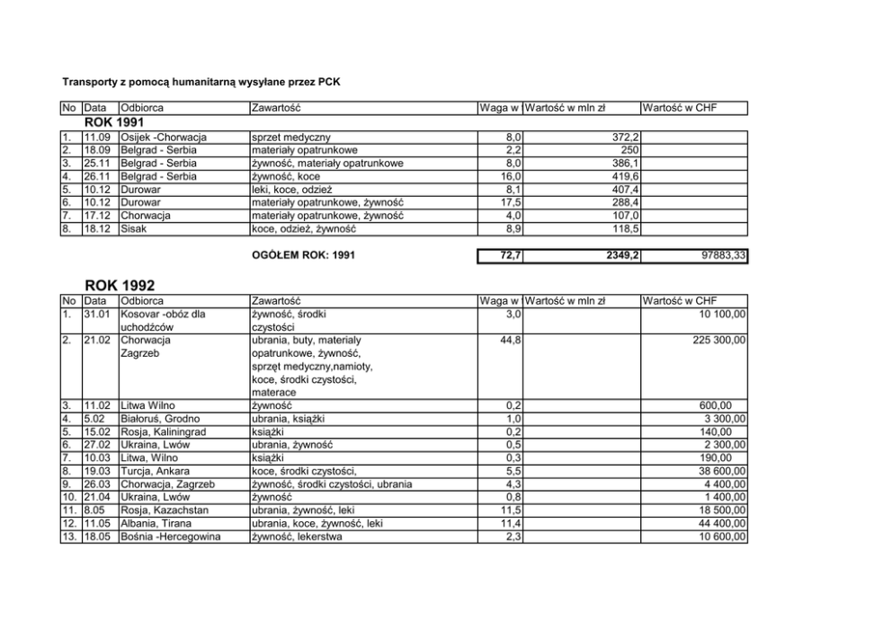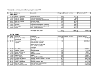 Transporty z pomocą humanitarną wysyłane przez PCK No Data Odbiorca Zawartość Waga w tWartość w mln zł Wartość w CHF ROK 1991 1. 2. 3. 4. 5. 6. 7. 8. 11.09 18.09 25.11 26.11 10.12 10.12 17.12 18.12 Osijek -Chorwacja Belgrad - Serbia Belgrad - Serbia Belgrad - Serbia Durowar Durowar Chorwacja Sisak sprzet medyczny materiały opatrunkowe Ŝywność, materiały opatrunkowe Ŝywność, koce leki, koce, odzieŜ materiały opatrunkowe, Ŝywność materiały opatrunkowe, Ŝywność koce, odzieŜ, Ŝywność 8,0 2,2 8,0 16,0 8,1 17,5 4,0 8,9 372,2 250 386,1 419,6 407,4 288,4 107,0 118,5 OGÓŁEM ROK: 1991 72,7 2349,2 97883,33 ROK 1992 No Data Odbiorca 1. 31.01 Kosovar -obóz dla uchodźców 2. 21.02 Chorwacja Zagrzeb 3. 4. 5. 6. 7. 8. 9. 10. 11. 12. 13. 11.02 5.02 15.02 27.02 10.03 19.03 26.03 21.04 8.05 11.05 18.05 Litwa Wilno Białoruś, Grodno Rosja, Kaliningrad Ukraina, Lwów Litwa, Wilno Turcja, Ankara Chorwacja, Zagrzeb Ukraina, Lwów Rosja, Kazachstan Albania, Tirana Bośnia -Hercegowina Zawartość Ŝywność, środki czystości ubrania, buty, materialy opatrunkowe, Ŝywność, sprzęt medyczny,namioty, koce, środki czystości, materace Ŝywność ubrania, ksiąŜki ksiąŜki ubrania, Ŝywność ksiąŜki koce, środki czystości, Ŝywność, środki czystości, ubrania Ŝywność ubrania, Ŝywność, leki ubrania, koce, Ŝywność, leki Ŝywność, lekerstwa Waga w tWartość w mln zł 3,0 Wartość w CHF 10 100,00 44,8 225 300,00 0,2 1,0 0,2 0,5 0,3 5,5 4,3 0,8 11,5 11,4 2,3 600,00 3 300,00 140,00 2 300,00 190,00 38 600,00 4 400,00 1 400,00 18 500,00 44 400,00 10 600,00 14. 15. 16. 17. 18. 19. 20. 21. 22. 19.05 16.06 29.06 2.07 22.07 4.08 24.08 31.08 21.08 Tuzla Bialoruś, Grodno Litwa, Wilno Chorwacja, Zagrzeb Wyspa Broc Chorwacja, Zagrzeb Rumunia Albania, Tirana Białoruś, Grodno Chorwacja, Zagrzeb sprzęt medyczny sprzęt medyczny, Ŝywność, zestawy TV leki Ŝywność ubrania, Ŝywność leki, Ŝywność Ŝywność, leki, koce, ubrania leki Koce, ubrania, środki opatrunkowe, materace, Ŝywność 23. 28.08 Albania, Tirana leki 24. 26.06 Ukraina, Lwów ubrania, Ŝywność 25. 12.10 Zadar, Mostar B-H Ŝywność 26. 26.10 Albania, Tirana leki 27. 28.10 Albania, Tirana leki 28. 30.10 Albania, Tirana leki 29. 18.11 Rosja, Kazachstan ubrania, leki 30. 18.11 Chorwacja, Slavonski Brod Ŝywność 31. 25.11 Chorwacja, Zagrzeb leki, Ŝywność, ubrania 32. 1.12 Chorwacja, Zadar Ŝywność 33. 13.12 Chorwacja, Osijek Ŝywność, koce, ubrania, leki 34. 30.12 MKCK środki finansowe na glodujące dzieci w Somalii OGÓŁEM 1992 ROK 1993 No 1. 2. 3. 4. 5. 6. 7. 8. Data 9.01 16.02 24.02 3.03 13.03 6.03 19.02 30.03 Odbiorca Chorwacja Chorwacja Chorwacja Rosja Bośnia_Hercegowina Chorwacja Białoruś Białoruś 0,5 4,5 12 20 3,7 3,4 10 2,5 25 1 600,00 46 200,00 185 700,00 11 800,00 8 700,00 214 400,00 91 000,00 43 800,00 104 200,00 12 0,5 12,4 11 12 12 23,8 64,4 5,4 4,8 57 153 400,00 400,00 18 200,00 438 400,00 137 700,00 124 000,00 84 600,00 42 100,00 180 300,00 8 900,00 180 300,00 900 000,00 382,7 74 403,12 3 100 130,00 13 Zawartość koce, poduszki Ŝywność, lekarstwa, mat. budowlane Ŝywność, atykuły higieniczne lekarstwa, materiały opatrunkowe Ŝywność, art. higieniczne sprzet medyczny, koce, odzieŜ, Ŝywność leki leki, odzieŜ, Ŝywność Waga w tWartość w zł Wartość w CHF 1,4 75400,00 5 800,00 54,5 775060,00 59 620,00 30,9 582530,00 44 810,00 13,0 5107700,00 392 900,00 5,2 105430,00 8 110,00 20,0 2096380,00 161 260,00 16 1 584 900,00 106 200,00 15,3 3 076 400,00 205 070,00 9. 10. 11. 12. 13. 14. 15. 16. 17. 18. 19. 20. 9.04 21.03 7.05 6.07 4.08 23.09 12.10 23.08 15.09 10.11 20.11 22.12 Białoruś Jemen, Irak Chorwacja Jemen dla Iraku Litwa Białoruś Federacja dla Indii Ukraina Bośnia -Hercegowina Gruzja Białoruś Albania leki, odzieŜ leki środki czystości, Ŝywność, odzieŜ leki leki koce, leki przelew Ŝywność Ŝywność - słodycze koce, odzieŜ, transport leki koce OGÓŁEM 1993 ROK 1994 No 1. 2. 3. 4. 5. 6. 7. 8. Data 10.01 20.05 12.07 20.07 12.08 12.08 18.01 27.04 9. 10. 11. 12. 13. 14. 15. 16. 02.08 02.02 22.02 17.03 15.06 08.09 03.10 19.12 Odbiorca Hunduras AzerbejdŜan AzerbejdŜan Rwanda Czarnogóra Rwanda Ukraina Chorwacja dla uchodźców z Bośni Sarajewo Białoruś, Pińsk Ukraina, Lubieszów Ukraina, Lubieszów Białoruś, Pińsk Białoruś, Pińsk Mołdowa, Kiszyniów Kazachstan, Karaganda Zawartość wpłata 1000 USD koce koce wpłata 1000 USD leki, ubrania, koce, Ŝywność leki Igły, strzykawki, olej spozywczy, ubrania Ŝywność Ŝywność, środki higieniczne ubrania ubrania Ŝywność ubrania leki, sprzet medyczny, buty gumowe leki, koce leki 9,5 0,1 7,6 0,3 16 4,6 1 0,04 1 0,06 9 242 900,00 76 100,00 645 700,00 36 000,00 6 937 800,00 974 400,00 18200,00 23 900,00 4 700,00 14 800,00 673 000,00 780 000,00 205,5 23831300,00 16 330,00 5 070,00 42 970,00 2 300,00 462 520,00 64 960,00 1 400,00 1 590,00 310,00 970,00 44 860,00 52 000,00 1679050,00 16,485 Waga w tWartość w mln zł Wartość w CHF 21 430,50 1 300,00 4 225 844,50 13 700,00 4 222 217,80 13 480,00 21 430,50 1 300,00 28,6 9 236 380,65 560 290,00 7,6 4 047 397,20 245 520,00 0,8 24 397,80 1 480,00 2,7 76 325,55 4 630,00 10,1 0,5 0,3 1,5 0,5 5,8 7,2 0,2 319 149,60 13 352,85 6 429,15 25 222,05 13 352,85 7 376 542,95 442 292,55 50 114,40 19 360,00 810,00 390,00 1 530,00 810,00 447 470,00 26 830,00 3 040,00 OGÓŁEM ROK 1994 OGÓŁEM LATA 1991 - 1995 73,8 734,7 22 121 880,90 46 029 933,22 1 341 940,00 6 219 003,33 ROK 1995 No 1. 2. 3. 4. Data 16.02 21.03 28.03 19.04 5. 6. 7. 8. 9. 10. 11. 12. 13. 14. 15. 16. 17. 18. 19. 20. 21. 19.04 2.04 14.06 4.08 4.08 21.09 28.09 19.10 26.10 31.10 31.10 31.10 8.11 27.11 24.11 23.11 18.12 Odbiorca Inguszetia dla Czeczenii Ukraina, Kołomyja BiałoruŜ, Brześć Balkaria Zawartość leki sprzet medyczny, odzieŜ, koce leki środki opatrunkowe,obuwie, odzieŜ 1330 kocy MKCK Nalczik 12380 szt. Kocy Litwa, Sołeczniki leki, odzieŜ Kazachstan, Ałma At