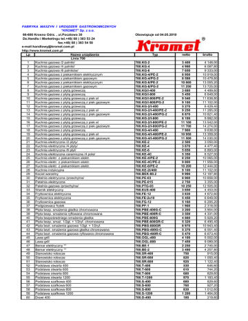 FABRYKA MASZYN I URZĄDZEŃ GASTRONOMICZNYCH "KROMET" Sp. z o.o. 66-600 Krosno Odrz. , ul.Pocztowa 30 Dz.Handlu i Marketingu tel.+48( 68 ) 383 53 24 fax.+48( 68 ) 383 54 58 e-mail:[email protected] http://www.kromet.com.pl Lp Nazwa urządzenia Linia 700 1 Kuchnia gazowa /2 palniki/ 2 Kuchnia gazowa /4 palniki/ 3 Kuchnia gazowa /6 palników/ 4 Kuchnia gazowa z piekarnikiem elektrycznym 5 Kuchnia gazowa z piekarnikiem gazowym 6 Kuchnia gazowa z piekarnikiem elektrycznym 7 Kuchnia gazowa z piekarnikiem gazowym 8 Kuchnia gazowa z płytą grzewczą 9 Kuchnia gazowa z płytą grzewczą 10 Kuchnia gazowa z płytą grzewczą z piek el 11 Kuchnia gazowa z płytą grzewczą z piek gazowym 12 Kuchnia gazowa z płytą grzewczą 13 Kuchnia gazowa z płytą grzewczą z piek el 14 Kuchnia gazowa z płytą grzewczą z piek gazowym 15 Kuchnia gazowa z płytą grzewczą 16 Kuchnia gazowa z płytą grzewczą z piek el 17 Kuchnia gazowa z płytą grzewczą z piek gazowym 18 Kuchnia gazowa z płytą grzewczą 19 Kuchnia gazowa z płytą grzewczą z piek el 20 Kuchnia gazowa z płytą grzewczą z piek gazowym 21 Kuchnia elektryczna /2 płyty/ 22 Kuchnia elektryczna /4 płyty/ 23 Kuchnia elektryczna /6 płyt/ 24 Kuchnia elektryczna ceramiczna /4 pola/ 25 Kuchnia elektr. z piekarnikiem elektr. 26 Kuchnia elektr. z piekarnikiem elektr. 27 Kuchnia elektr. z piekarnikiem elektr. 28 Kuchnia indukcyjna 29 Kocioł warzelny 30 Patelnia elektryczna /przechylna/ 31 Patelnia elektryczna 32 Patelnia gazowa /przechylna/ 33 Warnik elektryczny 34 Frytkownica elektryczna 35 Frytkownica elektryczna 36 Frytkownica gazowa 37 Podgrzewacz frytek 38 Płyta bezp. smażenia gładka chromowana 39 Płyta bezp. smażenia ryflowana chromowana 40 Płyta bezpośredniego smażenia gładka 41 Płyta bezp. smaż. 1/2gł. + 1/2ryf. chromowana 42 Płyta bezt. smażenia gazowa 1/2gł. + 1/2ryf. 43 Płyta bezt. smażenia gazowa gładka chromowana 44 Płyta bezt. smażenia gazowa ryflowana chromowana 45 Lawa grill 46 Lawa grill 47 Bemar elektryczny ** 48 Bemar elektryczny ** 49 Stanowisko robocze 50 Stanowisko robocze 51 Stanowisko robocze 52 Podstawa otwarta 400 53 Podstawa otwarta 600 54 Podstawa otwarta 800 55 Podstawa otwarta 1200 56 Podstawa szafkowa 400 57 Podstawa szafkowa 600 58 Podstawa szafkowa 800 59 Podstawa szafkowa 1200 60 Drzwi 400 Obowiązuje od 04.05.2010 Typ 700.KG-2 700.KG-4 700.KG-6 700.KG-4/PE-2 700.KG-4/PG-2 700.KG-6/PE-2 700.KG-6/PG-2 700.KG/I-400 700.KG/I-800 700.KG/I-800/PE-2 700.KG/I-800/PG-2 700.KG-2/I-400 700.KG-2/I-400/PE-2 700.KG-2/I-400/PG-2 700.KG-2/I-800 700.KG-2/I-800/PE-2 700.KG-2/I-800/PG-2 700.KG-4/I-400 700.KG-4/I-400/PE-2 700.KG-4/I-400/PG-2 700.KE-2 700.KE-4 700.KE-6 700.KE-4C 700.KE-4/PE-2 700.KE-4C/PE-2 700.KE-6/PE-2 700.KE-2i/400 700.BEK-80.2 700.PE-03 700.PE-015 700.PTG-03 700.EUS-400 700.FE-12 700.FE-2x10 700.FG-12 700.PF-1 700.PBE-400G-C 700.PBE-400R-C 700.PBE-600G 700.PBE-600GR-C 700.PBG-800GR 700.PBG-400G-C 700.PBG-400R-C 700.OGL-400 700.OGL-800 700.BE-1 700.BE-2 700.SR-400 700.SR-600 700.SR-800 700.T-400 700.T-600 700.T-800 700.T-1200 700.S-400 700.S-600 700.S-800 700.S-1200 700.D-400 netto brutto 3 400 4 990 7 650 8 950 8 590 10 660 11 250 3 680 5 450 9 540 9 100 5 270 9 250 8 870 8 100 11 100 11 700 7 900 10 950 11 500 2 500 3 670 5 650 5 350 8 250 9 800 10 200 9 100 9 990 8 900 2 750 10 250 3 650 3 830 5 450 5 160 1 900 3 200 3 550 4 860 5 320 8 970 5 370 5 470 4 100 7 450 2 250 3 490 750 820 920 530 610 680 970 680 760 830 1 200 180 4 148,00 6 087,80 9 333,00 10 919,00 10 479,80 13 005,20 13 725,00 4 489,60 6 649,00 11 638,80 11 102,00 6 429,40 11 285,00 10 821,40 9 882,00 13 542,00 14 274,00 9 638,00 13 359,00 14 030,00 3 050,00 4 477,40 6 893,00 6 527,00 10 065,00 11 956,00 12 444,00 11 102,00 12 187,80 10 858,00 3 355,00 12 505,00 4 453,00 4 672,60 6 649,00 6 295,20 2 318,00 3 904,00 4 331,00 5 929,20 6 490,40 10 943,40 6 551,40 6 673,40 5 002,00 9 089,00 2 745,00 4 257,80 915,00 1 000,40 1 122,40 646,60 744,20 829,60 1 183,40 829,60 927,20 1 012,60 1 464,00 219,60 61 62 63 Drzwi 600 Szuflada 400 Szuflada 600 ** Cena nie obejmuje pojemników GN FABRYKA MASZYN I URZĄDZEŃ GASTRONOMICZNYCH "KROMET" Sp. z o.o. 66-600 Krosno Odrz. , ul.Pocztowa 30 Dz.Handlu i Marketingu tel.+48( 68 ) 383 53 24 fax.+48( 68 ) 383 54 58 e-mail:[email protected] http://www.kromet.com.pl Lp 64 65 66 67 68 69 70 71 72 73 74 75 76 77 78 79 80 81 82 83 84 85 86 87 88 89 90 91 92 93 94 95 96 Nazwa urządzenia Linia 900 Kuchnia gazowa /2 palniki/ Kuchnia gazowa /4 palniki/ Kuchnia gazowa /6 palników/ Kuchnia gazowa z piek. el. termoobieg Kuchnia gazowa z piekarnikiem gazowym Kuchnia gazowa z piekarnikiem gazowym Kuchnia gazowa z piek. el. termoobieg Kuchnia elektryczna /2 płyty/ Kuchnia elektryczna /4 płyty/ Kuchnia elektryczna /6 płyt/ Kuchnia elektryczna z piek el termoobieg Kuchnia elektryczna z piek el termoobieg Kocioł warzelny elektryczny Kocioł warzelny elektryczny Kocioł warzelny gazowy Patelnia elektryczna (przechył automatyczny ) Patelnia gazowa (przechył automatyczny) Płyta bezt. smażenia elektr. ryflowana chromowana Płyta bezt. smażenia elektr. gładka chromowana Płyta bezt. smażenia elektr. 1/2gł. + 1/2ryf. Frytownica elektryczna z szafką Frytownica elektryczna z szafką Bemar elektryczny ** Bemar elektryczny ** Stanowisko robocze Stanowisko robocze Podstawa otwarta 450 Podstawa otwarta 900 Podstawa otwarta 1350 Podstawa szafkowa 450 Podstawa szafkowa 900 Podstawa szafkowa 1350 Drzwi 450 ** Cena nie obejmuje pojemników GN 700.D-600 700.Z-400 700.Z-600 210 240 290 256,20 292,80 353,80 obowiązuje od 04.05.2010r. Typ 900.KG-2 900.KG-4 900.KG-6 900.KG-4PE/T 900.KG-4PG 900.KG-6PG 900.KG-6PE/T 900.KE-2 900.KE-4 900.KE-6 900.KE-4PE/T 900.KE-6PE/T 900.BEK-150.2 900.BEK-200 900.BGK-150.1 900.PE-05E 900.PTG-05E 900.PBE-450R-C 900.PBE-450G-C 900.PBE-900GR 900.FE-18 900.FE-2x18 900.BE-1 900.BE-2 900.SR-450 900.SR-900 900.T-450 900.T-900 900.T-1350 900.S-450 900.S-900 900.S-1350 900.D-450 netto 3 520 5 
