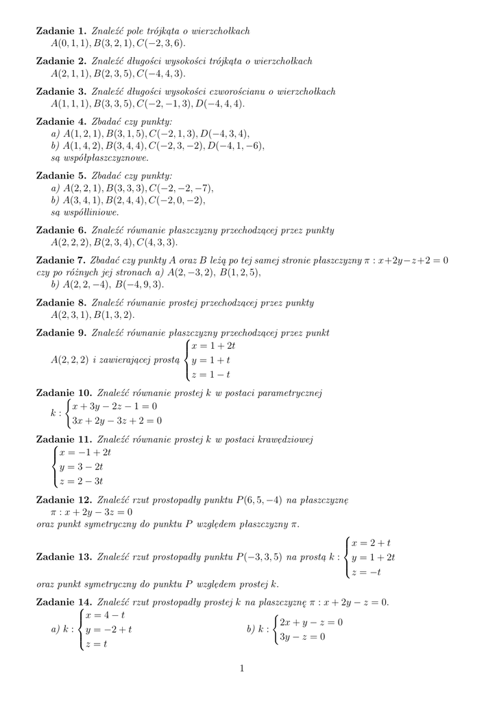 Zadanie 1. Znaleźć pole trójkata o wierzchołkach , A(0, 1, 1), B(3, 2, 1), C(−2, 3, 6). Zadanie 2. Znaleźć długości wysokości trójkata o wierzchołkach , A(2, 1, 1), B(2, 3, 5), C(−4, 4, 3). Zadanie 3. Znaleźć długości wysokości czworościanu o wierzchołkach A(1, 1, 1), B(3, 3, 5), C(−2, −1, 3), D(−4, 4, 4). Zadanie 4. Zbadać czy punkty: a) A(1, 2, 1), B(3, 1, 5), C(−2, 1, 3), D(−4, 3, 4), b) A(1, 4, 2), B(3, 4, 4), C(−2, 3, −2), D(−4, 1, −6), sa, współpłaszczyznowe. Zadanie 5. Zbadać czy punkty: a) A(2, 2, 1), B(3, 3, 3), C(−2, −2, −7), b) A(3, 4, 1), B(2, 4, 4), C(−2, 0, −2), sa, współliniowe. Zadanie 6. Znaleźć równanie płaszczyzny przechodzacej przez punkty , A(2, 2, 2), B(2, 3, 4), C(4, 3, 3). Zadanie 7. Zbadać czy punkty A oraz B leżą po tej samej stronie płaszczyzny π : x+2y−z +2 = 0 czy po różnych jej stronach a) A(2, −3, 2), B(1, 2, 5), b) A(2, 2, −4), B(−4, 9, 3). Zadanie 8. Znaleźć równanie prostej przechodzacej przez punkty , A(2, 3, 1), B(1, 3, 2). Zadanie 9. Znaleźć równanie płaszczyzny przechodzacej przez punkt , x = 1 + 2t A(2, 2, 2) i zawierajacej prosta, y = 1 + t , z =1−t Zadanie ( 10. Znaleźć równanie prostej k w postaci parametrycznej x + 3y − 2z − 1 = 0 k: 3x + 2y − 3z + 2 = 0 Zadanie 11. Znaleźć równanie prostej k w postaci krawedziowej , x = −1 + 2t y = 3 − 2t z = 2 − 3t Zadanie 12. Znaleźć rzut prostopadły punktu P (6, 5, −4) na płaszczyzne, π : x + 2y − 3z = 0 oraz punkt symetryczny do punktu P wzgledem płaszczyzny π. , x = 2 + t Zadanie 13. Znaleźć rzut prostopadły punktu P (−3, 3, 5) na prosta, k : y = 1 + 2t z = −t oraz punkt symetryczny do punktu P wzgledem prostej k. , Zadanie 14. Znaleźć rzut prostopadły prostej k na plaszczyznę π : x + 2y − z = 0. ( x = 4 − t 2x + y − z = 0 a) k : y = −2 + t b) k : 3y − z = 0 z=t 1 Zadanie płaszczyzny zawierajacej proste , 15. Znaleźć równanie x = −t x = 2 + 2u k : y = 1 + t l : y = 1 − 2u z =1−t z = 3 + 2u Zadanie płaszczyzny zawierajacej proste , 16. Znaleźć równanie x = −2t x = 2 + 3u k : y = 1 + t l : y = −u . z =1+t z = 2u Zadanie 17. Znaleźć odległość punktu P (1, 1, 2) od płaszczyzny π : x + y − z + 3 = 0. x = 2 + 3u Zadanie 18. Znaleźć odległość punktu P (5, 1, 3) od prostej l : y = −u . z = 2u Zadanie prosta, , 19. Znaleźć równanie płaszczyzny zawieraj acej x = 2 − t x = 2 −u k : y = 3t i równoległej do prostej l : y = −3u z = −1 − t z = 1 + 2u Zadanie 20. Znaleźć równanie prostej przechodzacej , przez punkt A(1, 1, 1) x = 2 + 2u x = 1 + s l : y = 1 + 2s i przecinajacej proste skośne k : y = u , z = −5 − 3u z =9−s Zadanie 21. Znaleźć współrzedne wierzchołków równoległościanu jeżeli dane sa, równania pro, stych jego , , zawierajacych krawedzie x = 1 + u x = 3 + 2s x = 2 + t k : y = 3u l : y =1−s m: y =2+t z =5−u z =2+s z = −4 + 3t Zadanie prostych skośnych 22. Znaleźć odległość x = 1 + 2s x = 2 − t l : y = 2 − 2s m : y = 2 + t z =2+s z = −4 + 2t Zadanie 23. Znaleźć odległość prostych skośnych ( x = 2 + 3s 4x + y + z = 10 l : y =2+s m: 2x + 2y − z = 5 z =2−s Zadanie 24. Znaleźć kąt między płaszczyznami π1 : x + y + 2z = 0, π2 : −x + 2y + z = 0. x = 2 + 3s Zadanie 25. Znaleźć kąt między płaszczyzną π1 : x + 2y + 2z = 0, i prostą l : y = 1 + s z = −3 − s . Zadanie 26. Dana jest prosta 2x − 3y + 6 = 0. Znaleźć jej równanie w postaci kierunkowej i odcinkowej. 2 Zadanie 27. Przez punkt A(1, −1) poprowadzić prostą odległą od punktu B(5, 2) o 5. Zadanie 28. Dane są równania boków trójkąta 2x − y + 2 = 0, x − y = 0, x + y − 2 = 0. Znaleźć jego obwód. Zadanie 29. Znaleźć równanie prostej przechdzącej przez punkty A(1, 0), B(3, 2). Zadanie 30. Pole trójkąta wynsi 8, a jego dwa wierzchłki to A(1, −2), B(2, 3). Znalaźć trzeci wierzchołek wiedząc, że leży on na prostej 2x + y − 2 = 0. Zadanie 31. Znaleźć równanie prostej przechodzącej przez punkt (2, 3) √ wiedząc, że jej odcinek zawarty między prostymi 3x + 4y − 7 = 0, 3x + 4y + 8 = 0 ma długść 3 2. Zadanie 32. Znaleźć współrzędne środka ciężkości trójkąta o wierzchołkach A(xA , yA ), B(xB , yB ), C(xC , yC ). Zadanie 33. Dane są równania środkowych trójkąta 4x+5y = 0, x−3y = 0 oraz jego wierzchołek (2, −5). Znaleźć równania prostych zawierających boki oraz współrzędne pozostałych wierzchołków. Zadanie 34. Dane są równania prostych zawierających boki trójkąta 3x + y − 3 = 0, 3x + 4y = 0 oraz równanie dwusiecznej kąta wewnętrznego tego trójkąta x−y +5 = 0. Znaleźć równanie prostej zawierającej trzeci bok. 3
