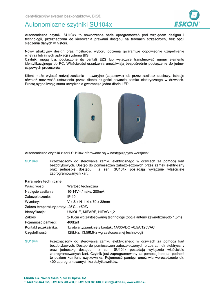 Identyfikacyjny system bezkontaktowy, BIS® Autonomiczne szytniki SU104x Autonomiczne czytniki SU104x to nowoczesna seria oprogramowań pod względem designu i technologii, przeznaczona do kierowania prawami dostępu na terenach strzeŜonych, bez opcji śledzenia danych w historii. Nowy atrakcyjny design oraz moŜliwość wyboru odcienia gwarantuje odpowiednie uzupełnienie wnętrza lub innych aplikacji systemu BIS. Czytniki mogą byś podłączone do centali EZS lub wyłącznie transferować numer elementu identyfikacyjnego do PC. Właściwości urządzenia umoŜliwiają bezpośrednie podłączenie do jednoczipowych procesorów. Klient moŜe wybrać rodzaj zasilania – awaryjne (zapasowe) lub przez zasilacz sieciowy. Istnieje równieŜ moŜliwość ustawienia przez klienta długości otwarcia zamka elektrycznego w drzwiach. Prostą sygnalizację stanu urządzenia gwarantuje jedna dioda LED. Autonomiczne czytniki z serii SU104x oferowane są w następujących wersjach: SU1040 Przeznaczony do sterowania zamku elektrycznego w drzwiach za pomocą kart bezdotykowych. Dostęp do pomieszczeń zabezpieczonych przez zamek elektryczny oraz jednostkę dostępu z serii SU104x posiadają wyłącznie właściciele zaprogramowanych kart. Parametry techniczne: Właściwości Napięcie zasilania: Zabezpieczenie: Wymiary: Zakres temperatury pracy: Identyfikacja: Zakres Pojemność pamięci: Kontakt przekaźnika: Częstotliwość: SU1044 Wartość techniczna 10-14V= /maks. 200mA IP 40 V x S x H 114 x 79 x 38mm -25°C - +50°C UNIQUE, MIFARE, HITAG 1,2 2-10cm wg zastosowanej technologii (opcja anteny zewnętrznej-do 1,5m) 400kart 1x otwarty/zamknięty kontakt 1A/30VDC ~0,5A/125VAC 125kHz, 13,56MHz wg zastosowanej technologii Przeznaczony do sterowania zamku elektrycznego w drzwiach za pomocą kart bezdotykowych. Dostęp do pomieszczeń zabezpieczonych przez zamek elektryczny oraz jednostkę dostępu z serii SU104x posiadają wyłącznie właściciele zaprogramowanych kart. Czytnik jest zaprogramowany za pomocą laptopa, podnosi to poziom komfortu uŜytkownika. Pojemność pamięci umoŜliwia wprowadzenie ok. 400 zaprogramowanych kart/uŜytkowników. ESKON a.s., Vrchní 1568/37, 747 05 Opava, CZ T +420 553 624 055, +420 605 204 488, F +420 553 786 810, E [email protected], www.eskon.eu Identyfikacyjny system bezkontaktowy, BIS® Parametry techniczne: Właściwości Napięcie zasilania: Zabezpieczenie: Wymiary: Zakres temperatury pracy: Identyfikacja: Zakres Pojemność pamięci: Kontakt przekaźnika: Częstotliwość: Parametry linii transferowej: SU1042 Częstotliwość: Parametry linii transferowej: SU1045 Wartość techniczna 10-14V= /maks. 200mA IP 40 V x S x H 114 x 79 x 38mm -25°C - +50°C UNIQUE, MIFARE, HITAG 1,2 2-10cm wg zastosowanej technologii (opcja anteny zewnętrznej -do 1,5m) 125kHz, 13,56MHz wg zastosowanej technologii Wiegand Czytnik SU1043 moŜna wykorzystać do transferu numeru identyfikacyjnego elementu do portu szeregowego PC (RS232) lub do bezpośredniego podłączenie do jednoczipowych procesorów. Parametry techniczne: Właściwości Napięcie zasilania: Zabezpieczenie: Wymiary: Zakres temperatury pracy: Identyfikacja: Zakres RS232 Czytnik SU1042 słuŜy do transferu numeru identyfikacyjnego karty bezdotykowej do urządzenia z interfejsem WIEGAND. Przeznaczony do podłączenie do centrali EZS, EPS oraz innych urządzeń peryferyjnych. Parametry techniczne: Właściwości Napięcie zasilania: Zabezpieczenie: Wymiary: Zakres temperatury pracy: Identyfikacja: Zakres Częstotliwość: Wyjście danych: SU1043 Wartość techniczna 10-14V= /maks. 200mA IP 40 V x S x H 114 x 79 x 38mm -25°C - +50°C UNIQUE, MIFARE, HITAG 1,2 2-10cm wg zastosowanej technologii (opcja anteny zewnętrznej -do 1,5m) 400kart 1x otwarty/zamknięty kontakt 1A/30VDC ~0,5A/125VAC 125kHz, 13,56MHz wg zastosowanej technologii Wartość techniczna 10-14V= /maks. 200mA IP 40 V x S x H 114 x 79 x 38mm -25°C - +50°C UNIQUE, MIFARE, HITAG 1,2 2-10cm wg zastosowanej technologii (opcja anteny zewnętrznej -do 1,5m) 125kHz, 13,56MHz wg zastosowanej technologii RS232 - 9600bps, dane 8 bit, 1 stop bit, bez parzystości Czytnik SU1045 jest stosowany do transferu numeru identyfikacyjnego elementu do urządzenia z interfejsem RS485. ESKON a.s., Vrchní 1568/37, 747 05 Opava, CZ T +420 553 624 055, +420 605 204 488, F +420 553 786 810, E [email protected], www.eskon.eu Identyfikacyjny system bezkontaktowy, BIS® Parametry techniczne: Właściwości Napięcie zasilania: Zabezpieczenie: Wymiary: Zakres temperatury pracy: Identyfikacja: Zakres Częstotliwość: Parametry linii transferowej: SU1046 RS485 - 9600bps, data 8 bit, 1 stop bit, bez parzystości Czytnik oparty na modelu SU1044. Korzystna jest opcja zdalnego programowania oraz odzyskiwania danych po połączeniu z komputerem. Parametry techniczne: Właściwości Napięcie zasilania: Zabezpieczenie: Wymiary: Zakres temperatury pracy: Identyfikacja: Zakres Wartość techniczna 10-14V= /maks. 200mA IP 40 V x S x H 114 x 79 x 38mm -25°C - +50°C UNIQUE, MIFARE, HITAG 1,2 2-10cm wg zastosowanej technologii (opcja anteny zewnętrznej -do 1,5m) 125kHz, 13,56MHz wg zastosowanej technologii Wartość techniczna 10-14V= /maks. 200mA IP 40 V x S x H 114 x 79 x 38mm -25°C - +50°C UNIQUE, MIFARE, HITAG 1,2 2-10cm wg zastosowanej technologii (opcja anteny zewnętrznej - do 1,5m) 1x otwarty/zamknięty kontakt 1A/30VDC ~0,5A/125VAC 125kHz, 13,56MHz wg zastosowanej technologii Kontakt przekaźnika: Częstotliwość: Parametry linii RS485 , 19200bps, data 8 bit, 1 stop bit, bez parzystości transferowej: Ilość dopuszczalnych kart: 400 ( opcja zwiększenia na maks.1600) ESKON a.s., Vrchní 1568/37, 747 05 Opava, CZ T +420 553 624 055, +420 605 204 488, F +420 553 786 810, E [email protected], www.eskon.eu