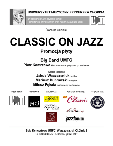 UNIWERSYTET MUZYCZNY FRYDERYKA CHOPINA JM Rektor prof. zw. Ryszard Zimak Prorektor ds. artystycznych prof. nadzw. Klaudiusz Baran Środa na Okólniku CLASSIC ON JAZZ Promocja płyty Big Band UMFC Piotr Kostrzewa kierownictwo artystyczne, prowadzenie Goście specjalni: Jakub Waszczeniuk trąbka Mariusz Dubrawski fortepian Miłosz Pękala instrumenty perkusyjne Organizator: Wydawca: Sponsorzy: Patronat medialny: Sala Koncertowa UMFC, Warszawa, ul. Okólnik 2 12 listopada 2014, środa, godz. 1900 Współpraca: Płyta Classic on Jazz Producent Fundacja Sinfonia Varsovia Co-Producent Piotr Kostrzewa Nagranie i miks Witold Osiński, Marek Lipski, Jakub Zaczkowski Artur Stodolny, Michał Bereza, Klementyna Walczyna Mastering Tadeusz Mieczkowski Projekt graficzny Agata Juszczak Foto Tomasz Światczyński Nagrano w STUDIU S1 Uniwersytetu Muzycznego Fryderyka Chopina w Warszawie – czerwiec 2014 Słowo wstępne Mozart, Beethoven, Czajkowski, Debussy i Ravel to tylko kilku mistrzów w historii muzyki, z twórczości których jazzmani czerpią inspiracje do dziś. Podążając za kolejnymi kompozytorami, zagłębiamy się i odkrywamy piękny świat harmonii i dźwięków, który jest mostem łączącym klasykę i jazz – gatunki na pierwszy rzut oka bardzo odległe. Pomysł na płytę zrodził się w warszawskiej uczelni muzycznej, której misją jest kształcenie wirtuozów muzyki poważnej w każdej z jej dziedzin. Jednakże zawsze pewna część artystów z klasycznym wykształceniem chciała być blisko jazzu, poczuć wolność improwizacji, swobodnej wypowiedzi... Również spora część jazzmanów u szczytu swoich karier sięgała i sięga po klasykę, np. Chick Corea – solista i Bobby McFerrin – dyrygent, którzy wspólne nagrali koncerty Mozarta. Projekt Classic on Jazz jest prezentacją utworów muzyki poważnej opracowanych przez mistrzów tej sztuki z czasów Złotej Ery Swingu, jak i współczesnych aranżerów. „Standardy klasyków” zabrzmią dziś zatem w zaskakujących opracowaniach, wykorzystujących typową dla jazzu orkiestrę czyli big band w swoim klasycznym brzmieniu. Gorąco dziękujemy Fundacji Sinfonia Varsovia za produkcję i finansowe wsparcie płyty, Stowarzyszeniu Muzyków Wykonawców STOART za sponsorowanie tego tak ważnego dla nas projektu oraz Uniwersytetowi Muzycznemu Fryderyka Chopina za możliwość realizacji płyty. Piotr Kostrzewa Big Band UMFC Program Overture to The Nutcracker Suite muz. Piotr Czajkowski (1840–1893) arr. Billy Strayhorn (1915–1967) opracowanie uwertury z Suity Dziadek do orzechów op. 71a (1892) Rhapsody in Blue muz. George Gershwin (1898–1937) arr. Sammy Nestico (ur. 1924) opracowanie Błękitnej rapsodii (1924) My Reverie mel. Claude Debussy (1862–1918) muz. Larry Clinton (1909–1985) arr. Bill Holman (ur. 1927) opracowanie piosenki Larry’ego Clintona z melodią zaczerpniętą z kompozycji Rêverie (ok. 1880) Claude’a Debussy’ego Little Night Music muz. Wolfgang Amadeus Mozart (1756–1791) arr. Mark Taylor (ur. 1961) opracowanie IV części (Rondo. Allegro) z Eine kleine Nachtmusik KV 525 (1787) Pavane for a Dead Princess muz. Maurice Ravel (1875–1937) arr. Wojciech Kostrzewa (ur. 1992) opracowanie Pawany dla zmarłej infantki (1899, 1910) Love Dream muz. Ferenc Liszt (1811–1886) arr. Wojciech Kostrzewa (ur. 1992) opracowanie Liebestraum S. 541/3 (1850) A Fifth of Beethoven muz. Ludwig van Beethoven (1770–1827) arr. Dave Tanner (ur. 1950) opracowanie I części (Allegro con brio) z V Symfonii c-moll op. 67 (1800–1808) Waltz of Flowers from The Nutcracker Suite muz. Piotr Czajkowski (1840–1893) arr. Bill Liston (ur. 1959) opracowanie Walca kwiatów z suity Dziadek do orzechów op. 71a (1892) Lullaby muz. Johannes Brahms (1833–1897) arr. Wojciech Kostrzewa (ur. 1992) opracowanie pieśni Wiegenlied (Guten Abend, gut’ Nacht) op. 49 nr 4 (1867–1868) Dvorak’s Theme muz. Antonín Dvořák (1841–1904) arr. Sammy Nestico (ur. 1924) opracowanie tematu z II części IX Symfonii e-moll „Z nowego świata” op. 95 (1893) Turkish March muz. Wolfgang Amadeus Mozart (1756–1791) arr. Adam Sztaba (ur. 1975) opracowanie III części (Alla turca) z Sonaty fortepianowej A-dur KV 331 (1781–1783) Piotr Kostrzewa Absolwent Akademii Muzycznej im. Fryderyka Chopina w Warszawie. Od 1993 roku jest kotlistą Orkiestry Sinfonia Varsovia, z którą koncertuje w kraju i za granicą w najbardziej prestiżowych salach koncertowych, pod kierunkiem najwybitniejszych dyrygentów, wykonując bogaty repertuar symfoniczny i kameralny. Z orkiestrą tą nagrał dla światowych wytwórni fonograficznych ponad 100 płyt z udziałem wybitnych solistów i dyrygentów. Jako perkusista rozrywkowy współpracował z Ryszardem Rynkowskim, Piotrem Rubikiem, Zbigniewem Namysłowskim, Zygmuntem Kuklą, Janem Stokłosą, Krzesimirem Dębskim, Zbigniewem Zamachowskim, Haliną Frąckowiak. Nagrywał również muzykę do wielu filmów. Jest współzałożycielem powstałej w 2000 roku Fundacji Sinfonia Varsovia, której był członkiem zarządu, następnie wiceprezesem, a od 2007 piastuje urząd jej prezesa. Fundacja ta zajmuje się m.in. promocją orkiestry Sinfonia Varsovia, organizacją jej koncertów i nagrań oraz promowaniem młodych talentów artystycznych. W 2008 roku, wraz z zarządem Fundacji powołał do życia Stypendium Artystyczne im. Franciszka Wybrańczyka – fundatora oraz wieloletniego Prezesa Fundacji, przeznaczone dla wybitnych młodych muzyków – uczniów szkół muzycznych II stopnia regionu mazowieckiego. W Zespole Państwowych Szkół Muzycznych nr 4 im. K. Szymanowskiego jest nauczycielem w klasie perkusji. Od 2007 roku jest opiekunem artystycznym zespołu Szymanowski Big Band, z którym odnosi spektakularne sukcesy. W roku 2012 objął kierownictwo artystyczne Big Bandu Uniwersytetu Muzycznego Fryderyka Chopina. Big Band UMFC Zespół został powołany w 2006 roku z inicjatywy prof. Bogumiła Gadawskiego, kierownika 