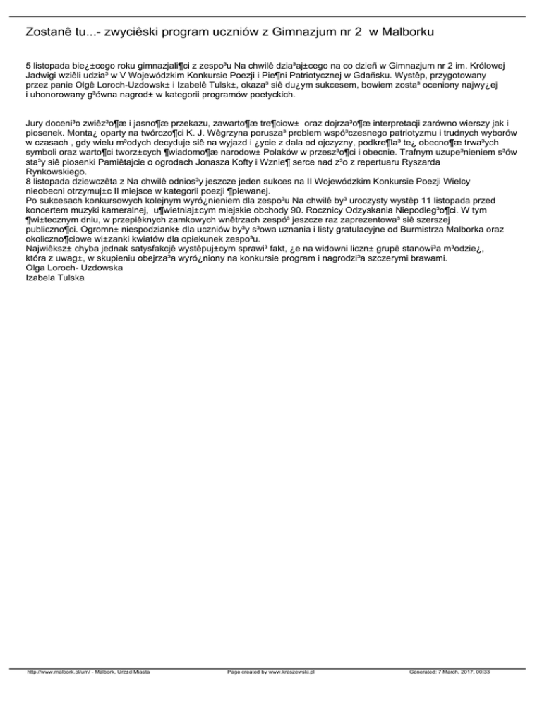 Zostanê tu...- zwyciêski program uczniów z Gimnazjum nr 2 w Malborku 5 listopada bie¿±cego roku gimnazjali¶ci z zespo³u Na chwilê dzia³aj±cego na co dzieñ w Gimnazjum nr 2 im. Królowej Jadwigi wziêli udzia³ w V Wojewódzkim Konkursie Poezji i Pie¶ni Patriotycznej w Gdañsku. Wystêp, przygotowany przez panie Olgê Loroch-Uzdowsk± i Izabelê Tulsk±, okaza³ siê du¿ym sukcesem, bowiem zosta³ oceniony najwy¿ej i uhonorowany g³ówna nagrod± w kategorii programów poetyckich. Jury doceni³o zwiêz³o¶æ i jasno¶æ przekazu, zawarto¶æ tre¶ciow± oraz dojrza³o¶æ interpretacji zarówno wierszy jak i piosenek. Monta¿ oparty na twórczo¶ci K. J. Wêgrzyna porusza³ problem wspó³czesnego patriotyzmu i trudnych wyborów w czasach , gdy wielu m³odych decyduje siê na wyjazd i ¿ycie z dala od ojczyzny, podkre¶la³ te¿ obecno¶æ trwa³ych symboli oraz warto¶ci tworz±cych ¶wiadomo¶æ narodow± Polaków w przesz³o¶ci i obecnie. Trafnym uzupe³nieniem s³ów sta³y siê piosenki Pamiêtajcie o ogrodach Jonasza Kofty i Wznie¶ serce nad z³o z repertuaru Ryszarda Rynkowskiego. 8 listopada dziewczêta z Na chwilê odnios³y jeszcze jeden sukces na II Wojewódzkim Konkursie Poezji Wielcy nieobecni otrzymuj±c II miejsce w kategorii poezji ¶piewanej. Po sukcesach konkursowych kolejnym wyró¿nieniem dla zespo³u Na chwilê by³ uroczysty wystêp 11 listopada przed koncertem muzyki kameralnej, u¶wietniaj±cym miejskie obchody 90. Rocznicy Odzyskania Niepodleg³o¶ci. W tym ¶wi±tecznym dniu, w przepiêknych zamkowych wnêtrzach zespó³ jeszcze raz zaprezentowa³ siê szerszej publiczno¶ci. Ogromn± niespodziank± dla uczniów by³y s³owa uznania i listy gratulacyjne od Burmistrza Malborka oraz okoliczno¶ciowe wi±zanki kwiatów dla opiekunek zespo³u. Najwiêksz± chyba jednak satysfakcjê wystêpuj±cym sprawi³ fakt, ¿e na widowni liczn± grupê stanowi³a m³odzie¿, która z uwag±, w skupieniu obejrza³a wyró¿niony na konkursie program i nagrodzi³a szczerymi brawami. Olga Loroch- Uzdowska Izabela Tulska http://www.malbork.pl/um/ - Malbork, Urz±d Miasta Page created by www.kraszewski.pl Generated: 7 March, 2017, 00:33