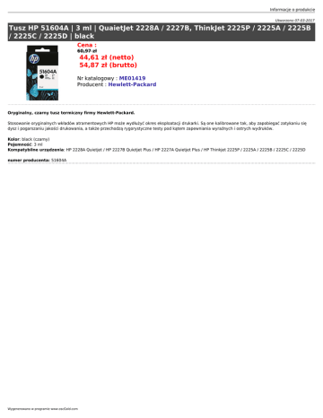 Informacje o produkcie Utworzono 07-03-2017 Tusz HP 51604A | 3 ml | QuaietJet 2228A / 2227B, ThinkJet 2225P / 2225A / 2225B / 2225C / 2225D | black Cena : 60,97 zł 44,61 zł (netto) 54,87 zł (brutto) Nr katalogowy : ME01419 Producent : Hewlett-Packard Oryginalny, czarny tusz termiczny firmy Hewlett-Packard. Stosowanie oryginalnych wkładów atramentowych HP może wydłużyć okres eksploatacji drukarki. Są one kalibrowane tak, aby zapobiegać zatykaniu się dysz i pogarszaniu jakości drukowania, a także przechodzą rygorystyczne testy pod kątem zapewniania wyraźnych i ostrych wydruków. Kolor: black (czarny) Pojemność: 3 ml Kompatybilne urządzenia: HP 2228A Quietjet / HP 2227B Quietjet Plus / HP 2227A Quietjet Plus / HP Thinkjet 2225P / 2225A / 2225B / 2225C / 2225D numer producenta: 51604A Wygenerowano w programie www.oscGold.com