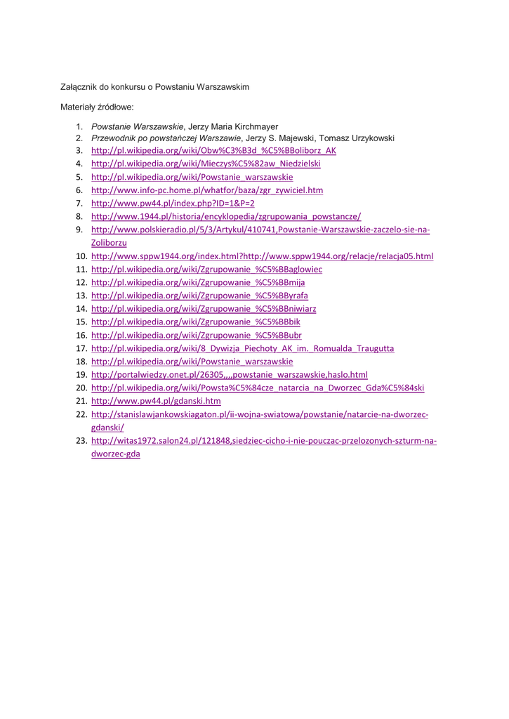 Załącznik do konkursu o Powstaniu Warszawskim Materiały źródłowe: 1. Powstanie Warszawskie, Jerzy Maria Kirchmayer 2. Przewodnik po powstańczej Warszawie, Jerzy S. Majewski, Tomasz Urzykowski 3. 4. 5. 6. 7. 8. 9. 10. 11. 12. 13. 14. 15. 16. 17. 18. 19. 20. 21. 22. 23. http://pl.wikipedia.org/wiki/Obw%C3%B3d_%C5%BBoliborz_AK http://pl.wikipedia.org/wiki/Mieczys%C5%82aw_Niedzielski http://pl.wikipedia.org/wiki/Powstanie_warszawskie http://www.info-pc.home.pl/whatfor/baza/zgr_zywiciel.htm http://www.pw44.pl/index.php?ID=1&P=2 http://www.1944.pl/historia/encyklopedia/zgrupowania_powstancze/ http://www.polskieradio.pl/5/3/Artykul/410741,Powstanie-Warszawskie-zaczelo-sie-naZoliborzu http://www.sppw1944.org/index.html?http://www.sppw1944.org/relacje/relacja05.html http://pl.wikipedia.org/wiki/Zgrupowanie_%C5%BBaglowiec http://pl.wikipedia.org/wiki/Zgrupowanie_%C5%BBmija http://pl.wikipedia.org/wiki/Zgrupowanie_%C5%BByrafa http://pl.wikipedia.org/wiki/Zgrupowanie_%C5%BBniwiarz http://pl.wikipedia.org/wiki/Zgrupowanie_%C5%BBbik http://pl.wikipedia.org/wiki/Zgrupowanie_%C5%BBubr http://pl.wikipedia.org/wiki/8_Dywizja_Piechoty_AK_im._Romualda_Traugutta http://pl.wikipedia.org/wiki/Powstanie_warszawskie http://portalwiedzy.onet.pl/26305,,,,powstanie_warszawskie,haslo.html http://pl.wikipedia.org/wiki/Powsta%C5%84cze_natarcia_na_Dworzec_Gda%C5%84ski http://www.pw44.pl/gdanski.htm http://stanislawjankowskiagaton.pl/ii-wojna-swiatowa/powstanie/natarcie-na-dworzecgdanski/ http://witas1972.salon24.pl/121848,siedziec-cicho-i-nie-pouczac-przelozonych-szturm-nadworzec-gda