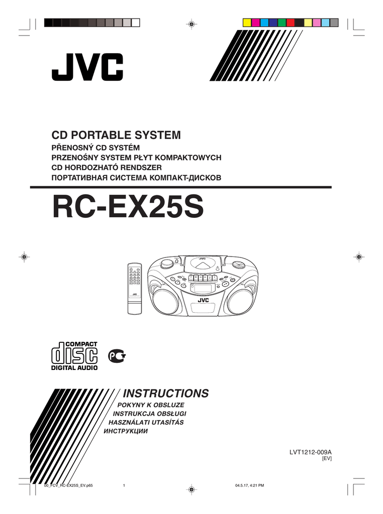 CD PORTABLE SYSTEM PŘENOSNÝ CD SYSTÉM PRZENOŚNY SYSTEM PŁYT KOMPAKTOWYCH CD HORDOZHATÓ RENDSZER ПОРТАТИВНАЯ СИСТЕМА КОМПАКТ-ДИСКОВ RC-EX25S MUTING FM MODE PROGRAM/ CLOCK SET Add"/" HBS/ PRESET EQ PUSH STANDBY/ON DISPLAY CD/ RANDOM TUNER/ BAND TAPE INTRO STOP CD PLAY /PAUSE PRES FM MODE ET TA CD REPEAT/ + HBS/ PRESET EQ + PRESET MUTING VOLUME PE RA CD ND OM – – CD STOP E US /PA REPE AT TUNE R BAND PLAY REMOTE SENSOR DISPLAY RM-SRCEX25A REMOTE CONTROL INSTRUCTIONS POKYNY K OBSLUZE INSTRUKCJA OBSŁUGI HASZNÁLATI UTASÍTÁS ИНСТРУКЦИИ LVT1212-009A [EV] 00_FCV_RC-EX25S_EV.p65 1 04.5.17, 4:21 PM Výstraha upozorněni a jiné Ostrzeżenia i inne informacje Figyelmeztetések, óvintézkedések és egyéb információk Предупреждения, предостережения и другое В соответствии с Законом Российской Федерации “О защите прав потребителей” срок службы (годности) данного товара, “по истечении которого он может представлять опасность для жизни, здоровья потребителя, причинить вред его имуществу или окружающей среде” составляет семь (7) лет со дня производства. Этот срок является временем, в течение которого потребитель данного товара может безопасно им пользоваться при условии соблюдения инструкции по эксплуатации данного товара, проводя необходимое обслуживание, включающее замену расходных материалов и/или соответствующее ремонтное обеспечение в специализированном сервисном центре JVC. Дополнительные косметические материалы к данному товару, поставляемые вместе с ним, могут храниться в течение двух (2) лет со дня его производства. Срок службы (годности), кроме срока хранения дополнительных косметических материалов, упомянутых в предыдущих двух пунктах, не затрагивает никаких других прав потребителя, в частности, гарантийного свидетельства JVC, которое он может получить в соответствии с законом о правах потребителя или других законов, связанных с ним. Upozornění –– tlačítko STANDBY/ON! Přívod proudu zcela odpojíte odpojením síové zástrčky. Tlačítko STANDBY/ON v žádné poloze neodpojuje od sítě. Vigyázat –– STANDBY/ON gomb! A teljes áramtalanításhoz húzza ki a hálózati csatlakozó dugót az aljzatból. A tápfeszültség a STANDBY/ON gomb egyik állásában sem szakad meg. Ostrzeżenie –– przycisk STANDBY/ON! Odłącz przewód zasilania sieciowego aby całkowicie odciąć zasilanie. Przycisk STANDBY/ON w żadnej pozycji nie odłącza od sieci. Внимание –– кнопка STANDBY/ON! Для полного отключения питания отсоедините шнур электропитания. Кнопка STANDBY/ON в любом положении не отключает сеть питания. – G-1 – 01_G1-G2_RC-EX25S_EV.p65 1 04.5.17, 11:44 AM UPOZORNĚNĺ Abyste snížili nebezpečí úrazu elektrickým proudem, požáru, atd.: 1. Nevyšroubovávejte šroubky, nesnímejte kryty ani neotevírejte skříň přístroje. 2. Zařízení nevystavujte dešti nebo vlhkosti. UPOZORNĚNĺ • Nezakrývejte ventilační otvory. V případě, že dojde k zakrytí ventilačních otvorů například novinami, látkou, atd., může dojít k přehřívání zařízení. • Na zařízení nepokládejte otevřený oheň, jako jsou například zapálené svíčky. • Při likvidaci baterií dodržujte místní nařízení týkající se likvidace nebezpečného odpadu. • Toto zařízení nevystavujte dešti, vlhkosti, kapající nebo stříkající vodě a zamezte, vniknutí vody z váz nebo květináčů. Nepokládejte tyto předměty na zařízení. UWAGA Aby ograniczyć ryzyko porażenia prądem, wybuchu pożaru itp.: 1. Nie usuwać wkrętów, osłon ani obudowy. 2. Chronić urządzenie przed deszczem i wilgocią . UWAGA • Nie zasłaniać otworów i szczelin wentylacyjnych. (Zasłonięcie otworów lub szczelin wentylacyjnych gazetą, serwetką itp. może utrudnić odprowadzanie ciepła.) • Nie stawiać na urządzeniu żadnych źródeł otwartego płomienia, takich jak zapalone świece. • Przy wyrzucaniu baterii uwzględnić problemy dotyczące zanieczyszczenia środowiska naturalnego oraz ściśle przestrzegać lokalnych przepisów określających warunki utylizacji takich baterii. • Nie narażać urządzenia na kontakt z deszczem, wilgocią, kapiącą lub rozlaną wodą i nie umieszczać na jego obudowie żadnych przedmiotów wypełnionych płynami, np. wazonów. ÓVINTÉZKEDÉS Áramütés, tűz, stb. veszélyének elkerülése érdekében: 1. Ne távolítson el csavarokat borítólapokat és a készülék burkolatát. 2. Ne tegye ki a készüléket esőnek vagy nedvességnek. ÓVINTÉZKEDÉS • Ne zárja el a szellőző nyílásokat és lyukakat. (Ha a szellőző nyílásokat és lyukakat újságpapír vagy szövet, stb. takarja, a hő esetleg nem tud távozni.) • Ne helyezzen a készülékre semmiféle nyílt lángot, pl. égő gyertyát. • Amikor az elemek elhasználódnak, a környezetvédelem szempontjait figyelembe kell venni és a ha