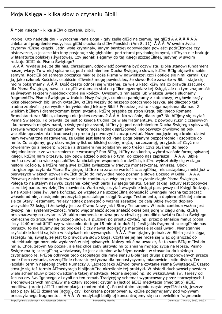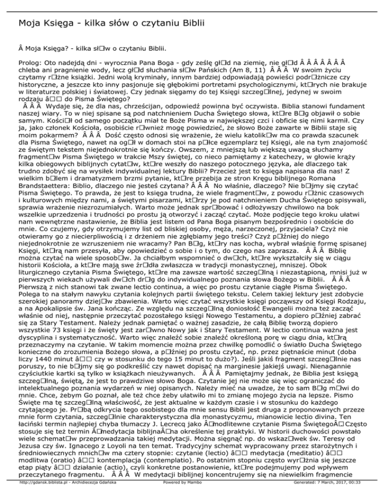 Moja Księga - kilka słów o czytaniu Biblii  Moja Księga? - kilka słÃłw o czytaniu Biblii. Prolog: Oto nadejdą dni - wyrocznia Pana Boga - gdy ześlę głÃłd na ziemię, nie głÃłd        chleba ani pragnienie wody, lecz głÃłd słuchania słÃłw Pańskich (Am 8, 11)    W swoim życiu czytamy rÃłżne książki. Jedni wolą kryminały, innym bardziej odpowiadają powieści podrÃłżnicze czy historyczne, a jeszcze kto inny pasjonuje się głębokimi portretami psychologicznymi, ktÃłrych nie brakuje w literaturze polskiej i światowej. Czy jednak sięgamy do tej Księgi szczegÃłlnej, jedynej w swoim rodzaju – do Pisma Świętego?    Wydaje się, że dla nas, chrześcijan, odpowiedź powinna być oczywista. Biblia stanowi fundament naszej wiary. To w niej spisane są pod natchnieniem Ducha Świętego słowa, ktÃłre BÃłg objawił o sobie samym. KościÃłł od samego początku miał te Boże Pisma w największej czci i obficie się nimi karmił. Czy ja, jako członek Kościoła, osobiście rÃłwnież mogę powiedzieć, że słowo Boże zawarte w Biblii staje się moim pokarmem?    Dość często odnosi się wrażenie, że wielu katolikÃłw ma co prawda szacunek dla Pisma Świętego, nawet na ogÃłł w domach stoi na pÃłłce egzemplarz tej Księgi, ale na tym znajomość ze świętym tekstem niejednokrotnie się kończy. Owszem, z mniejszą lub większą uwagą słuchamy fragmentÃłw Pisma Świętego w trakcie Mszy świętej, co nieco pamiętamy z katechezy, w głowie krąży kilka obiegowych biblijnych cytatÃłw, ktÃłre weszły do naszego potocznego języka, ale dlaczego tak trudno zdobyć się na wysiłek indywidualnej lektury Biblii? Przecież jest to księga napisana dla nas! Z wielkim bÃłlem i dramatyzmem brzmi pytanie, ktÃłre przebija ze stron Kręgu biblijnego Romana Brandstaettera: Biblio, dlaczego nie jesteś czytana?    No właśnie, dlaczego? Nie bÃłjmy się czytać Pisma Świętego. To prawda, że jest to księga trudna, że wiele fragmentÃłw, z powodu rÃłżnic czasowych i kulturowych między nami, a świętymi pisarzami, ktÃłrzy je pod natchnieniem Ducha Świętego spisywali, sprawia wrażenie niezrozumiałych. Warto może jednak sprÃłbować i odłożywszy chwilowo na bok wszelkie uprzedzenia i trudności po prostu ją otworzyć i zacząć czytać. Może podjęcie tego kroku ułatwi nam wewnętrzne nastawienie, że Biblia jest listem od Pana Boga pisanym bezpośrednio i osobiście do mnie. Co czujemy, gdy otrzymujemy list od bliskiej osoby, męża, narzeczonej, przyjaciela? Czyż nie otwieramy go z niecierpliwością i z drżeniem nie zgłębiamy jego treści? Czyż pÃłźniej do niego niejednokrotnie ze wzruszeniem nie wracamy? Pan BÃłg, ktÃłry nas kocha, wybrał właśnie formę spisanej Księgi, ktÃłrą nam przesyła, aby opowiedzieć o sobie i o tym, do czego nas zaprasza.    Biblię można czytać na wiele sposobÃłw. Ja chciałbym wspomnieć o dwÃłch, ktÃłre wykształciły się w ciągu historii Kościoła, a ktÃłre mają swe źrÃłdła zwłaszcza w tradycji monastycznej, mniszej. Obok liturgicznego czytania Pisma Świętego, ktÃłre ma zawsze wartość szczegÃłlną i niezastąpioną, mnisi już w pierwszych wiekach używali dwÃłch drÃłg do indywidualnego poznania słowa Bożego w Biblii.    Pierwszą z nich stanowi tak zwane lectio continua, a więc po prostu czytanie ciągłe Pisma Świętego. Polega to na stałym nawyku czytania kolejnych partii świętego tekstu. Celem takiej lektury jest zdobycie szerokiej panoramy dziejÃłw zbawienia. Warto więc czytać wszystkie księgi począwszy od Księgi Rodzaju, a na Apokalipsie św. Jana kończąc. Ze względu na szczegÃłlną doniosłość Ewangelii można też zacząć właśnie od niej, następnie przeczytać pozostałego księgi Nowego Testamentu, a dopiero pÃłźniej zabrać się za Stary Testament. Należy jednak pamiętać o ważnej zasadzie, że całą Biblię tworzą dopiero wszystkie 73 księgi i że święty jest zarÃłwno Nowy jak i Stary Testament. W lectio continua ważna jest dyscyplina i systematyczność. Warto więc znaleźć sobie znaleźć określoną porę w ciągu dnia, ktÃłrą przeznaczymy na czytanie. W takim momencie można przez chwilkę pomodlić o światło Ducha Świętego konieczne do zrozumienia Bożego słowa, a pÃłźniej po prostu czytać, np. przez piętnaście minut (doba liczy 1440 minut – czy w stosunku do tego 15 minut to dużo?). Jeśli jakiś fragment szczegÃłlnie nas poruszy, to nie bÃłjmy się go podkreślić czy nawet dopisać na marginesie jakiejś uwagi. Nienagannie czyściutkie kartki są tylko w książkach nieużywanych.    Pamiętajmy jednak, że Biblia jest księgą szczegÃłlną, świętą, że jest to prawdziwe słowo Boga. Czytanie jej nie może się więc ograniczać do intelektualnego poznania wydarzeń w niej opisanych. Należy mieć na uwadze, że to sam BÃłg mÃłwi do mnie. Chce, żebym Go poznał, ale też chce żeby ułatwiło mi to zmianę mojego życia na lepsze. Pismo Święte ma tę szczegÃłlną właściwość, że jest aktualne w każdym czasie i w stosunku do każdego czytającego je. PrÃłbą odkrycia tego osobistego dla mnie sensu Biblii jest druga z proponowanych przeze mnie form czytania, szczegÃłlnie charakterystyczna dla monastycyzmu, mianowicie lectio divina. Ten łaciński termin najlepiej chyba tłumaczy J. Lecrecq jako «modlitewne czytanie Pisma Świętego». Często stosuje się też termin «medytacja biblijna» na określenie tej praktyki. W historii duchowości powstało wiele schematÃłw przeprowadzania takiej medytacji. Można sięgnąć np. do wskazÃłwek św. Teresy od Jezusa czy św. Ignacego z Loyoli na ten temat. Tradycyjny schemat wypracowany przez starożytnych i średniowiecznych mnichÃłw ma cztery stopnie: czytanie (lectio) – medytacja (meditatio) – modlitwa (oratio) – kontemplacja (contemplatio). Po osta