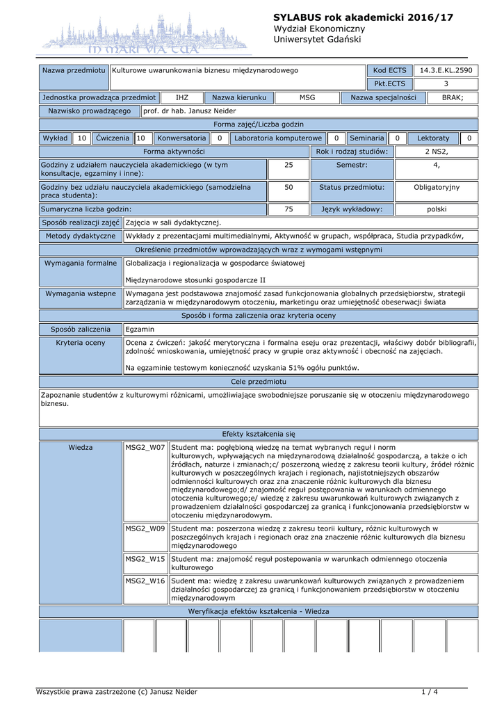 SYLABUS rok akademicki 2016/17 Wydział Ekonomiczny Uniwersytet Gdański Nazwa przedmiotu Kulturowe uwarunkowania biznesu międzynarodowego Jednostka prowadząca przedmiot Nazwisko prowadzącego IHZ Nazwa kierunku MSG Kod ECTS 14.3.E.KL.2590 Pkt.ECTS 3 Nazwa specjalności BRAK; prof. dr hab. Janusz Neider Forma zajęć/Liczba godzin Wykład 10 Ćwiczenia 10 Konwersatoria 0 Laboratoria komputerowe Forma aktywności 0 Seminaria 0 Lektoraty Rok i rodzaj studiów: 2 NS2, Godziny z udziałem nauczyciela akademickiego (w tym konsultacje, egzaminy i inne): 25 Semestr: 4, Godziny bez udziału nauczyciela akademickiego (samodzielna praca studenta): 50 Status przedmiotu: Obligatoryjny Sumaryczna liczba godzin: 75 Język wykładowy: polski 0 Sposób realizacji zajęć Zajęcia w sali dydaktycznej. Metody dydaktyczne Wykłady z prezentacjami multimedialnymi, Aktywność w grupach, współpraca, Studia przypadków, Określenie przedmiotów wprowadzających wraz z wymogami wstępnymi Wymagania formalne Globalizacja i regionalizacja w gospodarce światowej Międzynarodowe stosunki gospodarcze II Wymagania wstepne Wymagana jest podstawowa znajomość zasad funkcjonowania globalnych przedsiębiorstw, strategii zarządzania w międzynarodowym otoczeniu, marketingu oraz umiejętność obeserwacji świata Sposób i forma zaliczenia oraz kryteria oceny Sposób zaliczenia Kryteria oceny Egzamin Ocena z ćwiczeń: jakość merytoryczna i formalna eseju oraz prezentacji, właściwy dobór bibliografii, zdolność wnioskowania, umiejętność pracy w grupie oraz aktywność i obecność na zajęciach. Na egzaminie testowym konieczność uzyskania 51% ogółu punktów. Cele przedmiotu Zapoznanie studentów z kulturowymi różnicami, umożliwiające swobodniejsze poruszanie się w otoczeniu międzynarodowego biznesu. Efekty kształcenia się Wiedza MSG2_W07 Student ma: pogłębioną wiedzę na temat wybranych reguł i norm kulturowych, wpływających na międzynarodową działalność gospodarczą, a także o ich źródłach, naturze i zmianach;c/ poszerzoną wiedzę z zakresu teorii kultury, źródeł różnic kulturowych w poszczególnych krajach i regionach, najistotniejszych obszarów odmienności kulturowych oraz zna znaczenie różnic kulturowych dla biznesu międzynarodowego;d/ znajomość reguł postępowania w warunkach odmiennego otoczenia kulturowego;e/ wiedzę z zakresu uwarunkowań kulturowych związanych z prowadzeniem działalności gospodarczej za granicą i funkcjonowania przedsiębiorstw w otoczeniu międzynarodowym. MSG2_W09 Student ma: poszerzona wiedzę z zakresu teorii kultury, różnic kulturowych w poszczególnych krajach i regionach oraz zna znaczenie różnic kulturowych dla biznesu międzynarodowego MSG2_W15 Student ma: znajomość reguł postepowania w warunkach odmiennego otoczenia kulturowego MSG2_W16 Sudent ma: wiedzę z zakresu uwarunkowań kulturowych związanych z prowadzeniem działalności gospodarczej za granicą i funkcjonowaniem przedsiębiorstw w otoczeniu międzynarodowym Weryfikacja efektów kształcenia - Wiedza Wszystkie prawa zastrzeżone (c) Janusz Neider 1/4 SYLABUS rok akademicki 2016/17 Wydział Ekonomiczny Uniwersytet Gdański Efekty MSG2_W07 X MSG2_W09 X X X MSG2_W15 MSG2_W16 Umiejętności X X X X MSG2_U02 Student potrafi: wykorzystać wiedzę teoretyczną w praktyce, w odniesieniu do funkcjonowania podmiotów gospodarczych na rynku międzynarodowym w różnym otoczeniu kulturowym MSG2_U07 Student potrafi: analizować i porównywać różne kultury organizacyjne MSG2_U12 Student potrafi: zrozumieć znaczenie i złożoność uwarunkowań kulturowych MSG2_U13 Student potrafi: wyciągać wnioski dotyczące własnych zachowań na podstawie poznanych klasyfikacji i charakterystyki kultur MSG2_U14 Student potrafi: przedstawić własne rozwiązania problemów związanych z funkcjonowaniem przedsiębiorstwa w konkretnym otoczeniu kulturowym, w oparciu o dostepne materiały i pozyskaną wiedzę Weryfikacja efektów kształcenia - Umiejętności Efekty MSG2_U02 MSG2_U07 MSG2_U12 MSG2_U13 MSG2_U14 Kompetencje MSG2_K03 Student potrafi: dostrzec i docenić rangę oraz znaczenie róznorodności kulturowych MSG2_K04 Student potrafi: odnaleźć sie w biznesie realizowanym w globalnym otoczeniu społeczno-kulturowym MSG2_K07 Student potrafi: umiejętnie identyfikować i rozstrzygać problemy pojawiające się w obcym otoczeniu kulturowym Weryfikacja efektów kształcenia - Kompetencje Efekty MSG2_K03 X MSG2_K04 MSG2_K07 X X X Treści programowe 1. Uwarunkowania kulturowe w działalności międzynarodowej przedsiębiorstw: a/ podstawowe obszary wykorzystania znajomości różnic kulturowych, wskaźnik kulturowy, tolerancja kulturowa, zdobywanie umiejętności komunikacji międzykulturowej, idea porozumienia międzykulturowego, bariery komunikacji międzynarodowej; b/ definicje i zakres kultury narodowej, wybrane klasyfikacje kultury, globalizacja i regionalizacja kultury, homogenizacja Wszystkie prawa zastrzeżone (c) Janusz Neider 2/4 SYLABUS rok akademicki 2016/17 Wydział Ekonomiczny Uniwersytet Gdański potrzeb konsumentów i heterogeniczność kulturowa; c/macDonaldyzacja,konwergencja i dywergencja kulturowa. 2. Stereotypy kulturowe: a/ istota i przyczyny powstawania stereotypów, stereotypy a uprzedzenia, etnocentryzm; b/ dyskryminacja ze względu na różnice kulturowe, etapy zapoznawania się z inną kulturą. 3. Różnice kulturowe a różnorodność jednostkowa: a/ czynniki określające indywidualne różnice w osobowości, kultura a osobowość; b/ uwarunkowania zachowywania się jednostki, znaczenie osobowości w biznesie. 4. Koncepcja podejścia do czasu: a/ znaczenie czasu dla funkcjonowania jednostki, postrzeganie czasu przez przedstawicieli różnych kultur; b/ kultury polichroniczne i monochroniczne, rola czasu w biznesie. 5. Znaczenie płci w kulturach narodowych: a/ społeczne role kobiet i mężczyzn, różnice w postrzeganiu płci w różnych kulturach, dyskr