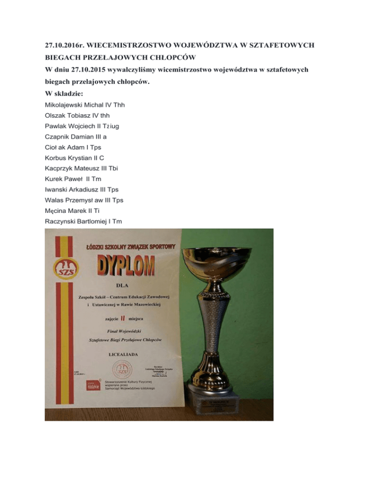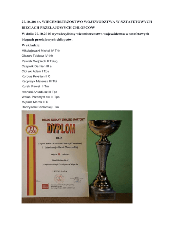 27.10.2016r. WIECEMISTRZOSTWO WOJEWÓDZTWA W SZTAFETOWYCH BIEGACH PRZEŁAJOWYCH CHŁOPCÓW W dniu 27.10.2015 wywalczyliśmy wicemistrzostwo województwa w sztafetowych biegach przelajowych chłopców. W skladzie: Mikolajewski Michal IV Thh Olszak Tobiasz IV thh Pawlak Wojciech II Tż iug Czapnik Damian III a Cioł ak Adam I Tps Korbus Krystian II C Kacprzyk Mateusz III Tbi Kurek Paweł II Tm Iwanski Arkadiusz III Tps Walas Przemysł aw III Tps Męcina Marek II Ti Raczynski Bartlomiej I Tm