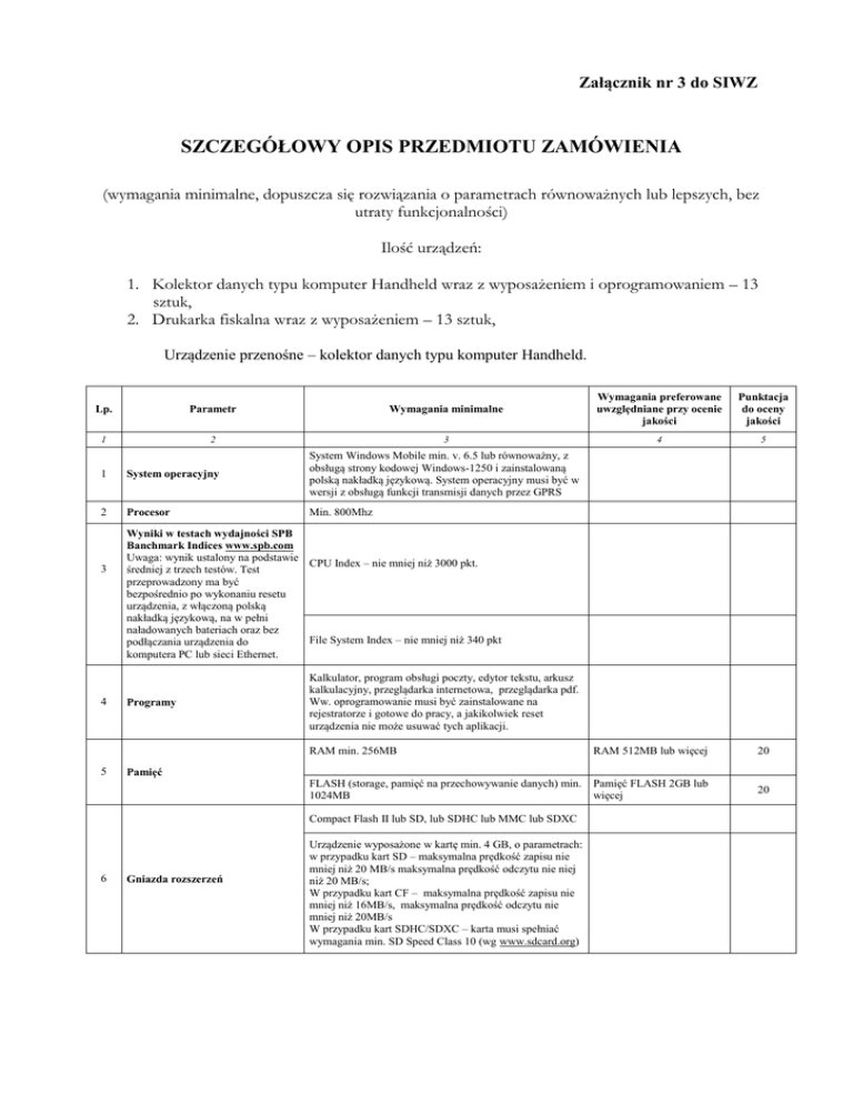 Załącznik nr 3 do SIWZ SZCZEGÓŁOWY OPIS PRZEDMIOTU ZAMÓWIENIA (wymagania minimalne, dopuszcza się rozwiązania o parametrach równoważnych lub lepszych, bez utraty funkcjonalności) Ilość urządzeń: 1. Kolektor danych typu komputer Handheld wraz z wyposażeniem i oprogramowaniem – 13 sztuk, 2. Drukarka fiskalna wraz z wyposażeniem – 13 sztuk, Urządzenie przenośne – kolektor danych typu komputer Handheld. Lp. Parametr 1 2 Wymagania minimalne Wymagania preferowane uwzględniane przy ocenie jakości Punktacja do oceny jakości 3 4 5 1 System operacyjny System Windows Mobile min. v. 6.5 lub równoważny, z obsługą strony kodowej Windows-1250 i zainstalowaną polską nakładką językową. System operacyjny musi być w wersji z obsługą funkcji transmisji danych przez GPRS 2 Procesor Min. 800Mhz 3 4 5 Wyniki w testach wydajności SPB Banchmark Indices www.spb.com Uwaga: wynik ustalony na podstawie CPU Index – nie mniej niż 3000 pkt. średniej z trzech testów. Test przeprowadzony ma być bezpośrednio po wykonaniu resetu urządzenia, z włączoną polską nakładką językową, na w pełni naładowanych bateriach oraz bez File System Index – nie mniej niż 340 pkt podłączania urządzenia do komputera PC lub sieci Ethernet. Programy Pamięć Kalkulator, program obsługi poczty, edytor tekstu, arkusz kalkulacyjny, przeglądarka internetowa, przeglądarka pdf. Ww. oprogramowanie musi być zainstalowane na rejestratorze i gotowe do pracy, a jakikolwiek reset urządzenia nie może usuwać tych aplikacji. RAM min. 256MB RAM 512MB lub więcej 20 FLASH (storage, pamięć na przechowywanie danych) min. 1024MB Pamięć FLASH 2GB lub więcej 20 Compact Flash II lub SD, lub SDHC lub MMC lub SDXC 6 Gniazda rozszerzeń Urządzenie wyposażone w kartę min. 4 GB, o parametrach: w przypadku kart SD – maksymalna prędkość zapisu nie mniej niż 20 MB/s maksymalna prędkość odczytu nie niej niż 20 MB/s; W przypadku kart CF – maksymalna prędkość zapisu nie mniej niż 16MB/s, maksymalna prędkość odczytu nie mniej niż 20MB/s W przypadku kart SDHC/SDXC – karta musi spełniać wymagania min. SD Speed Class 10 (wg www.sdcard.org) Producent musi posiadać w ofercie przejściówkę do podłączenia portu RS232 (DB9-męski) lub możliwość zastosowania portu RS232 w stacji dokującej (DB9-męski). Do potwierdzenia oferent musi przedstawić specyfikację techniczną takiego rozwiązania wraz z oświadczeniem o dostępności takiego urządzenia na żądanie odbiorcy, przez cały czas obowiązywania okresu gwarancji. 7 Porty WE/WY 8 Wyprowadzony bezpośrednio na zewnątrz obudowy urządzenia lub stacji dokującej port USB HOST wraz z kablem USB lub kabel podłączany bezpośrednio do urządzenia z wyprowadzeniem USB Zintegrowany Bluetooth class II v.2.x (umożliwiający jednoczesną bezkolizyjną pracę. innych urządzeń radiowych tj. WiFi, GSM/GPRS, GPS ). Wbudowany moduł WiFi. Wbudowany moduł GSM/GPRS umożliwiający zastosowanie karty SIM dowolnego operatora sieci komórkowej działającego w Polsce Port Ethernet 10/100Base T (RJ45) dostępny w stacji dokującej lub dostępny za pomocą przejściówki do stacji dokującej. Wbudowany moduł GPS lub A-GPS z wyłączoną nawigacją statyczną SN (wyłączona funkcja zamrażania pozycji dot. chipsetu SIRF III ). Wsparcie dla protokołu NMEA0183. Obsługa differential GPS – WAAS/EGNOS Wspieranie protokołu IPv6 5 9 Wbudowany GPS 10 Wyświetlacz Kolorowy, podświetlany ekran dotykowy FULL VGA min. Wyłączenie funkcji ekranu 3,5" min. 480*640 lub min. 640*480 pix dotykowego za pomocą Możliwość wyłączenia ekranu dotykowego kombinacji klawiszy. 10 11 Klawiatura Minimum 50 klawiszy, wydzielona alfanumeryczna, multifunkcyjna, z oddzielnymi klawiszami numerycznymi, umożliwiająca wprowadzanie polskich znaków ( w standardzie polski programisty). Możliwość „miękkiego” resetu urządzenia poprzez klawiaturę urządzenia lub funkcje ekranu dotykowego (bez kasowanie pamięci RAM). Możliwość włączania i wyłączania wirtualnej klawiatury z poziomu systemu Klawisze kierunkowe (góra, dół, prawo, lewo) ułożone bezpośrednio obok siebie w układzie krzyżowym 10 12 Dźwięk Głośnik i mikrofon Wbudowany w baterię wskaźnik naładowania baterii 10 Ładowalna bateria główna o największej oferowanej przez producenta pojemności. Bateria nie może zwiększać wymiarów urządzenia Ładowarka sieciowa. Producent musi posiadać w ofercie ładowarkę samochodową podłączaną bezpośrednio do rejestratora lub za pomocą przejściówki . Do potwierdzenia oferent musi przedstawić specyfikację techniczną takiego rozwiązania wraz z oświadczeniem o dostępności takiego urządzenia na żądanie odbiorcy, przez cały czas obowiązywania okresu gwarancji. 13 Zasilanie 14 Masa Maksymalnie 655g z baterią i wszystkimi wymaganymi wewnętrznymi modułami (kartami) 15 Warunki pracy Wytrzymałość na 5 upadków (dowolną płaszczyzną i krawędzią urządzenia) na gładki beton z wysokości 1.8 m, temperatura pracy -20 o+50oC, spełnienie stopnia ochrony min.IP67 wg PN-92/E-08106 lub IEC529 16 Akcesoria Pasek na rękę (zabezpieczający przed wypadaniem z ręki), dwa rysiki do ekranu, folia ochronna na ekran ( folia antyodblaskowa ) Certyfikaty Urządzenie musi spełniać wszelkie obowiązujące w Polsce wymagania dla tego typu urządzeń, w szczególności określone w Rozporządzeniu Ministra Gospodarki z dnia 27 marca 2007 r. w sprawie szczegółowych wymagań ograniczenia wykorzystywania w sprzęcie elektronicznym i elektrycznym niektórych substancji mogących negatywnie oddziaływać na środowisko, Rozporządzeniu Ministra Gospodarki z dnia 21 sierpnia 2007 r. w sprawie zasadniczych wymagań dla sprzętu elektrycznego (Dziennik Ustaw Nr 155 Poz. 1089), Ustawie z dnia 30 sierpnia 2002 r. o systemie oceny zgodności (Dziennik Ustaw 2004 nr 204 poz. 2087). Urządzenie musi spełniać standardy ROHS Compilant . Spełni