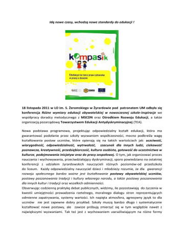 Idą nowe czasy, wchodzą nowe standardy do edukacji ! 18 listopada 2011 w LO im. S. Żeromskiego w Żyrardowie pod patronatem UM odbyła się konferencja Różne wymiary edukacji obywatelskiej w nowoczesnej szkole-inspiracje we współpracy doradcy metodycznego z MSCDN oraz Ośrodkiem Rozwoju Edukacji, a także organizacją pozarządową Towarzystwem Edukacji Antydyskryminacyjnej (TEA). Nowa podstawa programowa, projektując odpowiedzialny kształt edukacji, która ma gwarantowad podołanie przez szkoły wyzwaniom współczesności, mocno podkreśla wagę kształtowania postaw uczniów, które opierają się na takich wartościach jak: uczciwośd, wiarygodnośd, odpowiedzialnośd, wytrwałośd, szacunek dla innych ludzi, ciekawośd poznawcza, kreatywnośd, przedsiębiorczośd, kultura osobista, gotowośd do uczestnictwa w kulturze, podejmowania inicjatyw oraz do pracy zespołowej. O tym, jak organizowad proces nauczania i wychowywania, przeciwdziałający dyskryminacji, sporo powiedziano na ostatniej konferencji z udziałem żyrardowskich nauczycieli różnych poziomów-od przedszkola do liceum. Każdy odpowiedzialny nauczyciel dzieci i młodzieży rozumie, że dla gwarancji rozwoju społecznego bardzo ważne jest kształtowanie postawy obywatelskiej uczniów, postawy poszanowania tradycji i kultury własnego narodu, a także postawy poszanowania dla innych kultur i tradycji oraz wszelkich odmienności. Obserwując codzienną praktykę debat publicznych, widzimy, ile pozostawiają do życzenia w kwestii umiejętności prowadzenia rzetelnego, moralnego dialogu stron reprezentujących odmienne zapatrywania, systemy wartości. Ich napięta atmosfera, agresywny język to dla uczniów nie jest zapewne dobry przykład. Szkoły muszą bardzo długo i systematycznie kształtowad nowe postawy, ale zawsze próbują zmierzyd się w tym względzie nawet z największymi wyzwaniami. Tak też jest z wychowaniem uwrażliwiającym na różne formy dyskryminacji i towarzyszących jej zachowao. Szkoły jednak nie muszą w tym działaniu byd samotnymi wyspami! Wiele instytucji i organizacji pozarządowych wspiera nowoczesny rozwój edukacji, dostarczając im inspiracji i gotowych wzorów w różnych mało obecnych do tej pory w formalnym kształceniu obszarach. Jedną z takich instytucji jest Ośrodek Rozwoju Edukacji(wcześniej CODN). To właśnie jego publikacje ( zarówno w wersji drukowanej jak i elektronicznej do pobrania w bibliotece cyfrowej ORE ) mogą stad się przedmiotem refleksji nauczycieli, którzy podejmą się tworzenia autorskich koncepcji różnego rodzaju zajęd sprzyjających kształtowaniu postaw otwartych na porozumienie. Możliwe do pozyskania podczas konferencji materiały, takie jak poradniki Kompasik (przekazane nauczycielom nieodpłatnie przez dyrektora ORE ) i Kompas dostarczają gotowych narzędzi pomocnych w edukowaniu najmłodszych i starszych dzieci oraz młodzieży w zakresie tak poważnych tematów jak wartości i problemy społeczne, bo szkoła nie istnieje w próżni społecznej i musi odpowiedzialnie uwrażliwiad na np., wykluczanie wynikające z biedy i przeciwdziaład dyskryminacji w tym obszarze. Prezentowane w tych podręcznikach pomysły nauczania i kształtowania postaw Uwzględniają różnego rodzaju możliwości, które stwarzają uczniom i uczennicom warunki do aktywnego uczestnictwa w zajęciach, a co najważniejsze są dostosowane do ich wieku, nauczycielom zaś dostarczają ciekawych inspiracji, jak i gotowych sprawdzonym wzorów metodycznych. Konferencja służyła zbudowaniu u osób odpowiedzialnych za realizację podstawy programowej przekonania, że nowocześnie pojmowana edukacja obywatelska powinna byd organizowania na wszystkich szczeblach, żeby szkoły mogły podoład wyzwaniu przygotowania swoich podopiecznych do wrażliwego i odpowiedzialnego od najmłodszego wieku uczestnictwa w życiu społecznym wspólnot. Podkreślano podczas spotkania wartośd łączenia tej edukacji z problematyką dyskryminacji. Prelegentki przekonywały o tym, że sprzyja ona osiąganiu wielu celów ważnych z perspektywy zadao zawartych w podstawie programowej oraz może stad się swoistym treningiem antyprzemocowym, a więc buduje środowisko bezpieczne i przyjazne dla rozwoju dzieci i młodzieży. Adresatami konferencji byli nauczyciele, pedagodzy, animatorzy inicjatyw obywatelskich, a także księża katecheci różnych poziomów nauczania, ponieważ organizacji spotkania towarzyszyło przekonanie, że tylko współodpowiedzialnośd wychowawców na wszystkich szczeblach edukacji może przynieśd pozytywne rezultaty. Konferencję uświetnił udział wiceprezydenta Grzegorza Obłękowskiego oraz wicedyrektora LO im. Stefana Żeromskiego. Edukatorkami były osoby od wielu lat zajmujące się budowaniem właściwych warunków dla upowszechniania kultury bez przemocy-redaktor polskiego wydania Kompasika, obecny kierownik MSCDN- Warszawa Katarzyna Koszewska oraz Prezeska Towarzystwa Edukacji Antydyskryminacyjnej(TEA) Marta Rawłuszko autorka kilku ważnych w poruszanym temacie publikacji. Pierwsza z nich, prezentując założenia poradnika Kompasik, odpowiadała na pytanie Dlaczego trzeba uczyd małe dzieci praw człowieka ? Prezentacja doradczyni metodycznej- Bożeny Gąsiorowskiej- polecała uczestnikom udostępniane oficjalnie w zasobach Internetu wersje elektroniczne kilku poradników zawierających bogatą ofertę dwiczeo, warsztatów, projektów możliwych do realizacji na różnych szkolnych poziomach, a dotyczących poruszanych na konferencji kwestii. Trzeciemu wystąpieniu, opartemu na raporcie dotyczącym systemu nauczania dzieci i młodzieży oraz kształcenia i doskonalenia nauczycieli z perspektywy przeciwdziałania dyskryminacji, towarzyszyło wiele emocji. Nauczyciele, przed którymi raport i wymogi podstawy programowej stawiają nowe zadania wychowawcze, mieli wiele wątpliwości, pytao. Wyrażali swój niepokój, co do zasadności pewnych dotychczasowych sz
