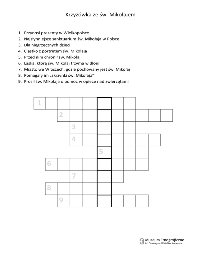 Krzyżówka ze św. Mikołajem 1. 2. 3. 4. 5. 6. 7. 8. 9. Przynosi prezenty w Wielkopolsce Najsłynniejsze sanktuarium św. Mikołaja w Polsce Dla niegrzecznych dzieci Ciastko z portretem św. Mikołaja Przed nim chronił św. Mikołaj Laska, którą św. Mikołaj trzyma w dłoni Miasto we Włoszech, gdzie pochowany jest św. Mikołaj Pomagały im „skrzynki św. Mikołaja” Prosił św. Mikołaja o pomoc w opiece nad zwierzętami 1 2 3 4 5 6 7 8 9