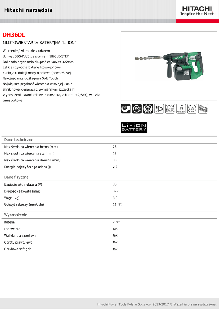 Hitachi narzędzia DH36DL MŁOTOWIERTARKA BATERYJNA "LI-ION" Wiercenie / wiercenie z udarem Uchwyt SDS-PLUS z systemem SINGLE-STEP Dokonała ergonomia długość całkowita 322mm Lekkie i żywotne baterie litowo-jonowe Funkcja redukcji mocy o połowę (Power/Save) Rękojeść anty-poślizgowa Soft Touch Największa prędkość wiercenia w swojej klasie Silnik nowej generacji z wymiennymi szczotkami Wyposażenie standardowe: ładowarka, 2 baterie (2,6Ah), walizka transportowa Dane techniczne Max średnica wiercenia beton (mm) 26 Max średnica wiercenia stal (mm) 13 Max średnica wiercenia drewno (mm) 30 Energia pojedyńczego udaru (J) 2,8 Dane fizyczne Napięcie akumulatora (V) 36 Długość całkowita (mm) 322 Waga (kg) 3,9 Uchwyt roboczy (mm/cale) 26 (1") Wyposażenie Bateria 2 szt. Ładowarka tak Walizka transportowa tak Obroty prawo/lewo tak Obudowa soft grip tak Hitachi Power Tools Polska Sp. z o.o. 2013-2017 © Wszelkie prawa zastrzeżone.