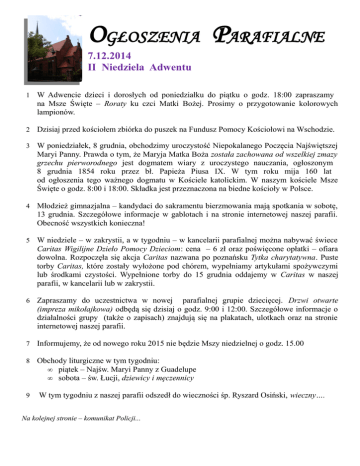 OGŁOSZENIA PARAFIALNE 7.12.2014 II Niedziela Adwentu 1 W Adwencie dzieci i dorosłych od poniedziałku do piątku o godz. 18:00 zapraszamy na Msze Święte – Roraty ku czci Matki Bożej. Prosimy o przygotowanie kolorowych lampionów. 2 Dzisiaj przed kościołem zbiórka do puszek na Fundusz Pomocy Kościołowi na Wschodzie. 3 W poniedziałek, 8 grudnia, obchodzimy uroczystość Niepokalanego Poczęcia Najświętszej Maryi Panny. Prawda o tym, że Maryja Matka Boża została zachowana od wszelkiej zmazy grzechu pierworodnego jest dogmatem wiary z uroczystego nauczania, ogłoszonym 8 grudnia 1854 roku przez bł. Papieża Piusa IX. W tym roku mija 160 lat od ogłoszenia tego ważnego dogmatu w Kościele katolickim. W naszym kościele Msze Święte o godz. 8:00 i 18:00. Składka jest przeznaczona na biedne kościoły w Polsce. 4 Młodzież gimnazjalna – kandydaci do sakramentu bierzmowania mają spotkania w sobotę, 13 grudnia. Szczegółowe informacje w gablotach i na stronie internetowej naszej parafii. Obecność wszystkich konieczna! 5 W niedziele – w zakrystii, a w tygodniu – w kancelarii parafialnej można nabywać świece Caritas Wigilijne Dzieło Pomocy Dzieciom: cena – 6 zł oraz poświęcone opłatki – ofiara dowolna. Rozpoczęła się akcja Caritas nazwana po poznańsku Tytka charytatywna. Puste torby Caritas, które zostały wyłożone pod chórem, wypełniamy artykułami spożywczymi lub środkami czystości. Wypełnione torby do 15 grudnia oddajemy w Caritas w naszej parafii, w kancelarii lub w zakrystii. 6 Zapraszamy do uczestnictwa w nowej parafialnej grupie dziecięcej. Drzwi otwarte (impreza mikołajkowa) odbędą się dzisiaj o godz. 9:00 i 12:00. Szczegółowe informacje o działalności grupy (także o zapisach) znajdują się na plakatach, ulotkach oraz na stronie internetowej naszej parafii. 7 Informujemy, że od nowego roku 2015 nie będzie Mszy niedzielnej o godz. 15.00 8 Obchody liturgiczne w tym tygodniu: • piątek – Najśw. Maryi Panny z Guadelupe • sobota – św. Łucji, dziewicy i męczennicy 9 W tym tygodniu z naszej parafii odszedł do wieczności śp. Ryszard Osiński, wieczny…. Na kolejnej stronie – komunikat Policji... Komisariat Policji Poznań – Jeżyce Wydział Prewencji ul. Kochanowskiego 16, 60-846 Poznań Ksiądz Proboszcz Parafii pw. Podwyższenia Krzyża Świętego ul. Szamarzewskiego 3, 60-514 Poznań W z związku uprzejmą ze prośbą, aby zbliżającym Ksiądz się okresem Proboszcz świąteczno-noworocznym, zapoznał swoich parafian z zwracam n/w się informacją na ogłoszeniach parafialnych parafii: Czas Świąt Bożego Narodzenia oraz okres noworoczny to dla wszystkich okres wzmożonych zakupów i przebywania w miejscach, gdzie znajdują się duże skupiska ludzi. W związku z powyższym zwracamy się do Państwa, a zwłaszcza osób starszych, z prośbą o wzmożoną uwagę w centrach handlowych, na targowiskach, ciągach ruchliwych ulic oraz w środkach komunikacji publicznej. Prosimy, aby jeśli to możliwe, nie nosić przy sobie dużej ilości gotówki, pieniądze trzymać w bezpiecznym- wiadomym tylko dla nas osobiście miejscu. Zwracamy również uwagę na osoby, które oferują różnego rodzaju usługi, m.in. wymiana drzwi, liczników wody i gazu oraz na pracowników różnych instytucji. Ostrzegamy też o oszustach oferujących Państwu opłatki wigilijne, okolicznościowe kartki pocztowe oraz ludzi proszących o dobrowolne datki dla swoich rodzin. Przypominamy również o tym, aby nie pożyczać pieniędzy osobom nieznanym, podającym się za członków naszej rodziny np. za wnuczka, kuzyna. Proszę nie wpuszczać ich do domu, a ewentualną rozmowę przeprowadzić przed wejściem do mieszkania. W przypadku podejrzenia próby wyłudzenia pieniędzy przez oszustów prosimy bezzwłocznie powiadomić policję. Pamiętajmy, że złodzieje i oszuści nie szanują okresu świątecznego, a nasza nieuwaga może dać im szanse na łatwe wzbogacenie się. NIE DAJCIE SIĘ ZASKOCZYĆ!