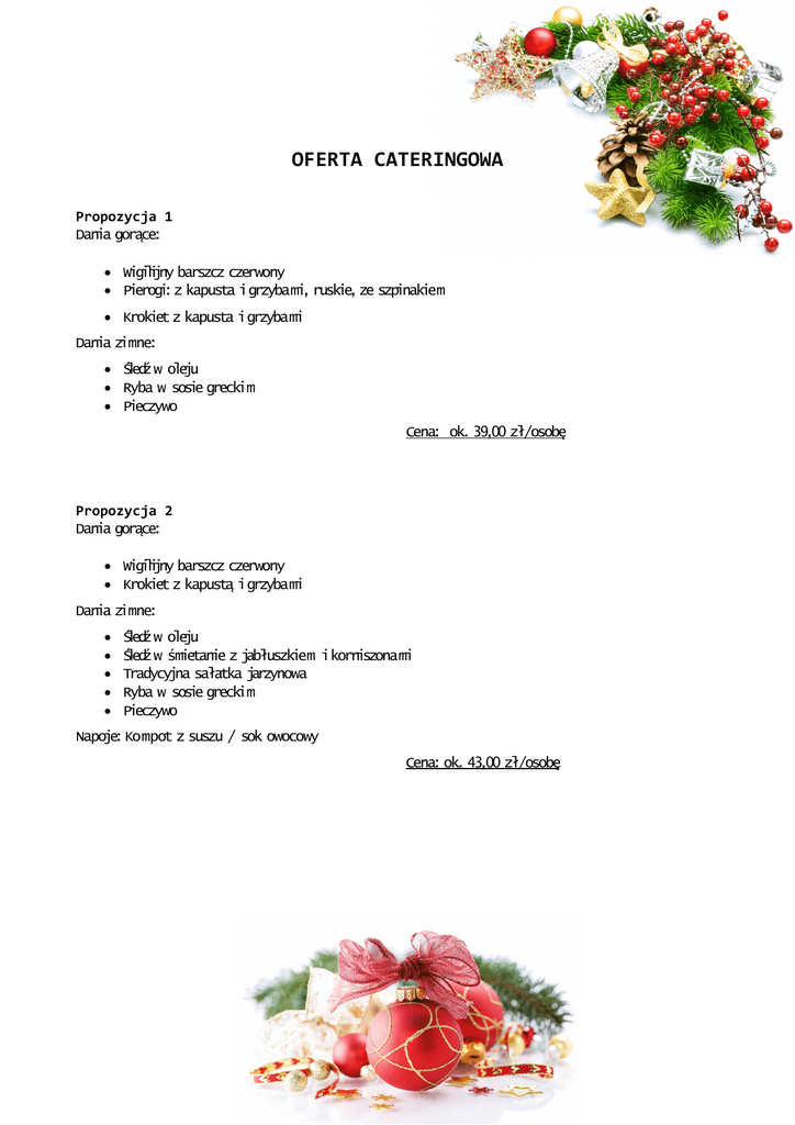 OFERTA CATERINGOWA Propozycja 1 Dania gorące: Wigilijny barszcz czerwony Pierogi: z kapusta i grzybami, ruskie, ze szpinakiem Krokiet z kapusta i grzybami Dania zimne: Śledź w oleju Ryba w sosie greckim Pieczywo Cena: ok. 39,00 zł/osobę Propozycja 2 Dania gorące: Wigilijny barszcz czerwony Krokiet z kapustą i grzybami Dania zimne: Śledź w oleju Śledź w śmietanie z jabłuszkiem i korniszonami Tradycyjna sałatka jarzynowa Ryba w sosie greckim Pieczywo Napoje: Kompot z suszu / sok owocowy Cena: ok. 43,00 zł/osobę Propozycja 3 Dania gorące: Wigilijny barszcz czerwony Pierogi z kapustą i grzybami Filet z dorsza panierowany Ziemniaczki opiekane z tymiankiem Kapusta z pieczarkami na masełku Danie zimne: Śledź z cebulką w oleju Śledź z cebulką i jabłuszkiem w śmietanie Ciasta: Sernik, makowiec Napoje : Kompot z suszu/ woda mineralna/ sok Cena: ok. 60,00 zł/osobę Propozycja 4 Dania gorące: Wigilijny barszcz czerwony Paszteciki: z mięsem, ze szpinakiem, z kapustą Pierogi z kapustą i grzybami / pierogi ruskie Dania zimne: Śledź w oleju Sałatka żydowska Ryba w sosie greckim Pieczywo Ciasta: sernik, makowiec, szarlotka Napoje zimne: Kompot z suszu, sok owocowy Cena: ok.56,00 zł/osobę Propozycja 5 Dania gorące: Wigilijny barszcz czerwony Pierogi: ruskie, z kapustą i grzybami, ze szpinakiem Krokiet z kapustą i grzybami Karp smażony / Łosoś z pieca Dania zimne: Śledź w oleju Śledź w śmietanie z jabłuszkiem i korniszonami Sałatka jarzynowa Pieczywo Deser: Ciasto: sernik, szarlotka Kutia Napoje: Kompot z suszu, woda mineralna z plastrami cytryny Cena: ok.67,00 zł/osobę Propozycja 6 Dania gorące: Wigilijny barszcz czerwony z uszkami Pierogi: z kapustą i grzybami ,ruskie Filet z łososia z pieca z delikatnym sosem koperkowym / Karp smażony Dodatki: • ziemniaczki opiekane w ziołach • sałatka z kapusty czerwonej z jabłuszkiem, • chrzan Dania zimne: Śledź w oleju Śledź w śmietanie Pieczywo Ciasta: sernik, makowiec Napoje: Kompot z suszu, woda mineralna z plastrami cytryny Cena: ok. 69,00 zł/osobę Propozycja 7 Dania gorące: Wigilijny barszcz czerwony Krokiet z kapusta i grzybami Dania zimne: Kanapki dekoracyjne z szynką, śledzikiem, pieczenią, serem, garnirowane pastami i warzywami kruche wytrawne babeczki z pasztetem i żurawiną / z sałatką Ciasta: sernik, makowiec Napoje: Sok owocowy, woda mineralna Cena: ok. 39,00 zł/osobę Powyższe propozycje to tylko nasze sugestie. Jeśli nie spełniają Państwa oczekiwań prosimy o kontakt w celu przygotowania oferty według Państwa życzeń. Zapraszamy do kontaktu: tel: 071/344 26 75, tel/fax: 071/343 20 05, kom: 0 501 007 498, e-mail:[email protected] Zawsze rzetelnie i wyczerpująco udzielimy wszelkich informacji i odpowiemy na każde pytanie. Życzymy Państwu Wesołych Świąt