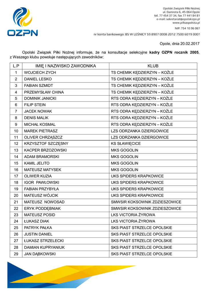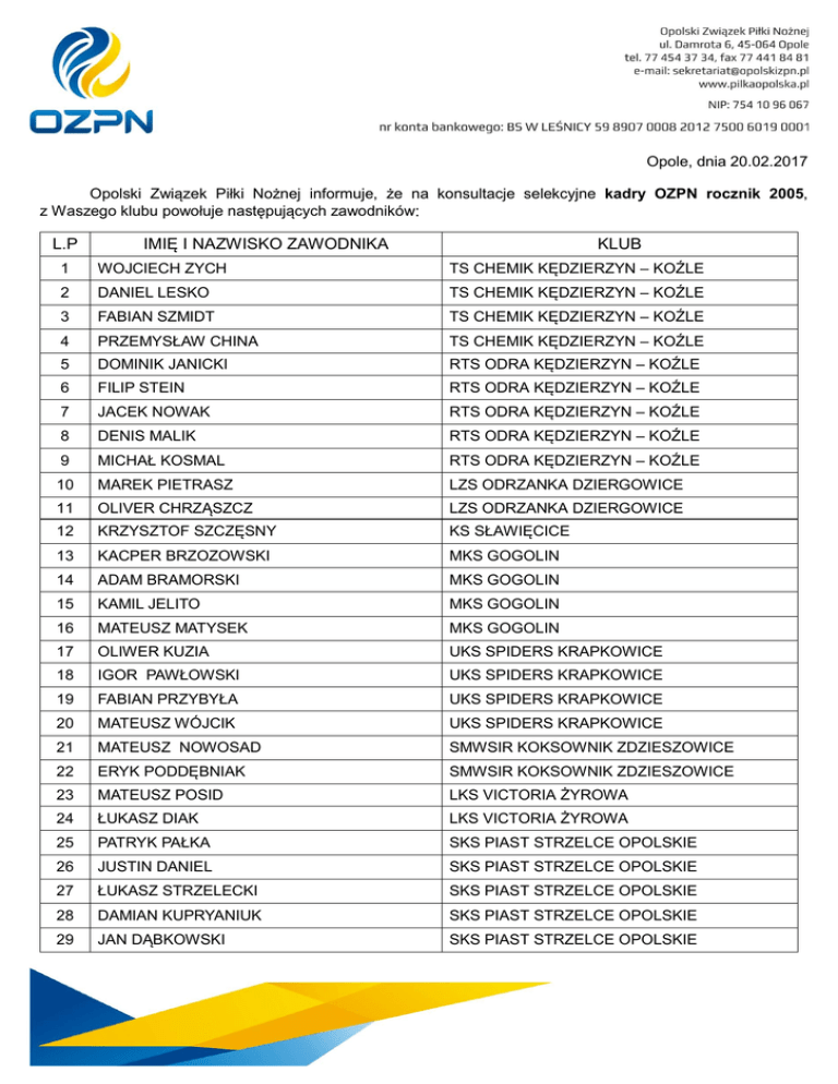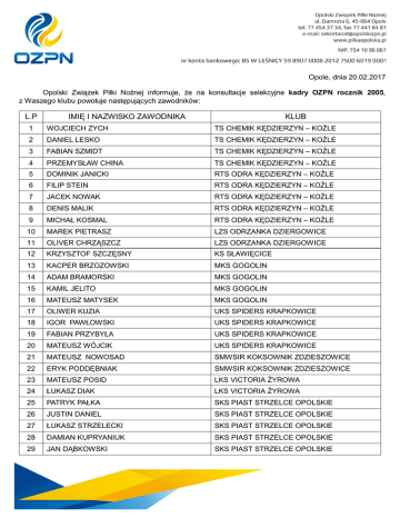 Opole, dnia 20.02.2017 Opolski Związek Piłki Nożnej informuje, że na konsultacje selekcyjne kadry OZPN rocznik 2005, z Waszego klubu powołuje następujących zawodników: L.P IMIĘ I NAZWISKO ZAWODNIKA KLUB 1 WOJCIECH ZYCH TS CHEMIK KĘDZIERZYN – KOŹLE 2 DANIEL LESKO TS CHEMIK KĘDZIERZYN – KOŹLE 3 FABIAN SZMIDT TS CHEMIK KĘDZIERZYN – KOŹLE 4 PRZEMYSŁAW CHINA TS CHEMIK KĘDZIERZYN – KOŹLE 5 DOMINIK JANICKI RTS ODRA KĘDZIERZYN – KOŹLE 6 FILIP STEIN RTS ODRA KĘDZIERZYN – KOŹLE 7 JACEK NOWAK RTS ODRA KĘDZIERZYN – KOŹLE 8 DENIS MALIK RTS ODRA KĘDZIERZYN – KOŹLE 9 MICHAŁ KOSMAL RTS ODRA KĘDZIERZYN – KOŹLE 10 MAREK PIETRASZ LZS ODRZANKA DZIERGOWICE 11 OLIVER CHRZĄSZCZ LZS ODRZANKA DZIERGOWICE 12 KRZYSZTOF SZCZĘSNY KS SŁAWIĘCICE 13 KACPER BRZOZOWSKI MKS GOGOLIN 14 ADAM BRAMORSKI MKS GOGOLIN 15 KAMIL JELITO MKS GOGOLIN 16 MATEUSZ MATYSEK MKS GOGOLIN 17 OLIWER KUZIA UKS SPIDERS KRAPKOWICE 18 IGOR PAWŁOWSKI UKS SPIDERS KRAPKOWICE 19 FABIAN PRZYBYŁA UKS SPIDERS KRAPKOWICE 20 MATEUSZ WÓJCIK UKS SPIDERS KRAPKOWICE 21 MATEUSZ NOWOSAD SMWSIR KOKSOWNIK ZDZIESZOWICE 22 ERYK PODDĘBNIAK SMWSIR KOKSOWNIK ZDZIESZOWICE 23 MATEUSZ POSID LKS VICTORIA ŻYROWA 24 ŁUKASZ DIAK LKS VICTORIA ŻYROWA 25 PATRYK PAŁKA SKS PIAST STRZELCE OPOLSKIE 26 JUSTIN DANIEL SKS PIAST STRZELCE OPOLSKIE 27 ŁUKASZ STRZELECKI SKS PIAST STRZELCE OPOLSKIE 28 DAMIAN KUPRYANIUK SKS PIAST STRZELCE OPOLSKIE 29 JAN DĄBKOWSKI SKS PIAST STRZELCE OPOLSKIE 30 MATEUSZ KURZEJA SKS PIAST STRZELCE OPOLSKIE 31 MARIUSZ BUGAJEWSKI SKS PIAST STRZELCE OPOLSKIE 32 MATEUSZ MENDLA LZS BŁĘKITNI JARYSZÓW 33 DAWID SCHREIBER LZS BŁĘKITNI JARYSZÓW 34 DAWID GLINKA LKS JEDNOŚC ROZMIERKA 35 MARCIN BLAUT LKS JEDNOŚC ROZMIERKA 36 PATRYK GOLIK LKS JEDNOŚC ROZMIERKA Konsultacja odbędzie się 11.03.2017 roku (sobota) o godz. 14:00 na boisku ze sztuczną nawierzchnią w Głogówku przy ul. Powstańców 34. Zbiórka zawodników o godz. 13:15 Na konsultacje należy zabrać ze sobą: strój piłkarski ( koszulka, spodenki , getry, dres, ochraniacze) , ważną kartę zdrowia, buty piłkarskie na nawierzchnię naturalną i sztuczną. W przypadku niemożności przybycia powołanego zawodnika na daną akcję szkoleniową OZPN z przyczyn obiektywnych (choroba, kontuzja, itp.) klub ma obowiązek powiadomić trenera reprezentacji OZPN drogą telefoniczną oraz za pośrednictwem wiadomości e – mail na adres e – mail [email protected] niezwłocznie, nie później niż dzień przed rozpoczęciem danej akcji szkoleniowej OZPN. Trenerzy zespołu: Krzysztof Białek Marek Duraj 794-018-671 600-045-466 Trener koordynator: Filip Sikorski, tel. 533-474-766 , e-mail: [email protected]