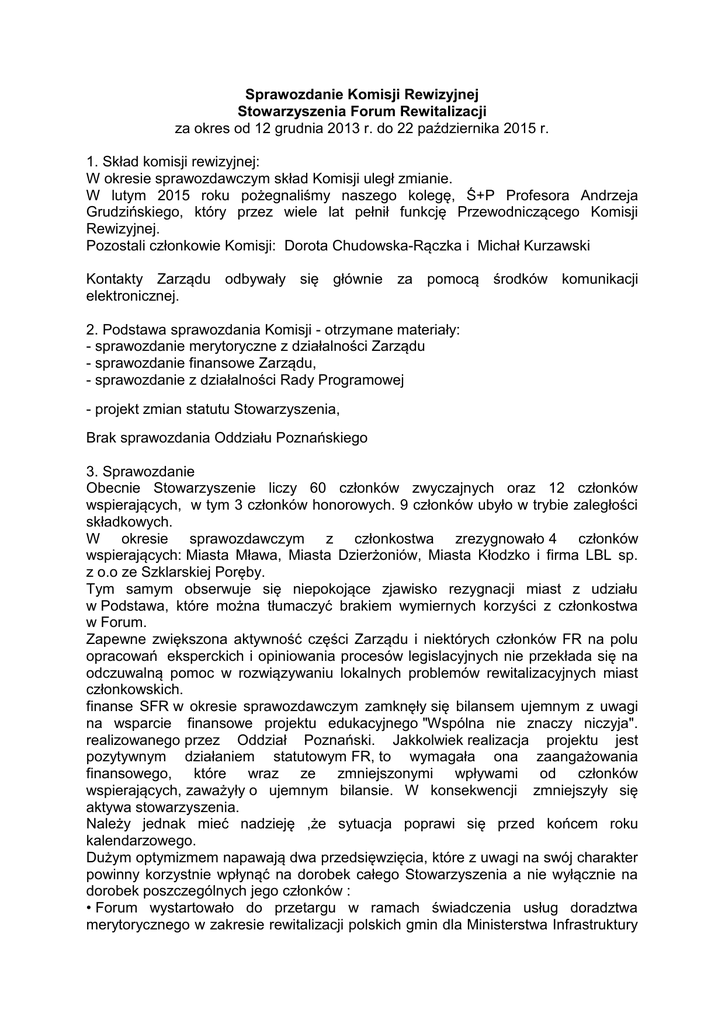 Sprawozdanie Komisji Rewizyjnej Stowarzyszenia Forum Rewitalizacji za okres od 12 grudnia 2013 r. do 22 października 2015 r. 1. Skład komisji rewizyjnej: W okresie sprawozdawczym skład Komisji uległ zmianie. W lutym 2015 roku pożegnaliśmy naszego kolegę, Ś+P Profesora Andrzeja Grudzińskiego, który przez wiele lat pełnił funkcję Przewodniczącego Komisji Rewizyjnej. Pozostali członkowie Komisji: Dorota Chudowska-Rączka i Michał Kurzawski Kontakty Zarządu odbywały się głównie elektronicznej. za pomocą środków komunikacji 2. Podstawa sprawozdania Komisji - otrzymane materiały: - sprawozdanie merytoryczne z działalności Zarządu - sprawozdanie finansowe Zarządu, - sprawozdanie z działalności Rady Programowej - projekt zmian statutu Stowarzyszenia, Brak sprawozdania Oddziału Poznańskiego 3. Sprawozdanie Obecnie Stowarzyszenie liczy 60 członków zwyczajnych oraz 12 członków wspierających, w tym 3 członków honorowych. 9 członków ubyło w trybie zaległości składkowych. W okresie sprawozdawczym z członkostwa zrezygnowało 4 członków wspierających: Miasta Mława, Miasta Dzierżoniów, Miasta Kłodzko i firma LBL sp. z o.o ze Szklarskiej Poręby. Tym samym obserwuje się niepokojące zjawisko rezygnacji miast z udziału w Podstawa, które można tłumaczyć brakiem wymiernych korzyści z członkostwa w Forum. Zapewne zwiększona aktywność części Zarządu i niektórych członków FR na polu opracowań eksperckich i opiniowania procesów legislacyjnych nie przekłada się na odczuwalną pomoc w rozwiązywaniu lokalnych problemów rewitalizacyjnych miast członkowskich. finanse SFR w okresie sprawozdawczym zamknęły się bilansem ujemnym z uwagi na wsparcie finansowe projektu edukacyjnego "Wspólna nie znaczy niczyja". realizowanego przez Oddział Poznański. Jakkolwiek realizacja projektu jest pozytywnym działaniem statutowym FR, to wymagała ona zaangażowania finansowego, które wraz ze zmniejszonymi wpływami od członków wspierających, zaważyły o ujemnym bilansie. W konsekwencji zmniejszyły się aktywa stowarzyszenia. Należy jednak mieć nadzieję ,że sytuacja poprawi się przed końcem roku kalendarzowego. Dużym optymizmem napawają dwa przedsięwzięcia, które z uwagi na swój charakter powinny korzystnie wpłynąć na dorobek całego Stowarzyszenia a nie wyłącznie na dorobek poszczególnych jego członków : • Forum wystartowało do przetargu w ramach świadczenia usług doradztwa merytorycznego w zakresie rewitalizacji polskich gmin dla Ministerstwa Infrastruktury i Rozwoju; gdzie podpisało umowę konsorcjum z Instytutem Rozwoju Miast w celu świadczenia usług podwykonawstwa w ramach ww przetargu. Przetarg został rozstrzygnięty pozytywnie, • Wypracowanie wspólnej oferty FR i Stowarzyszenia Centrum Wspierania Aktywności Lokalnej w konkursie Programu Operacyjnego Wiedza Edukacja Rozwój na kilkuletni projekt „Wzmocnienie procesu konsultacji społecznych i monitoringu społecznego (…) w obszarze planowania i zagospodarowania przestrzennego”. rozstrzygnięcie konkursu nastąpi w 2016 roku. 4. Zmiana statutu Stowarzyszenia. Projekt zmian był już przedmiotem dyskusji, a jej kontynuacja nastąpi na Walnym Zebraniu. Należy zwrócić uwagę na sprawy następujące: - ustalenie siedziby Stowarzyszenia - funkcjonowanie oddziałów terenowych w kontekście działalności Oddziału Poznańskiego. 5. Ogólna ocena rocznej działalności Zarządu i Rady Programowej. Ubiegły rok upłynął głównie na: kwestiach związanych z procesem legislacyjnym ustawy o rewitalizacji, opiniowaniem Krajowej polityki miejskiej i Narodowego programu rewitalizacji, realizacji przez Oddział Poznański projektu edukacyjnego "Wspólna nie znaczy niczyja" organizacji współpracy, w tym konferencji z partnerami francuskimi pn "Krajobraz miejski w politykach publicznych Francja- Polska" włączaniu się w coraz więcej projektów związanych z działaniami rewitalizacyjnymi, np wspólnie z Instytutem Rozwoju Miast oraz Centrum Aktywności Lokalnej. większej niż w roku ubiegłym aktywności członków Forum, w konferencjach związanych z rewitalizacją 6. Uwarunkowania legislacyjne rewitalizacji Obecnie pomimo wielu niedoskonałości istnieją realne szanse na uregulowanie prawne działań rewitalizacyjnych. Należy jednak uznać, że działania legislacyjne w zakresie rewitalizacji zostały podjęte za późno a na poziomie państwa nie udzielono im wsparcia finansowego, zrzucając kolejny raz decyzję na wyeksploatowane samorządy. Dotychczasowa konsumpcja środków unijnych na rewitalizację w Regionalnych programach operacyjnych sprowadzała się głównie do inwestycji infrastrukturalnych przy których tylko czasem udawało się zrealizować jakiś projekt społeczny. Pozytywną przesłanką jedynie może być kryterium kompleksowości działań podejmowanych w danym obszarze kryzysowym zawarte w wielu regionalnych programach na lata 2014-2020.