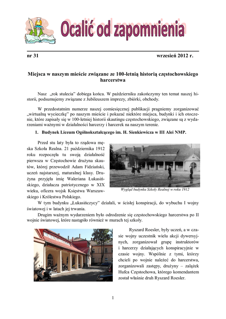 w wrzesień 2012 r. nr 31 Miejsca w naszym mieście związane ze 100-letnią historią częstochowskiego harcerstwa Nasz „rok stulecia” dobiega końca. W październiku zakończymy ten temat naszej historii, podsumujemy związane z Jubileuszem imprezy, zbiórki, obchody. W przedostatnim numerze naszej comiesięcznej publikacji pragniemy zorganizować „wirtualną wycieczkę” po naszym mieście i pokazać niektóre miejsca, budynki i ich otoczenie, które zapisały się w 100-letniej historii skautingu częstochowskiego, związane są z wydarzeniami ważnymi w działalności harcerzy i harcerek na naszym terenie. 1. Budynek Liceum Ogólnokształcącego im. H. Sienkiewicza w III Alei NMP. Przed stu laty była to rządowa męska Szkoła Realna. 21 października 1912 roku rozpoczęła tu swoją działalność pierwsza w Częstochowie drużyna skautów, której przewodził Adam Fidziański, uczeń najstarszej, maturalnej klasy. Drużyna przyjęła imię Waleriana Łukasińskiego, działacza patriotycznego w XIX Wygląd budynku Szkoły Realnej w roku 1912 wieku, oficera wojsk Księstwa Warszawskiego i Królestwa Polskiego. W tym budynku „Łukasińczycy” działali, w ścisłej konspiracji, do wybuchu I wojny światowej i w latach jej trwania. Drugim ważnym wydarzeniem było odrodzenie się częstochowskiego harcerstwa po II wojnie światowej, które nastąpiło również w murach tej szkoły. Ryszard Roesler, były uczeń, a w czasie wojny uczestnik wielu akcji dywersyjnych, zorganizował grupę instruktorów i harcerzy działających konspiracyjnie w czasie wojny. Wspólnie z tymi, którzy chcieli po wojnie należeć do harcerstwa, zorganizowali zastępy, drużyny – zalążek Hufca Częstochowa, którego komendantem został właśnie druh Ryszard Roesler. 1 Później, w latach 70-tych i 80-tych ubiegłego stulecia, w LO im. H. Sienkiewicza działał prężny szczep harcerski, złożony z wielu drużyn, klubów specjalnościowych i Młodzieżowych Kręgów Instruktorskich. „Sienkiewiczacy”, bo tak się o nich mówiło, byli znani w mieście z wielu cennych inicjatyw. Nie będziemy tu wymieniać nazwisk, bo to będzie tematem oddzielnym. 2. Budynek szkoły Podstawowej nr 14 przy ul. Waszyngtona, róg Pułaskiego. Tu zorganizowano po wybuchu II wojny światowej sztab konspiracyjnego harcerstwa żeńskiego, wchodzący w skład Harcerskiego Pogotowia Wojennego. Kierowała nim druhna Maria Kostrzewska, ówczesna komendantka Hufca Harcerek w Częstochowie. Z tego miejsca płynęły rozkazy i polecenia przekazywane przez łączniczki, stąd wychodziły zastępy harcerek gotowych do pomocy mieszkańcom Częstochowy. Tu również napływały meldunki o wykonaniu zadań. W latach 70-tych harcerze z „czternastki” stanowili bardzo aktywny szczep, jeden z najlepszych wśród szkół podstawowych. Tu właśnie, w grudniu 1975 r. odbył się finał VII Turnieju Wiedzy Obywatelskiej pod hasłem „ Mój region na mapie Polski”. W imprezie uczestniczył ówczesny Naczelnik ZHP hm Jerzy Wojciechowski. 3. Szkoła Podstawowa nr 21 przy ul. Sabinowskiej na Stradomiu. Ta szkoła związana jest z postacią bardzo ważną dla częstochowskiego harcerstwa z Eugeniuszem Stasieckim. Pracował w SP nr 21 jako nauczyciel w końcu lat 30-tych XX wieku, po wybuchu wojny był współtwórcą częstochowskich Szarych Szeregów i komendantem konspiracyjnego hufca - roju „Obraz”. Był też krótko kierownikiem Szkoły nr 21, gdzie organizował drużyny harcerskie. W roku 1941 musiał opuścić Częstochowę, bo Niemcy wpadli na trop jego działalności. Zginął w powstaniu warszawskim. W szkole znajduje się tablica upamiętniająca jego postać. 2 4. Dworzec kolejowy w Częstochowie przy ul. Piłsudskiego. Starego budynku dworca nie ma już od wielu lat, na jego miejsce zbudowano nowy. Przed II wojną światową Częstochowa była ważnym węzłem komunikacyjnym kolei warszawsko-wiedeńskiej. Budynek dworca od strony ul. Piłsudskiego i peronów w 1944 r. Gdy w roku 1944 w Warszawie wybuchło powstanie, wysiedlani ze stolicy mieszkańcy przemieszczali się przez teren naszego miasta. Przez częstochowskie dworce: Główny i Stradom przejeżdżały transporty wysiedleńców, którzy potrzebowali pomocy. Do pracy specjalnie utworzonego w tym celu Polskiego Komitetu Opiekuńczego włączyli się harcerze. Przez całą dobę, przez wiele dni trwały dyżury na dworcu kolejowym. Docierano do transportów i pomagano nieszczęśnikom na wszelkie możliwe sposoby. Udało się nawet niejednokrotnie zorganizować ucieczki więźniów. W czasie jednej z takich akcji zginęła pod kołami pociągu 18letnia harcerka Bogusława Sikorska. 5. Willa przy ul. Waszyngtona 32 (obecnie jest w tym budynku bank) Na wiosnę 1945 r. władze miasta przekazały harcerzom bardzo zniszczoną willę, która stała się siedzibą władz reaktywowanego Hufca Harcerzy. Budynek został odremontowany przez druhów i przyjaciół harcerstwa i już w maju 1945 r. zaczęła tam działać Komenda Hufca Harcerzy, odbywały się zbiórki drużynowych, a nawet szkolenia funkcyjnych. Z powodu braku innego lokalu wydzielono jedno z pomieszczeń Komendzie Hufca Harcerek i druhny w bardzo krótkim czasie urządziły tam bardzo ładną harcówkę. 6. Ratusz częstochowski przy Placu Biegańskiego. W tym zabytkowym budynku, w latach 60tych ubiegłego wieku, na pierwszym piętrze urządzono na krótko siedzibę Komendy Hufca Częstochowa – Miasto. (Władze naszego Hufca nie miały szczęścia do zajmowania na długo wyznaczonych im miejsc). Ratusz częstochowski nie tylko w tym krótkim okresie służył częstochowskiemu harcerstwu. Należy wspomnieć, że właśnie tu, trzykrotnie organizowane były wystawy z okazji harcerskich jubileuszy: 80-lecia – w roku 1991, 85-lecia – w roku 1996 i 90-lecia – w roku 2001. 3 7. Budynek narożny przy ul. Kilińskiego i ul. Racławickiej. Tam, w kilku pomieszczeniach na parterze (wejście od ul. Kiliń