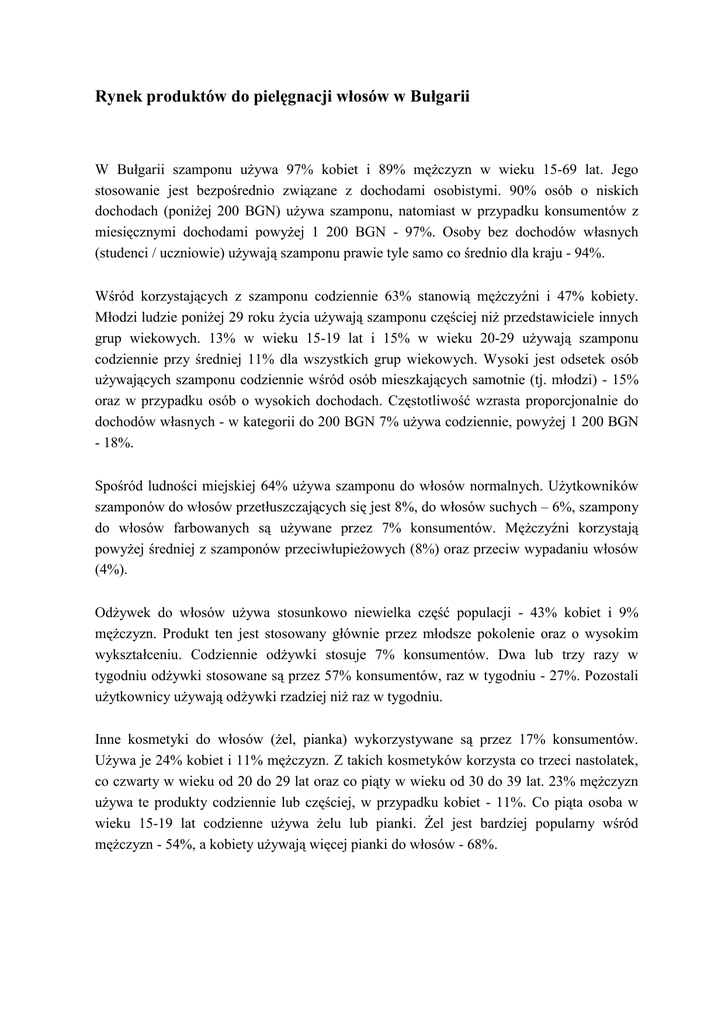 Rynek produktów do pielęgnacji włosów w Bułgarii W Bułgarii szamponu używa 97% kobiet i 89% mężczyzn w wieku 15-69 lat. Jego stosowanie jest bezpośrednio związane z dochodami osobistymi. 90% osób o niskich dochodach (poniżej 200 BGN) używa szamponu, natomiast w przypadku konsumentów z miesięcznymi dochodami powyżej 1 200 BGN - 97%. Osoby bez dochodów własnych (studenci / uczniowie) używają szamponu prawie tyle samo co średnio dla kraju - 94%. Wśród korzystających z szamponu codziennie 63% stanowią mężczyźni i 47% kobiety. Młodzi ludzie poniżej 29 roku życia używają szamponu częściej niż przedstawiciele innych grup wiekowych. 13% w wieku 15-19 lat i 15% w wieku 20-29 używają szamponu codziennie przy średniej 11% dla wszystkich grup wiekowych. Wysoki jest odsetek osób używających szamponu codziennie wśród osób mieszkających samotnie (tj. młodzi) - 15% oraz w przypadku osób o wysokich dochodach. Częstotliwość wzrasta proporcjonalnie do dochodów własnych - w kategorii do 200 BGN 7% używa codziennie, powyżej 1 200 BGN - 18%. Spośród ludności miejskiej 64% używa szamponu do włosów normalnych. Użytkowników szamponów do włosów przetłuszczających się jest 8%, do włosów suchych – 6%, szampony do włosów farbowanych są używane przez 7% konsumentów. Mężczyźni korzystają powyżej średniej z szamponów przeciwłupieżowych (8%) oraz przeciw wypadaniu włosów (4%). Odżywek do włosów używa stosunkowo niewielka część populacji - 43% kobiet i 9% mężczyzn. Produkt ten jest stosowany głównie przez młodsze pokolenie oraz o wysokim wykształceniu. Codziennie odżywki stosuje 7% konsumentów. Dwa lub trzy razy w tygodniu odżywki stosowane są przez 57% konsumentów, raz w tygodniu - 27%. Pozostali użytkownicy używają odżywki rzadziej niż raz w tygodniu. Inne kosmetyki do włosów (żel, pianka) wykorzystywane są przez 17% konsumentów. Używa je 24% kobiet i 11% mężczyzn. Z takich kosmetyków korzysta co trzeci nastolatek, co czwarty w wieku od 20 do 29 lat oraz co piąty w wieku od 30 do 39 lat. 23% mężczyzn używa te produkty codziennie lub częściej, w przypadku kobiet - 11%. Co piąta osoba w wieku 15-19 lat codzienne używa żelu lub pianki. Żel jest bardziej popularny wśród mężczyzn - 54%, a kobiety używają więcej pianki do włosów - 68%. Źródło: Regal Opracowano w Wydziale Promocji Handlu i Inwestycji Ambasady RP w Sofii (www.sofia.trade.gov.pl)