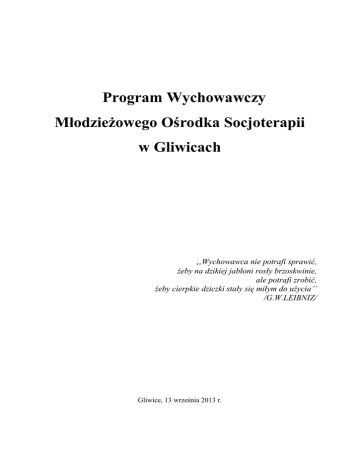 Program Wychowawczy Młodzieżowego Ośrodka Socjoterapii w Gliwicach ,,Wychowawca nie potrafi sprawić, żeby na dzikiej jabłoni rosły brzoskwinie, ale potrafi zrobić, żeby cierpkie dziczki stały się miłym do użycia’’ /G.W.LEIBNIZ/ Gliwice, 13 września 2013 r. Młodzieżowy Ośrodek Socjoterapii Gliwice Program Wychowawczy Profilaktyka i wychowanie mają podobny charakter. Często się wspomagają i przenikają, przy czym profilaktyka koncentruje się na przeciwdziałaniu złu, a wychowanie polega na otwieraniu dziecka na dobro. Mają one jednak ten sam naczelny cel, jakim jest zapewnienie pełni rozwoju dziecka (człowieka). Nadrzędnym celem wychowawczym placówki jest pomoc młodzieży z zaburzeniami socjalizacji w wyrównaniu szans życiowych poprzez: wszechstronny rozwój ich osobowości, kształtowanie prawidłowych postaw społecznych człowieka i obywatela świadomego swoich życiowych celów i wyborów wolnych od nałogów. Cele główne: 1. Stwarzanie uczniom/wychowankom możliwości do wszechstronnego rozwoju ich osobowości i kreatywności. 2. Umożliwianie zdobywania wiedzy i umiejętności poprzez wyrównywanie braków edukacyjnych w zakresie szkoły podstawowej i gimnazjum oraz przygotowanie do kontynuowania nauki na etapie ponadgimnazjalnym. 3. Modelowanie prawidłowych postaw moralnych i społecznych wobec siebie, rodziny, otaczającej rzeczywistości i środowiska. 4. Edukowanie świadomości w zakresie prawidłowego wyboru celów życiowych oraz umiejętności ich realizacji poprzez dokonywanie odpowiedzialnych wyborów. I. Stwarzanie możliwości wszechstronnego rozwoju osobowości uczniów/wychowanków. Cele pośrednie: 1. Rozwijanie ciekawości poznawczej ukierunkowanej na poszukiwanie w życiu wartości takich jak prawda, dobro, empatia, w oparciu o pozytywne wzorce i postawy godne do naśladowania. 2. Kształtowanie świadomości użyteczności wiedzy w praktyce. 3. Zdobywanie nowych umiejętności, rozwijanie zainteresowań poprzez aktywny udział w ciekawych propozycjach zajęć. 4. Promowanie i edukowanie do zdrowego i wolnego od nałogów stylu życia. II. Umożliwianie zdobywania wiedzy i umiejętności poprzez wyrównywanie braków edukacyjnych z zakresie szkoły podstawowej i gimnazjum oraz przygotowanie do kontynuowania dalszej nauki. Cele pośrednie: 1. Modelowanie ogólnego rozwoju uczniów/wychowanków poprzez indywidualne i grupowe zajęcia edukacyjne, terapeutyczne i wychowawcze. 2. Korygowanie i wyrównywanie braków edukacyjnych poprzez indywidualizację procesów dydaktycznych. Umożliwianie każdemu uczniowi odniesienia sukcesu szkolnego. 3. Wdrażanie do systematyczności poprzez codzienne zajęcia wynikające z planu dnia. 4. Zwiększanie motywacji uczniów do zdobywania wiedzy i nowych umiejętności. III. Kształtowanie prawidłowych postaw moralnych i społecznych wobec siebie, rodziny, otaczającej rzeczywistości i środowiska. Cele pośrednie: Młodzieżowy Ośrodek Socjoterapii Gliwice Program Wychowawczy 1. Wypracowywanie prawidłowych postaw społecznych poprzez respektowanie norm akcentujących wzajemny szacunek, akceptację, współpracę z innymi w środowisku rodzinnym, rówieśniczym i lokalnym. 2. Przygotowywanie do odpowiedzialnego wypełniania obowiązków rodzinnych i obywatelskich w oparciu o zasady etyki, moralności, demokracji, tolerancji i sprawiedliwości. 3. Modelowanie i rozwijanie wrażliwości na kulturę języka, piękno środowiska, potrzeby drugiego człowieka oraz krzywdę i cierpienie innych (empatii). 4. Kształtowanie postaw patriotycznych, w tym rozwijanie miłości do ojczyzny oraz poszanowania dla polskiego dziedzictwa kulturowego, przy jednoczesnym otwarciu na wartości kulturowe Europy i świata. IV. Kształtowanie świadomości w zakresie prawidłowego wyboru celów życiowych oraz umiejętności ich realizacji poprzez dokonywanie odpowiedzialnych wyborów. Cele pośrednie: 1. Ukierunkowywanie do umiejętnego planowania swoich celów życiowych oraz wytrwałego dążenia do ich realizacji poprzez rozwijanie zainteresowań i ambicji. 2. Prowadzenie poradnictwa zawodowego ukierunkowanego na pomoc w wyborze właściwej szkoły ponadgimnazjalnej oraz przygotowania do wejścia na rynek pracy. 3. Kształtowanie umiejętności dokonywania wyborów oraz przygotowanie do podjęcia zadań i ról wynikających z wejścia w dorosłość. 4. Rozwijanie samorządności uczniów poprzez włączanie ich w podmiotowe i odpowiedzialne współtworzenie społeczności. FORMY ODDZIAŁYWAŃ WYCHOWAWCZYCH Indywidualne i grupowe: 1. Modelowanie prawidłowych postaw i zachowań opartych na pozytywnych wzorcach osobowych. 2. Aktywne i twórcze organizowanie czasu wolnego. 3. Opracowanie i realizacja indywidualnych planów pracy wychowawczej. 4. Zajęcia terapeutyczne, psychoterapeutyczne – trening ,,Biofeedback’’, relaksacyjne oraz korekcyjno-wyrównawcze. 5. Oddziaływania profilaktyczne – przeciwdziałanie i minimalizowanie zjawisk niepożądanych społecznie w tym uzależnień. 6. Czynny udział w realizacji projektów edukacyjnych i profilaktycznych. 7. Współpraca z rodziną, opiekunami prawnymi i nauczycielami – wzajemna pomoc i wsparcie w procesie wychowawczym i socjalizacyjnym. 8. Współpraca ze środowiskiem lokalnym. 9. Współpraca z instytucjami wspomagającymi pracę Placówki: Urząd Miasta Gliwice, Starostwa Powiatowe, Poradnie Psychologiczno-Pedagogiczne, poradnie zdrowia (w tym psychicznego), Sądy Rejonowe, Rodzinne Ośrodki Diagnostyczno-Konsultacyjne, Policja, Miejskie Ośrodki Pomocy Społecznej, Ośrodki Terapii Uzależnień, ORE, GCOP, GOM, METIS - Katowice, Feniks, PSSE - Gliwice i inne. 10. Współpraca i wymiana doświadczeń z innymi placówkami – domy dziecka, młodzieżowe ośrodki socjoterapii, młodzieżowe ośrodki wychowawcze, schroniska dla nieletnich i inne. 11. Współpraca z instytucjami kulturalno-oświatowymi. Młodzieżowy Ośrodek Socjoterapii Gliwice Program Wyc