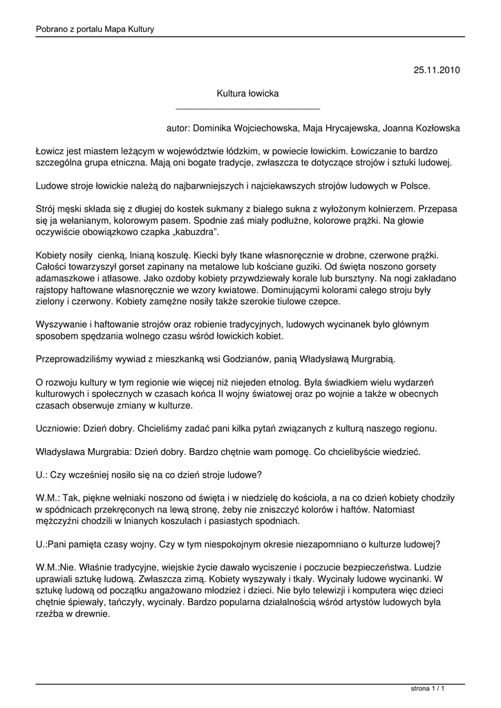 Pobrano z portalu Mapa Kultury 25.11.2010 Kultura łowicka ____________________________ autor: Dominika Wojciechowska, Maja Hrycajewska, Joanna Kozłowska Łowicz jest miastem leżącym w województwie łódzkim, w powiecie łowickim. Łowiczanie to bardzo szczególna grupa etniczna. Mają oni bogate tradycje, zwłaszcza te dotyczące strojów i sztuki ludowej. Ludowe stroje łowickie należą do najbarwniejszych i najciekawszych strojów ludowych w Polsce. Strój męski składa się z długiej do kostek sukmany z białego sukna z wyłożonym kołnierzem. Przepasa się ja wełanianym, kolorowym pasem. Spodnie zaś miały podłużne, kolorowe prążki. Na głowie oczywiście obowiązkowo czapka „kabuzdra”. Kobiety nosiły cienką, lnianą koszulę. Kiecki były tkane własnoręcznie w drobne, czerwone prążki. Całości towarzyszył gorset zapinany na metalowe lub kościane guziki. Od święta noszono gorsety adamaszkowe i atłasowe. Jako ozdoby kobiety przywdziewały korale lub bursztyny. Na nogi zakładano rajstopy haftowane własnoręcznie we wzory kwiatowe. Dominującymi kolorami całego stroju były zielony i czerwony. Kobiety zamężne nosiły także szerokie tiulowe czepce. Wyszywanie i haftowanie strojów oraz robienie tradycyjnych, ludowych wycinanek było głównym sposobem spędzania wolnego czasu wśród łowickich kobiet. Przeprowadziliśmy wywiad z mieszkanką wsi Godzianów, panią Władysławą Murgrabią. O rozwoju kultury w tym regionie wie więcej niż niejeden etnolog. Była świadkiem wielu wydarzeń kulturowych i społecznych w czasach końca II wojny światowej oraz po wojnie a także w obecnych czasach obserwuje zmiany w kulturze. Uczniowie: Dzień dobry. Chcieliśmy zadać pani kilka pytań związanych z kulturą naszego regionu. Władysława Murgrabia: Dzień dobry. Bardzo chętnie wam pomogę. Co chcielibyście wiedzieć. U.: Czy wcześniej nosiło się na co dzień stroje ludowe? W.M.: Tak, piękne wełniaki noszono od święta i w niedzielę do kościoła, a na co dzień kobiety chodziły w spódnicach przekręconych na lewą stronę, żeby nie zniszczyć kolorów i haftów. Natomiast mężczyźni chodzili w lnianych koszulach i pasiastych spodniach. U.:Pani pamięta czasy wojny. Czy w tym niespokojnym okresie niezapomniano o kulturze ludowej? W.M.:Nie. Właśnie tradycyjne, wiejskie życie dawało wyciszenie i poczucie bezpieczeństwa. Ludzie uprawiali sztukę ludową. Zwłaszcza zimą. Kobiety wyszywały i tkały. Wycinały ludowe wycinanki. W sztukę ludową od początku angażowano młodzież i dzieci. Nie było telewizji i komputera więc dzieci chętnie śpiewały, tańczyły, wycinały. Bardzo popularna działalnością wśród artystów ludowych była rzeźba w drewnie. strona 1 / 1