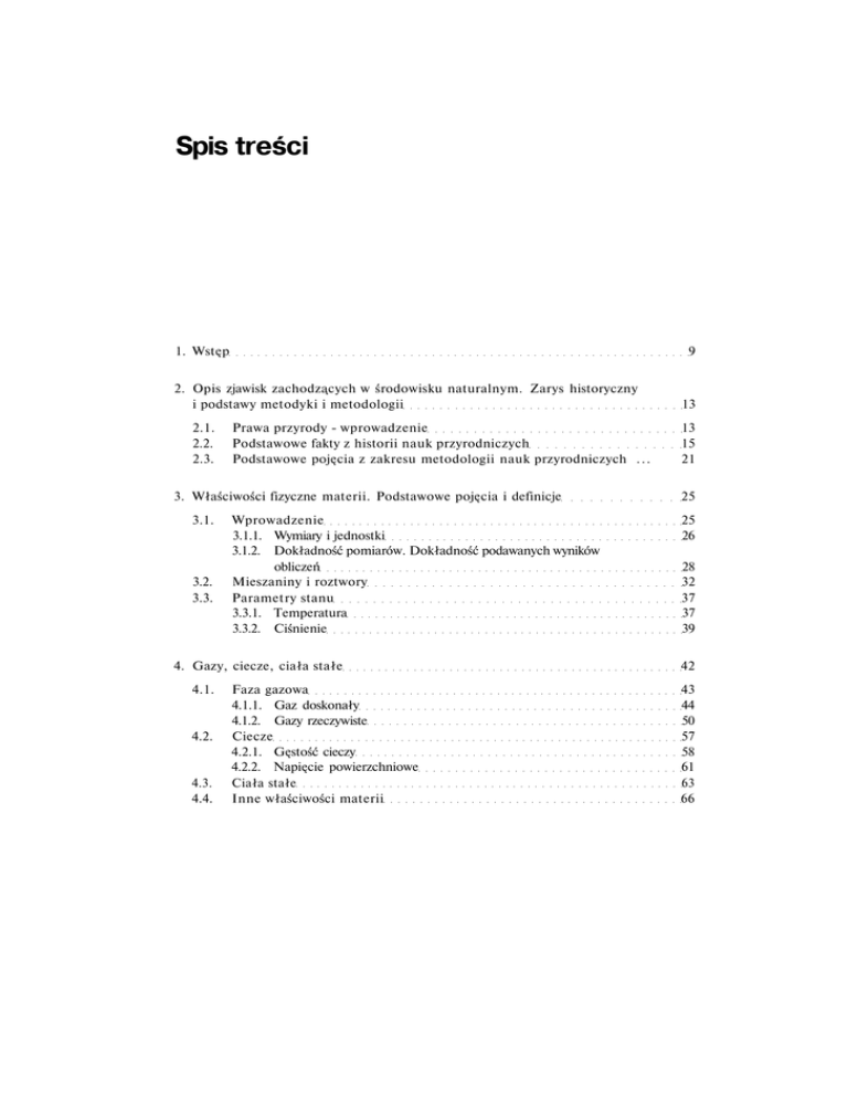 Spis treści 1. Wstęp 9 2. Opis zjawisk zachodzących w środowisku naturalnym. Zarys historyczny i podstawy metodyki i metodologii 2.1. 2.2. 2.3. Prawa przyrody - wprowadzenie Podstawowe fakty z historii nauk przyrodniczych Podstawowe pojęcia z zakresu metodologii nauk przyrodniczych . . . 3. Właściwości fizyczne materii. Podstawowe pojęcia i definicje 3.1. 3.2. 3.3. Wprowadzenie 3.1.1. Wymiary i jednostki 3.1.2. Dokładność pomiarów. Dokładność podawanych wyników obliczeń Mieszaniny i roztwory Parametry stanu 3.3.1. Temperatura 3.3.2. Ciśnienie 4. Gazy, ciecze, ciała stałe 4.1. 4.2. 4.3. 4.4. Faza gazowa 4.1.1. Gaz doskonały 4.1.2. Gazy rzeczywiste Ciecze 4.2.1. Gęstość cieczy 4.2.2. Napięcie powierzchniowe Ciała stałe Inne właściwości materii 13 13 15 21 25 25 26 28 32 37 37 39 42 43 44 50 57 58 61 63 66 5. Właściwości chemiczne materii 5.1. 5.2. 5.3. 5.4. 5.5. 5.6. 5.7. Wprowadzenie Podstawowe pojęcia i definicje Wzór chemiczny. Wiązanie chemiczne. Równanie chemiczne 5.3.1. Wzór chemiczny 5.3.2. Wiązania chemiczne 5.3.3. Równanie chemiczne Równowaga chemiczna Kwasy i zasady Reakcje redukcji i utleniania Reakcje fotochemiczne 6. Podstawy termodynamiczne procesów zachodzących w przyrodzie 6.1. 6.2. 6.3. 6.4. 6.5. 6.6. 6.7. 6.8. 6.9. Wprowadzenie. Podstawowe definicje Pierwsza zasada termodynamiki Entalpia Ciepło molowe Entalpia przemian fazowych. Obliczanie zmian entalpii, entalpia standardowa Temperatura wrzenia. Prężność pary nasyconej Entalpia przemiany chemicznej. Ciepło reakcji Entropia i druga zasada termodynamiki I oraz II zasada termodynamiki w rozwiązywaniu problemów inżynierii środowiska 7. Równowaga termodynamiczna 7.1. 7.2. Równowagi fazowe układów wieloskładnikowych 7.1.1. Rozpuszczalność gazów w wodzie. Równowaga gaz-ciecz. Równowaga para-ciecz 7.1.2. Równowaga gaz-ciało stałe 7.1.3. Równowaga ciecz-ciało stałe 7.1.4. Równowaga ciecz-ciecz Równowaga chemiczna 8. Szybkość procesu. Podstawowe wiadomości o szybkości przenoszenia pędu, ciepła i masy 8.1. Zagadnienia przepływu 8.1.1. Wprowadzenie 8.1.2. Statyka płynów 8.1.3. Kinematyka płynów 8.1.4. Dynamika płynów 8.1.5. Przepływ uwarstwiony a przepływ burzliwy 68 68 71 74 74 74 76 77 81 89 94 97 97 101 105 105 108 114 119 122 123 127 128 130 137 142 144 148 153 154 154 158 161 162 168 8.2. 8.3. Podstawy ruchu ciepła 8.2.1. Ruch ciepła na drodze promieniowania 8.2.2. Przewodzenie ciepła 8.2.3. Konwekcyjny transport ciepła Podstawy opisu zjawisk transportu masy 8.3.1. Dyfuzja cząsteczkowa 8.3.2. Konwekcja masy 9. Szybkość procesu. Podstawowe wiadomości o kinetyce reakcji chemicznych i biochemicznych 9.1. 9.2. 9.3. 9.4. Kinetyka chemiczna 9.1.1. Wprowadzenie 9.1.2. Podstawy kinetyki chemicznej dla reakcji homofazowych 9.1.3. Kinetyka reakcji złożonych Reakcje katalityczne Elementy kinetyki procesów metabolicznych Podsumowanie 10. Podstawy bilansowania procesów 10.1. Wprowadzenie 10.2. Ogólne zasady formowania bilansu materiałowego 10.3. Bilans materiałowy dla procesów ustalonych bez źródeł i upustów wewnętrznych 10.4. Bilans materiałowy układów złożonych 10.5. Bilans energii 10.5.1. Wprowadzenie 10.5.2. Zasady przygotowania równań bilansowych dla układów otwartych 10.6. Przykłady bilansów masy lub energii dla procesów nieustalonych . . . 171 172 173 175 182 182 186 195 195 195 197 204 208 212 219 220 220 222 227 242 261 261 261 271 11. Literatura 277 12. Dodatki 279 Skorowidz 291