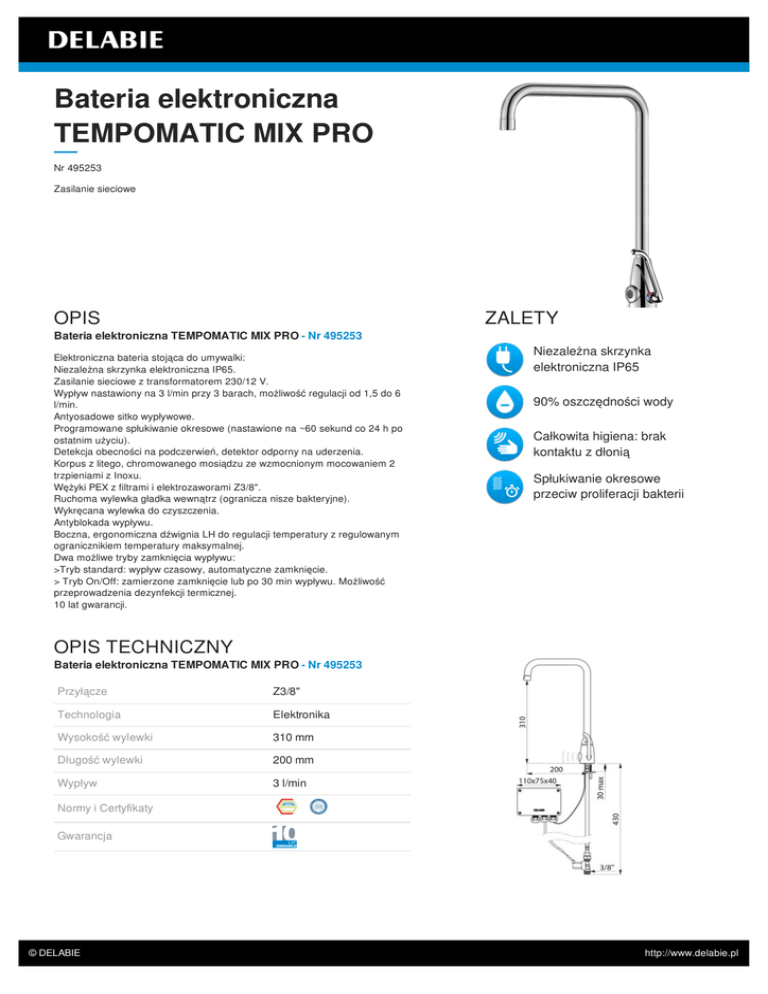 Bateria elektroniczna TEMPOMATIC MIX PRO Nr 495253 Zasilanie sieciowe OPIS ZALETY Bateria elektroniczna TEMPOMATIC MIX PRO - Nr 495253 Elektroniczna bateria stojąca do umywalki: Niezależna skrzynka elektroniczna IP65. Zasilanie sieciowe z transformatorem 230/12 V. Wypływ nastawiony na 3 l/min przy 3 barach, możliwość regulacji od 1,5 do 6 l/min. Antyosadowe sitko wypływowe. Programowane spłukiwanie okresowe (nastawione na ~60 sekund co 24 h po ostatnim użyciu). Detekcja obecności na podczerwień, detektor odporny na uderzenia. Korpus z litego, chromowanego mosiądzu ze wzmocnionym mocowaniem 2 trzpieniami z Inoxu. Wężyki PEX z filtrami i elektrozaworami Z3/8". Ruchoma wylewka gładka wewnątrz (ogranicza nisze bakteryjne). Wykręcana wylewka do czyszczenia. Antyblokada wypływu. Boczna, ergonomiczna dźwignia LH do regulacji temperatury z regulowanym ogranicznikiem temperatury maksymalnej. Dwa możliwe tryby zamknięcia wypływu: >Tryb standard: wypływ czasowy, automatyczne zamknięcie. > Tryb On/Off: zamierzone zamknięcie lub po 30 min wypływu. Możliwość przeprowadzenia dezynfekcji termicznej. 10 lat gwarancji. Niezależna skrzynka elektroniczna IP65 90% oszczędności wody Całkowita higiena: brak kontaktu z dłonią Spłukiwanie okresowe przeciw proliferacji bakterii OPIS TECHNICZNY Bateria elektroniczna TEMPOMATIC MIX PRO - Nr 495253 Przyłącze Z3/8" Technologia Elektronika Wysokość wylewki 310 mm Długość wylewki 200 mm Wypływ 3 l/min Normy i Certyfikaty Gwarancja © DELABIE http://www.delabie.pl