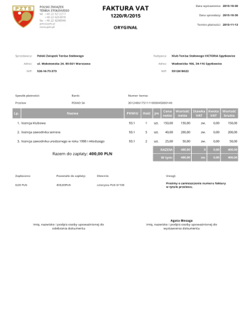 FAKTURA VAT Data wystawienia: 2015-10-30 1220/R/2015 Data sprzedaży: 2015-10-30 Termin płatności: 2015-11-13 ORYGINAŁ Sprzedawca: Adres: NIP: Polski Związek Tenisa Stołowego Nabywca: ul. Mokotowska 24, 00-561 Warszawa Adres: 526-16-73-373 NIP: Klub Tenisa Stołowego VICTORIA Spytkowice Wadowicka 106, 34-116 Spytkowice 5512618622 Sposób płatności: Bank: Numer konta: Przelew PEKAO SA 30124061751111000045800140 PKWiU Ilość Jm Cena netto Wartość netto 1. licencja klubowa 93.1 1 szt. 150,00 150,00 zw. 0,00 150,00 2. licencja zawodnika seniora 93.1 5 szt. 40,00 200,00 zw. 0,00 200,00 3. licencja zawodnika urodzonego w roku 1998 i młodszego 93.1 2 szt. 25,00 50,00 zw. 0,00 50,00 RAZEM: 400,00 X 0,00 400,00 W tym: 400,00 zw. 0,00 400,00 Lp. Nazwa Razem do zapłaty: 400,00 PLN Stawka Kwota VAT VAT Wartość brutto Zapłacono: Pozostało do zapłaty: Słownie: Uwagi: 0,00 PLN 400,00PLN czterysta PLN 0/100 Prosimy o zamieszczenie numeru faktury w tytule przelewu. imię, nazwisko i podpis osoby upoważnionej do odebrania dokumentu Agata Biesaga imię, nazwisko i podpis osoby upoważnionej do wystawienia dokumentu