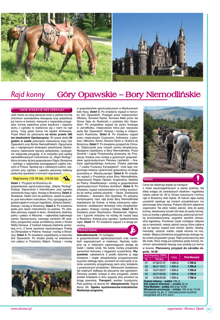 Rajd konny Góry Opawskie – Bory Niemodlińskie J A KIE AT R A K C JE N A S CZEKAJĄ? Jeśli macie za sobą pierwsze kroki w jeździe konnej (minimum samodzielnie kłusujecie oraz jeździliście już konno w terenie), marzycie o traperskiej przygodzie, konnej wędrówce przez bezdroża i zapachu dymu z ogniska to wybierzcie się z nami na rajd konny. Tutaj jazda konna nie będzie limitowana. Przed Wami do pokonania na koniu prawie 300 km bezdrożami Opolszczyzny. W czasie około 50 godzin w siodle pokonacie malownicze trasy Gór Opawskich oraz Borów Niemodlińskich. Zapoznacie się z największymi atrakcjami południowej Opolszczyzny, nabierzecie wprawy jeździeckiej i przeżyjecie wspaniałą przygodę. A to wszystko pod opieką wykwalifikowanych instruktorów ze „Stajni Rozłogi”, która od wielu lat jest gospodarzem Rajdu Skorpiona – jednego z najbardziej wymagających rajdów konnych w Polsce. Spotkaj się z ciekawymi ludźmi, wieczorem przy ognisku i zapachu pieczonej kiełbasy posłuchaj opowieści o konnych wyprawach. Rajd konny (13-18 lat), (19-24 lat) Dzień 1. Przyjazd do Brzeźnicy do gospodarstwa agroturystycznego „Stajnia Rozłogi”. Kolacja. Zapoznanie z instruktorami, przy ognisku omówienie trasy rajdu. Nocleg w Brzeźnicy. Dzień 2. Śniadanie. Dobór koni do jeźdźców. Jazda na padoku pod kierunkiem instruktora. Przy sprzyjającej pogodzie kąpiel w uroczym kąpielisku „Zielona Zatoka”. Kolacja i nocleg w Brzeźnicy. Dzień 3. Po śniadaniu jazda pod okiem instruktorów na padoku. Po obiedzie pierwszy wyjazd w teren. Zwiedzanie stadniny, parku i pałacu w Mosznej – najbardziej bajkowego zamku Opolszczyzny, zwanego zamkiem 99 wież, który przypomina swoja architekturą zamki z filmów Walta Disneya. Z hodowli tutejszej stadninie pochodzą m.in. 2 konie sportowe reprezentujące Polskę na Olimpiadzie w Pekinie. Kolacja i nocleg w Brzeźnicy. Dzień 4. Po śniadaniu wyjeżdżamy w kierunku Gór Opawskich. Po drodze postój na zwiedzanie ruin pałacu w Przydrożu Małym. Kolacja i nocleg www.almatur.pl w gospodarstwie agroturystycznym w Mańkowicach koło Nysy. Dzień 5. Po śniadaniu wyjazd w kierunku Gór Opawskich. Przejazd przez miejscowości: Włodary, Ścinawa Nyska, Ścinawa Mała przez las Zimne Kęty do Rudniczki u podnóża Gór Opawskich. Po przyjeździe wyjazd do parku linowego w Jarnołtówku, miejscowości która jest nazywana perłą Gór Opawskich. Kolacja i nocleg w miejscowości Rudniczka. Dzień 6. Po śniadaniu wyjazd przez miejscowości Czyżowice, Kolnowice, Laskowiec, Miłowice, Śmicz, Kolonia Otock a, Grabina do Brzeźnicy. Dzień 7. Po śniadaniu przejazd do Chrzelic. Odpoczynek przy ruinach zamku templariuszy. Następnie wjeżdżamy w Bory Niemodlińskie. Przez Smolnik i Ligotę Prószkowską docieramy do Przysieczy. Kolacja oraz nocleg w gościnnym gospodarstwie agroturystycznym Państwa Lipińskich – finaliście ogólnopolskiego konkursu „Polska pięknieje – 7 cudów Funduszy Europejskich”. Urok tego magicznego miejsca i gościnność gospodarzy na długo pozostaną w Waszej pamięci. Dzień 8. Po śniadaniu wyjazd z Przysieczy przez Bory Niemodlińskie, miejscowość Rogów Opolski, Krapkowice, Steblów do Pietny. Obiadokolacja i nocleg w gospodarstwie agroturystycznym Państwa Iścińskich. Dzień 9. Po śniadaniu wyjazd samochodami na krótką wycieczkę do stolicy polskiej piosenki – Opola. Zwiedzanie amfiteatru i skansenu Wsi Opolskiej. Po południu kontynuujemy nasz rajd przez Bory Niemodlińskie dojeżdżamy do Dobrej, w której zobaczymy zabudowania i poddawane renowacji ruiny neogotyckiego pałacu. Kolacja i nocleg w Dobrej. Dzień 10. Po śniadaniu przez Zbychowice, Racławiczki, Ogiernicze i Łącznik wracamy na nocleg do naszej bazy w Brzeźnicy. Kolacja przy ognisku i podsumowanie rajdu. Dzień 11. Po śniadaniu wyjazd z w drogę powrotną. ŚW IADCZENIA Zakwaterowanie: 10 noclegów w gospodarstwach agroturystycznych oraz namiotach wyposażonych w materace. Namioty rozbijane są w miejscach zapewniających dostęp do toalet i ciepłej wody. Na każdy nocleg przyjeżdża samochód terenowy z bagażami uczestników. Wyżywienie: całodzienne 3 posiłki dziennie (z tego śniadania i ciepłe obiadokolacje przygotowywane są przez obsługę rajdu, prowiant na czas jazdy w terenie uczestnicy przygotowują sami przy śniadaniu z powierzonych produktów). Wieczorem dodatkowo dla chętnych kiełbasa do pieczenia nad ogniskiem. Pierwszy posiłek: kolacja w dniu przyjazdu, ostatni posiłek śniadanie w dniu wyjazdu plus prowiant na drogę powrotną. Transport: autokar turystyczny. Plan podróży na stronie 93. Ubezpieczenie: Signal Iduna SA. Opieka wychowawców-instruktorów. Realizacja programu. U WA GI Cena nie obejmuje dopłat za transport z miast wyszczególnionych w planie podróży. Na bilety wstępu do zwiedzanych obiektów i kąpieliska należy zabrać ok. 30 zł. Grupa rozpoczyna i kończy rajd w Brzeźnicy koło Opola. W trakcie rajdu każdy uczestnik opiekuje się koniem przydzielonym mu pierwszego dnia imprezy. Pokarm dla koni zapewnia organizator. Na obóz należy zabrać: strój do jazdy konnej, atestowany toczek lub kask do jazdy konnej, buty za kostkę z gładką podeszwą, pelerynę lub kurtkę przeciwdeszczową, wygodne spodnie (dresy), strój kąpielowy. Ponieważ część noclegów odbywa się w namiotach, należy zabrać rzeczy, które zabiera się na typowy wyjazd pod namiot: śpiwór, latarkę, menażkę, sztućce, kubek, ciepłe ubranie na noc, sweter. Miejsca biwakowe przygotowuje obsługa rajdu przed przyjazdem grupy. Rajd przeznaczony jest dla osób, które znają już podstawy jazdy konnej, minimum samodzielnie kłusują oraz jeździły już konno w terenie. Planowany przyjazd do ośrodka ok. godz. 18.00. Kod Imprezy: OPKL Ceny First Moment Nr Terminy 01 27.06-07.07 1.999 zł 1.799 zł 02 08.07-18.07 1.999 zł 1.799 zł 03 19.07-29.07 1.999 zł 1.799 zł 04 30.07-09.08 1.999 zł 1.799 