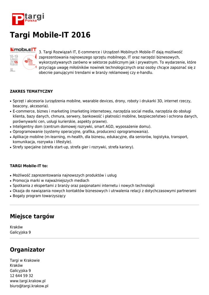 Targi Mobile-IT 2016 3. Targi Rozwiązań IT, E-commerce i Urządzeń Mobilnych Mobile-IT dają możliwość zaprezentowania najnowszego sprzętu mobilnego, IT oraz narzędzi biznesowych, wykorzystywanych zarówno w sektorze publicznym jak i prywatnym. To wydarzenie, które przyciąga uwagę miłośników nowinek technologicznych oraz osoby chcące zapoznać się z obecnie panującymi trendami w branży reklamowej czy e-handlu. ZAKRES TEMATYCZNY ● ● ● ● ● ● Sprzęt i akcesoria (urządzenia mobilne, wearable devices, drony, roboty i drukarki 3D, internet rzeczy, beacony, akcesoria). E-commerce, biznes i marketing (marketing internetowy, narzędzia social media, narzędzia do obsługi klienta, bazy danych, chmura, serwery, bankowość i płatności mobilne, bezpieczeństwo i ochrona danych, porównywarki cen, usługi kurierskie, aspekty prawne). Inteligentny dom (centrum domowej rozrywki, smart AGD, wyposażenie domu). Oprogramowanie (systemy operacyjne, grafika, producenci oprogramowania). Aplikacje mobilne (m-learning, m-health, dla biznesu, edukacyjne, dla seniorów, logistyka, transport, komunikacja, rozrywka i lifestyle). Strefy specjalne (strefa start-up, strefa gier i rozrywki, strefa kariery). TARGI Mobile-IT to: ● ● ● ● ● Możliwość zaprezentowania najnowszych produktów i usług Promocja marki w najważniejszych mediach Spotkania z ekspertami z branży oraz pasjonatami internetu i nowych technologii Okazja do nawiązania nowych kontaktów biznesowych i utrwalenia relacji z dotychczasowymi partnerami Bogaty program towarzyszący Miejsce targów Kraków Galicyjska 9 Organizator Targi w Krakowie Kraków Galicyjska 9 12 644 59 32 www.targi.krakow.pl [email protected]