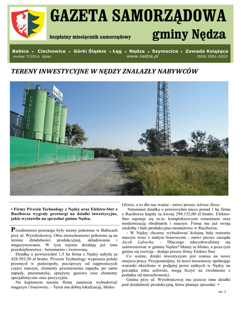 GAZETA SAMORZĄDOWA bezpłat n bezpłatny miesięcznik samorządowy Babice • Ciechowice • Górki Śląskie • Łęg numer 7/2014 lipiec • gminy Nędza Nędza • Szymocice www.nedza.pl • Zawada Książęca ISSN 2081-0202 TERENY INWESTYCYJNE W NĘDZY ZNALAZŁY NABYWCÓW • Firmy Pivexin Technology z Nędzy oraz Elektro-Ster z Raciborza wygrały przetargi na działki inwestycyjne, jakie wystawiła na sprzedaż gmina Nędza. Przedmiotem przetargu były tereny położone w Babicach przy ul. Wyrobiskowej. Obie nieruchomości położone są na terenie działalności produkcyjnej, składowania i magazynowania. W tym rejonie działają już inne przedsiębiorstwa - betoniarnia i żwirownia. Działkę o powierzchni 1,5 ha firma z Nędzy nabyła za 428.593,50 zł brutto. Pivexin Technology wyposaża polski przemysł w podzespoły, począwszy od najprostszych części maszyn, elementy przeniesienia napędu, po same napędy, pneumatykę, sprężyny gazowe oraz elementy specjalistyczne oraz precyzyjne. Na kupionym terenie firma zamierza wybudować magazyn i biurowiec. - Teren ma dobrą lokalizację, blisko Gliwic, a to dla nas ważne - mówi prezes Adrian Slany. Natomiast działkę o powierzchni nieco ponad 1 ha firma z Raciborza kupiła za kwotę 298.152,00 zł brutto. ElektroSter zajmuje się m.in. kompleksowymi remontami oraz modernizacją obrabiarek i maszyn. Firma ma już swoją siedzibę i hale produkcyjno-montażowe w Raciborzu. - W Nędzy chcemy wybudować kolejną halę remontu maszyn wraz z małym biurowcem - mówi prezes zarządu Jacek Labocha. - Dlaczego zdecydowaliśmy się zainwestować w gminie Nędza? Mamy tu blisko, a poza tym gmina się rozwija - dodaje prezes firmy Elektro Ster. Co ważne, dzięki inwestycjom jest szansa na nowe miejsca pracy. Przypomnijmy, że nowi inwestorzy spełniając warunki określone w podjętej przez radnych w Nędzy na początku roku uchwale, mogą liczyć na zwolnienie z podatku od nieruchomości. Gmina przy ul. Wyrobiskowej ma jeszcze inne działki pod działalność produkcyjną, które planuje sprzedać. • str. 1 Z URZĘDU gazeta samorządowa gminy Nędza nr 7/2014 ROZSTRZYGNIĘTO NOWY PRZETARG NA ODBIÓR ŚMIECI Umowa z nowym wykonawcą została podpisana do końca • Od 1 lipca odbiorem i zagospodarowaniem odpadów 2014 roku. Harmonogram wywozu odpadów obowiązujący w gminie Nędza zajmuje się konsorcjum firm: w lipcu i sierpniu dostępny jest na stronie internetowej Tonsmeier Południe sp. z o.o. z Rudy Śląskiej oraz www.nedza.pl. • raciborskiego Przedsiębiorstwa Komunalnego. Stawki za odbiór śmieci dla mieszkańców się nie zmienią. BEZ NOWYCH DEKLARACJI Poprzednia umowa z firmą zajmującą się zagospodarowaniem odpadów (Przedsiębiorstwo Komunalne z Raciborza) obowiązywała do końca czerwca. Gmina ogłosiła więc kolejny przetarg. Pierwszy - ogłoszony jeszcze w maju został unieważniony, ponieważ najkorzystniejsza oferta i tak przewyższała kwotę, którą gmina zamierzała przeznaczyć na sfinansowanie zamówienia. Konieczne więc było ogłoszenie drugiego przetargu. Zgodnie z przedmiotem zamówienia konsorcjum firm, które wygrało przetarg będzie odbierać i zagospodarowywać odpady komunalne. Przypomnijmy, że jeszcze w styczniu tego roku radni gminy Nędza uchwalili nowe - niższe stawki za odbiór śmieci. I one się nie zmienią, mieszkańcy w dalszym ciągu za odpady segregowane będą płacić tyle samo: • 10,00 zł od osoby miesięcznie (jeżeli lokal zamieszkuje jedna albo dwie osoby), • 8,00 zł od osoby miesięcznie (jeśli trzy osoby), • 7,00 zł od osoby (jeżeli cztery osoby), • 6,00 zł miesięcznie (jeżeli pięć osób i więcej). W związku z tym, nie ma konieczności składania do urzędu gminy nowych deklaracji. UL. WIEJSKA W BABICACH TANIEJ • Przetarg na przebudowę drogi powiatowej ul. Wiejskiej w Babicach wygrała firma Auto-Trans Asfalty sp. z o.o. z Gierałtowic proponując najniższą kwotę. Inwestycja będzie tańsza niż zakładano. Wykonawca zaproponował kwotę ponad 370 tys. zł. Przypomnijmy, że wcześniej drogą uchwały radni zdecydowali o zawarciu umowy między gminą a powiatem o współdziałaniu w zakresie realizacji przebudowy ul. Wiejskiej. Umowa zakłada, że oba samorządy wyłożą na przebudowę po tyle samo. Ulica jest drogą powiatową, więc roboty drogowe leżą w gestii władz powiatu. Kosztorys inwestorski kilometrowego odcinka - od ul. Rudzkiej do wjazdu na ul. Wyzwolenia w Raszczycach - opiewał początkowo na 1,4 mln zł. Gmina z własnego budżetu miała na ten cel wyłożyć ponad 356 tys. zł. Taką samą kwotę wyłożyć miał powiat, a reszta pieniędzy liczono, że pochodzić będzie z dofinansowania. Starostwo starało się pozyskać na ten cel środki z Narodowego Programu Przebudowy Dróg Lokalnych, czyli tzw. "schetynówki". Niestety, zadanie nie zakwalifikowało się do dofinansowania. Ponieważ okazało się, że inwestycja nie zyska wsparcia z zewnątrz, zdecydowano, że remont zostanie co prawda przeprowadzony na odcinku, jaki zakładano na początku, ale bez wymiany podłoża. Każdy z samorządów - gmina Nędza i powiat raciborski zdecydowały, że przeznaczą na ten cel po 356 tys. zł. Po przetargu okazało się jednak, że inwestycja będzie kosztować mniej. Wykonawca z Gierałtowic zaproponował kwotę 376 076,19 zł brutto - To oznacza, że zmniejszy się udział finansowy gminy w tym przedsięwzięciu. Gmina i powiat przekażą na ten cel po 200 tys. zł, z małym zapasem na ewentualne roboty dodatkowe - wyjaśnia Wójt Gminy Nędza Anna Iskała. Remont ma ruszyć jeszcze w lipcu. Konsekwencją tańszej realizacji zadania pn. „Przebudowa drogi powiatowej 3546S, ul. Wiejska w Babicach” były zmiany w uchwale budżetowej, jakie podjęli radni z Nędzy na ostatniej sesji. Część środków jaką udało się dzięki inwestycji zaoszczędzić, została przesunięta na adaptację budynku do celów Ochotniczej Straży Po