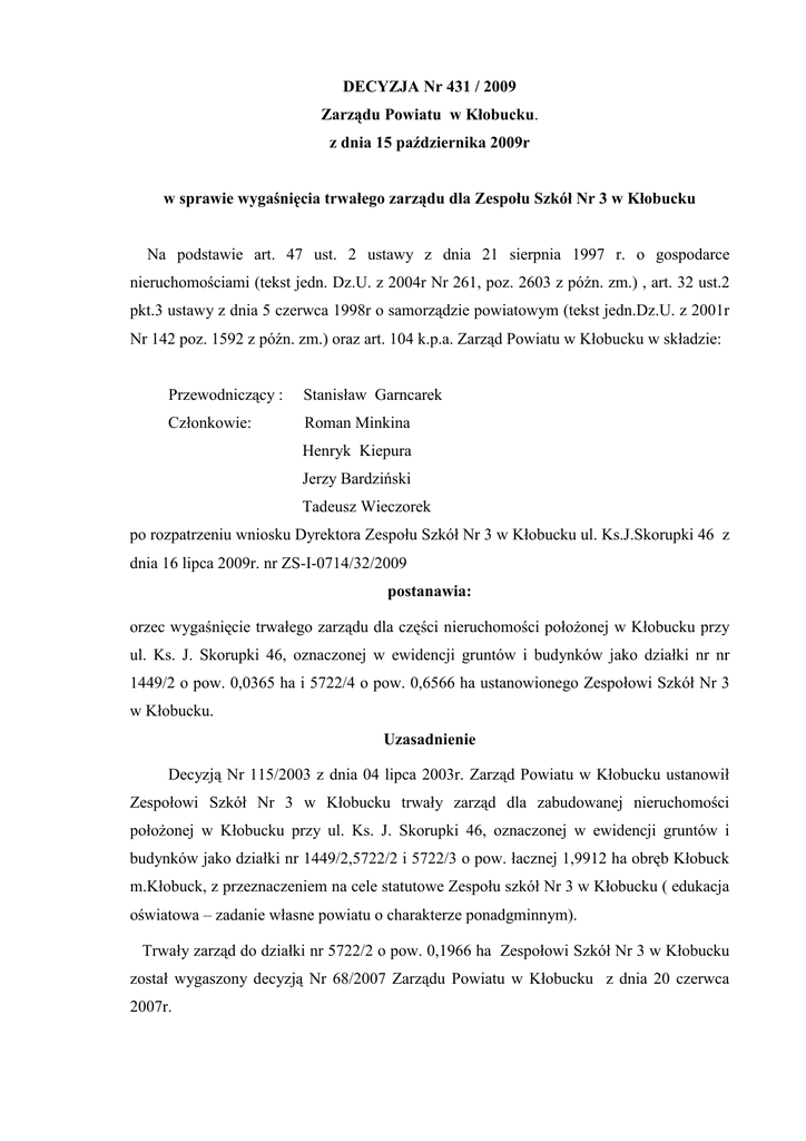 DECYZJA Nr 431 / 2009 Zarządu Powiatu w Kłobucku. z dnia 15 października 2009r w sprawie wygaśnięcia trwałego zarządu dla Zespołu Szkół Nr 3 w Kłobucku Na podstawie art. 47 ust. 2 ustawy z dnia 21 sierpnia 1997 r. o gospodarce nieruchomościami (tekst jedn. Dz.U. z 2004r Nr 261, poz. 2603 z późn. zm.) , art. 32 ust.2 pkt.3 ustawy z dnia 5 czerwca 1998r o samorządzie powiatowym (tekst jedn.Dz.U. z 2001r Nr 142 poz. 1592 z późn. zm.) oraz art. 104 k.p.a. Zarząd Powiatu w Kłobucku w składzie: Przewodniczący : Stanisław Garncarek Członkowie: Roman Minkina Henryk Kiepura Jerzy Bardziński Tadeusz Wieczorek po rozpatrzeniu wniosku Dyrektora Zespołu Szkół Nr 3 w Kłobucku ul. Ks.J.Skorupki 46 z dnia 16 lipca 2009r. nr ZS-I-0714/32/2009 postanawia: orzec wygaśnięcie trwałego zarządu dla części nieruchomości połoŜonej w Kłobucku przy ul. Ks. J. Skorupki 46, oznaczonej w ewidencji gruntów i budynków jako działki nr nr 1449/2 o pow. 0,0365 ha i 5722/4 o pow. 0,6566 ha ustanowionego Zespołowi Szkół Nr 3 w Kłobucku. Uzasadnienie Decyzją Nr 115/2003 z dnia 04 lipca 2003r. Zarząd Powiatu w Kłobucku ustanowił Zespołowi Szkół Nr 3 w Kłobucku trwały zarząd dla zabudowanej nieruchomości połoŜonej w Kłobucku przy ul. Ks. J. Skorupki 46, oznaczonej w ewidencji gruntów i budynków jako działki nr 1449/2,5722/2 i 5722/3 o pow. łacznej 1,9912 ha obręb Kłobuck m.Kłobuck, z przeznaczeniem na cele statutowe Zespołu szkół Nr 3 w Kłobucku ( edukacja oświatowa – zadanie własne powiatu o charakterze ponadgminnym). Trwały zarząd do działki nr 5722/2 o pow. 0,1966 ha Zespołowi Szkół Nr 3 w Kłobucku został wygaszony decyzją Nr 68/2007 Zarządu Powiatu w Kłobucku z dnia 20 czerwca 2007r. W wyniku podziału nieruchomości zatwierdzonego decyzją Burmistrza Kłobucka Nr GPN.PM.7430-3-0019/09 z dnia 29.05.2009r. działka nr 5722/3 o pow. 1,7581 ha uległa podziałowi na działki nr 5722/4 o pow. 0,6566 ha i nr 5722/5 o pow. 1,1060 ha. Wnioskiem ZS-I-0714/32/2009 z dnia 16 lipca 2009r Dyrektor Zespołu Szkół Nr 3 w Kłobucku ul. Ks.J.Skorupki 46 zwrócił się do Zarządu Powiatu w Kłobucku – Starosty Kłobuckiego o wygaszenie trwałego zarządu dla opisanej wyŜej nieruchomości. Wnioskodawca stwierdził, Ŝe nieruchomość oznaczona jako działki 1449/2 i 5722/4 stały się zbędne na potrzeby funkcjonowania szkoły. Uchwałą Nr 424/2009 Zarząd Powiatu w Kłobucku z dn.8 października 2009r. wyraził zgodę Zespołowi Szkół Nr 3 na złoŜenie wniosku o wygaśniecie trwałego zarządu dla działek nr 1449/2 i 5722/2 , co stanowi zgodę organu nadzorującego komunalną jednostkę organizacyjną o której mowa w art. 47 ust. 2 ustawy o gospodarce nieruchomościami . Po wygaśnięciu trwałego zarządu Zarząd Powiatu przewiduje zagospodarowanie nieruchomości dla potrzeb Starostwa Powiatowego w Kłobucku z przeznaczeniem na powiekszenie nieruchomości wykorzystywanej na cele administracyjno-biurowe w Kłobucku przy ul. Ks.J.Skorupki 46. W tej sytuacji, na podstawie art. 47 ust. 2 ustawy o gospodarce nieruchomościami Zarząd Powiatu w Kłobucku uznając wniosek za uzasadniony orzekł jak w sentencji decyzji . Od decyzji niniejszej przysługuje odwołanie za pośrednictwem Zarządu Powiatu w Kłobucku do Samorządowego Kolegium Odwoławczego w Częstochowie al. Niepodległości 22/24 w terminie 14 dni od daty jej doręczenia. Przewodniczący Zarządu Powiatu w Kłobucku 2 Rozdzielnik do decyzji Nr 431/2009 Zarządu Powiatu w Kłobucku z dnia 15 października 2009r. w sprawie wygaśnięcia trwałego zarządu dla Zespołu Szkół Nr 3 w Kłobucku 3
