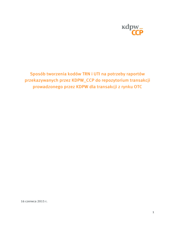 Sposób tworzenia kodów TRN i UTI na potrzeby raportów przekazywanych przez KDPW_CCP do repozytorium transakcji prowadzonego przez KDPW dla transakcji z rynku OTC 16 czerwca 2015 r. 1 INFORMACJE OGÓLNE KDPW_CCP przekazuje raporty dla rozliczonych transakcji z rynku OTC do repozytorium transakcji prowadzonego przez KDPW. Raporty są oznaczone unikalnymi kodami – TRN i UTI. Szczegółowe informacje na temat tworzenia powyższych kodów zostały zawarte poniżej. Przedstawiony sposób obejmuje sytuacje: przyjęcia transakcji do rozliczeń, umorzenia pozycji przeciwstawnych oraz portingu. IDENTYFIKATORY TRANSAKCJI Każda transakcja raportowana do repozytorium transakcji jest oznaczona unikalnym identyfikatorem TRN (Transaction Reference Number). Do budowy identyfikatora TRN KDPW_CCP będzie wykorzystywał przekazywany w komunikacie otcd.ntf.001.01 identyfikator transakcji zawarty w atrybucie ‘id’ w polu ‘trade’. Identyfikator TRN, zgodnie z wymaganiami, zawiera maksymalnie 40 znaków. Identyfikator TRN powinien być unikalny dla każdej transakcji powstałej po nowacji, a także dla pozycji powstałych w wyniku operacji wykonanych w trakcie życia transakcji (transakcja, porting, umorzenie częściowe). W związku z powyższym KDPW_CCP dla budowy identyfikatora TRN wykorzysta następujący algorytm: Algorytm budowy identyfikatora TRN dla nowej transakcji (tabela nr 1) Pola nr Długość1 Opis Wartość 1-10 10 E01MIC KDPW_CCP000 E01KDPW0002 11 1 kod rynku N 12 1 Typ operacji T – transakcja P – porting3 A – umorzenie częściowe 13-20 8 Data operacji RRRRMMDD 21-n maks. 20 Identyfikator transakcji nadany wartość atrybutu ‘id’ w polu ‘trade’ przez KDPW_CCP w sumie maks. 40 znaków Zgodne z metodą nr 1 wskazaną w odpowiedzi do TR Question 18 z 11.02.2014 r. w materiale Questions and Answers Implementation of the Regulation (EU) No 648/2012 on OTC derivatives, central counterparties and trade repositories (Q&A) 3 Raportowanie portingu odbywa się wyłącznie w przypadku różnych stron transakcji (różne NKK) 1 2 2 Przykład: Data nowacji transakcji: atrybut ‘id’ w polu ‘trade’: TRN: 03.11.2014 03423-SELL E01KDPW000NT2014110303423-SELL IDENTYFIKATORY RAPORTÓW Właściwy identyfikator pary raportów/raportu – identyfikator UTI, budowany jest poprzez dodanie do identyfikatora TRN numeru, opisującego każdą parę raportów przekazywanych do repozytorium dla danej transakcji, zwanego dalej rozszerzeniem UTI. Identyfikator UTI będzie tworzony poprzez dodanie do identyfikatora TRN cyfr 008 lub 0094 (tworząc odpowiednio TRN008 lub TRN009), zgodnie z zasadami przedstawionymi w tabeli nr 2 przy uwzględnieniu łańcuchów raportowania wskazanych na rys. nr 1 i 2. Rozszerzenie 008 stosowane jest dla raportów UR – CCP oraz CCP – UR, rozszerzenie 009 natomiast dla raportów UR – CL oraz CL – UR, gdzie UR oznacza uczestnika rozliczającego, a CL klienta uczestnika rozliczającego. Identyfikator UTI, zgodnie z wymaganiami, będzie zawierał maksymalnie 52 znaki. W związku z powyższym KDPW_CCP, dla budowy identyfikatora UTI w raportach przekazywanych zgodnie z obowiązkiem raportowania, wykorzysta następujący algorytm: Algorytm budowy identyfikatora UTI (tabela nr 2) Pola nr Długość Opis Wartość 1-N Maks. 40 Identyfikator transakcji TRN N+1 – N+3 3 Rozszerzenie UTI 008 lub 009 Przykład: TRN: Rozszerzenie UTI: Identyfikator UTI: E01KDPW000NT2014110303423-SELL 008 lub 009 E01KDPW000NT2014110303423-SELL008 Rozszerzenie 008 jest dla raportów UR – CCP oraz CCP – UR. Rozszerzenie 009 jest dla raportów UR – CL oraz CL – UR. 4 Rozszerzenie UTI ‘008’ i ‘009’ jest kontynuacją metody przyjętej na potrzeby raportowania z rynku regulowanego 3 Numeracja raportów zgodnie ze scenariuszami z Q&A W raportowaniu OTC istnieją dwa możliwe scenariusze po nowacji: Scenariusz 1 (rys. nr 1): Powyższy scenariusz opisuje sytuację, gdy rozliczona zostaje transakcja własna UR. Scenariusz 2 (rys. nr 2): W tym przypadku rozliczana jest transakcja klienta. W zależności od scenariusza dla transakcji zostaną wysłane raporty zgodnie z poniższą tabelą: Lista raportów (tabela nr 3) Raport Zobowiązany do raportowania Numer UTI Kontrahent Drugi Rozliczający Beneficjent kontrahent (UR) (CL) 1 UR TRN008 UR CCP UR UR 2 CCP TRN008 CCP UR CCP CCP 3 CL TRN009 CL UR UR CL 4 UR TRN009 UR CL UR UR Raportowanie przez KDPW_CCP do repozytorium transakcji. 4
