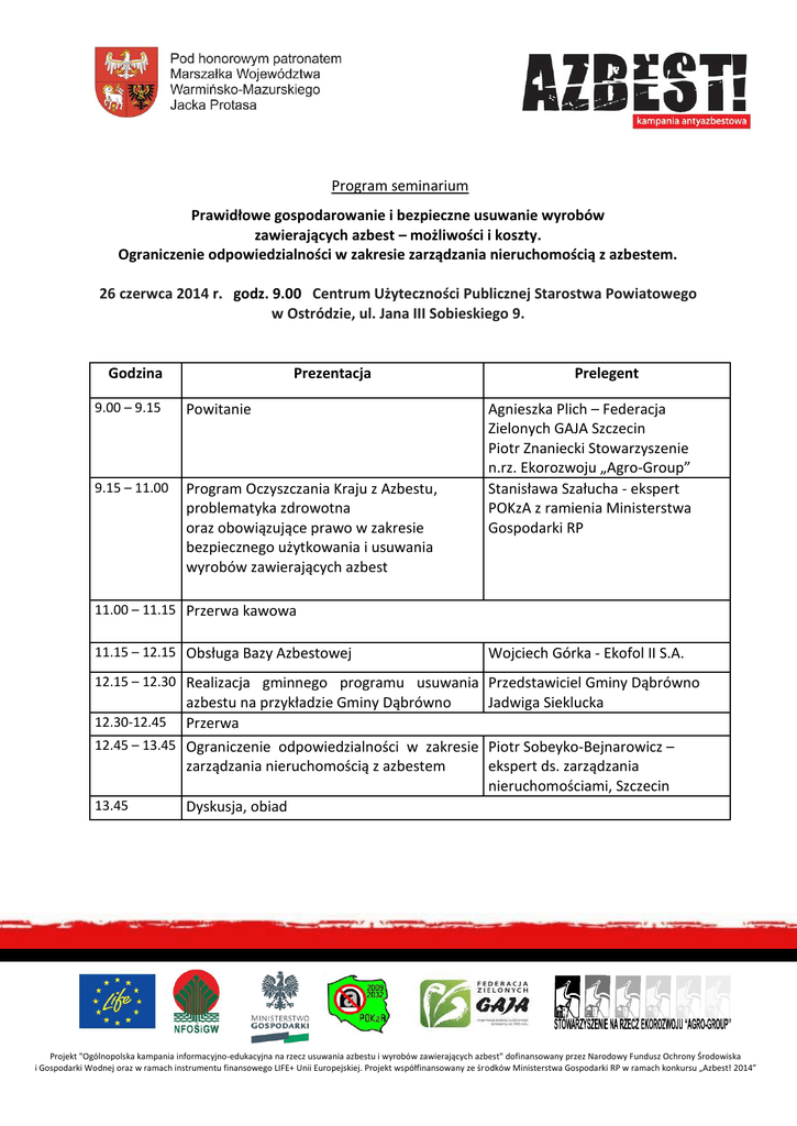 Program seminarium Prawidłowe gospodarowanie i bezpieczne usuwanie wyrobów zawierających azbest – możliwości i koszty. Ograniczenie odpowiedzialności w zakresie zarządzania nieruchomością z azbestem. 26 czerwca 2014 r. godz. 9.00 Centrum Użyteczności Publicznej Starostwa Powiatowego w Ostródzie, ul. Jana III Sobieskiego 9. Godzina Prezentacja 9.00 – 9.15 Powitanie 9.15 – 11.00 Program Oczyszczania Kraju z Azbestu, problematyka zdrowotna oraz obowiązujące prawo w zakresie bezpiecznego użytkowania i usuwania wyrobów zawierających azbest Prelegent Agnieszka Plich – Federacja Zielonych GAJA Szczecin Piotr Znaniecki Stowarzyszenie n.rz. Ekorozwoju „Agro-Group” Stanisława Szałucha - ekspert POKzA z ramienia Ministerstwa Gospodarki RP 11.00 – 11.15 Przerwa kawowa 11.15 – 12.15 Obsługa Bazy Azbestowej Wojciech Górka - Ekofol II S.A. 12.15 – 12.30 Realizacja gminnego programu usuwania Przedstawiciel Gminy Dąbrówno azbestu na przykładzie Gminy Dąbrówno Jadwiga Sieklucka Przerwa 12.45 – 13.45 Ograniczenie odpowiedzialności w zakresie Piotr Sobeyko-Bejnarowicz – zarządzania nieruchomością z azbestem ekspert ds. zarządzania nieruchomościami, Szczecin 13.45 Dyskusja, obiad 12.30-12.45 Projekt "Ogólnopolska kampania informacyjno-edukacyjna na rzecz usuwania azbestu i wyrobów zawierających azbest" dofinansowany przez Narodowy Fundusz Ochrony Środowiska i Gospodarki Wodnej oraz w ramach instrumentu finansowego LIFE+ Unii Europejskiej. Projekt współfinansowany ze środków Ministerstwa Gospodarki RP w ramach konkursu „Azbest! 2014”