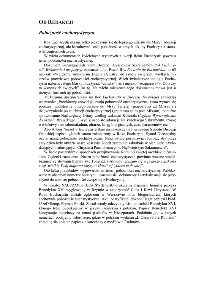 OD REDAKCJI Pobożność eucharystyczna Rok Eucharystii ma nie tylko przyczynić się do lepszego udziału we Mszy i adoracji eucharystycznej, ale kształtować scalą pobożność wiernych tak, by Eucharystia stanowiła centrum ich życia. W wielu dokumentach kościelnych wydanych z okazji Roku Eucharystii powraca temat pobożności eucharystycznej. Dokument Kongregacji ds. Kultu Bożego i Dyscypliny Sakramentów Rok Eucharystii. Wskazania i propozycje zaznacza: „Jan Paweł II w Ecclesia de Eucharistia, nr 62 napisał: «Wejdźmy, umiłowani Bracia i Siostry, do szkoły świętych, wielkich mistrzów prawdziwej pobożności eucharystycznej. W ich świadectwie teologia Eucharystii nabiera całego blasku przeżycia, >zaraża< nas i niejako >rozgrzewa<». Dotyczy to wszystkich świętych” (nr 6). Na wielu miejscach tego dokumentu mowa jest o różnych formach tej pobożności. Wskazania duszpasterskie na Rok Eucharystii w Diecezji Toruńskiej zawierają wezwanie: „Prezbiterzy zrewidują swoją pobożność eucharystyczną, która wyraża się poprzez modlitewne przygotowanie do Mszy Świętej (praeparatio ad Missam) i dziękczynienie po celebracji eucharystycznej (gratiarum actio post Missam), pobożne sprawowanie Najświętszej Ofiary według wskazań Kościoła (Ogólne Wprowadzenie do Mszału Rzymskiego, 3 wyd.), osobiste adoracje Najświętszego Sakramentu, troskę o właściwy stan tabernakulum, ołtarza, ksiąg liturgicznych, szat, paramentów etc.”. Abp Alfons Nossol w liście pasterskim na zakończenie Pierwszego Synodu Diecezji Opolskiej napisał: „Niech zatem zakończony w Roku Eucharystii Synod Diecezjalny ożywi naszą pobożność eucharystyczną. Nasz Synod postanawia również, aby przez cały dzień były otwarte nasze kościoły. Niech zatem nie zabraknie w nich ludzi nawiedzających i adorujących Chrystusa Pana obecnego w Najświętszym Sakramencie”. W liście pasterskim o sposobach przyjmowania Komunii świętej arcybiskup Stanisław Gądecki zaznacza: „Nasza pobożność eucharystyczna powinna zawsze współbrzmieć ze słowami hymnu św. Tomasza z Akwinu: zbliżam się w pokorze i niskości swej, wielbię Twój majestat skryty w Hostii tej (Adoro te devote)”. Oto kilka przykładów wypowiedzi na temat pobożności eucharystycznej. Publikowane w obecnym numerze biuletynu „Anamnesis” dokumenty i artykuły mają się przyczynić do wzrostu pobożności związanej z Eucharystią. W dziale: NAUCZANIE OJCA ŚWIĘTEGO drukujemy najpierw homilię papieża Benedykta XVI wygłoszoną w Rzymie w uroczystość Ciała i Krwi Chrystusa. W Roku Eucharystii zostali ogłoszeni w Warszawie nowi błogosławieni, których cechowała pobożność eucharystyczna. Aktu beatyfikacji dokonał legat papieski kard. Józef Glemp, Prymas Polski. Został wtedy odczytany List apostolski Benedykta XVI, którego treść publikujemy w języku łacińskim i polskim. Papież Benedykt XVI kontynuuje katechezy na temat psalmów w Nieszporach. Podobnie jak w innych numerach podajemy informacje, gdzie w polskim wydaniu „L’Osservatore Romano” znajdują się kolejne papieskie katechezy o modlitwie Psalmów. 4 Od Redakcji W części zatytułowanej: DOKUMENTY STOLICY APOSTOLSKIEJ czytelnik znajdzie najpierw kilka dokumentów Kongregacji ds. Kultu Bożego i Dyscypliny Sakramentów. Jest tu najpierw List Kongregacji do Przewodniczących Konferencji Episkopatów na temat recognitio tekstów liturgicznych, następnie zatwierdzony dla archidiecezji warszawskiej tekst kolekty i II czytania Liturgii Godzin na wspomnienie bł. Zygmunta Gorazdowskiego, prezbitera, z kolei Dekret zezwalający na wprowadzenie w diecezjach polskich wspomnienia obowiązkowego św. Józefa Sebastiana Pelczara i Dekret zezwalający na wprowadzenie w diecezjach polskich wspomnienia dowolnego bł. Jana Beyzyma, prezbitera, oraz Dekret zezwalający na korzystanie z kolekt i II czytań Liturgii Godzin we wspomnienia dowolne św. Wincentego Pallottiego, prezbitera, i bł. Jana Beyzyma, prezbitera. Tu też wydrukowany jest list Kongregacji ds. Duchowieństwa do biskupów diecezjalnych na temat Eucharystia, kapłaństwo i wspólnota kościelna. Dział: NAUCZANIE BISKUPÓW O LITURGII zawiera list pasterski Biskupa Bielsko-Żywieckiego wydany z okazji zbliżającej się kanonizacji bł. Józefa Bilczewskiego, biskupa, i katechezy liturgiczne bpa Zbigniewa Kiernikowskiego. W dziale: FORMACJA LITURGICZNA znajdują się artykuły związane z Eucharystią. Ks. Marian Pisarzak MIC pisze na temat Eucharystia – uczestnictwo w tajemnicy Kościoła, ks. Zdzisław Janiec jest autorem dwóch artykułów: Znaki i symbole teologiczne w komunikacji liturgicznej oraz Wierność przepisom i twórczość liturgiczna w celebracji Mszy świętej. Jest tu te wydrukowany artykuł ks. Ireneusza Koziorzębskiego Eucharystia pokarmem Ciała i Krwi Pańskiej. Publikujemy też artykuł ks. Jana Hadalskiego TChr Parresia – zapomniany dar sakramentu chrztu świętego. Dział: DUSZPASTERSTWO LITURGICZNE zawiera artykuł ks. Zdzisława Jańca Czy pobożność eucharystyczna jest zagrożona przez duchownych i świeckich? W dziale: INFORMACJE znajdujemy szereg krótkich wiadomości o wydarzeniach związanych z Rokiem Eucharystii i liturgią. Jest tu informacja o ogłoszeniu Instrumentum laboris na XI Synod Biskupów, krótka relacja o Pierwszej Ogólnopolskiej Pielgrzymce Ministrantów i Lektorów na Jasną Górę a także krótka relacja z III Krajowego Kongresu Eucharystycznego w Warszawie. Podano tu też informację o wyborze i zatwierdzeniu nowego rektora „Anselmianum” w Rzymie oraz informację o sympozjum liturgicznym w Katowicach na temat „Eucharystia a życie”, a także o wydawanym w Katowicach nowym czasopiśmie pastoralnym. Znajdziemy też w tym dziale obszerniejsze sprawozdanie z sympozjum Chrześcijańska inicjacja troską Kościoła w Europie i recenzję książki T. Kwiecień, Pochwała ciała. Liturgia i człowieczeństwo. Tę czę