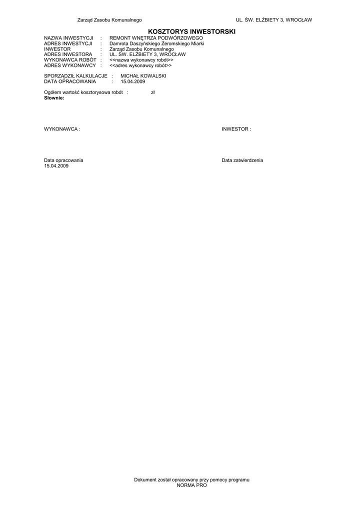 Zarząd Zasobu Komunalnego UL. ŚW. ELśBIETY 3, WROCŁAW KOSZTORYS INWESTORSKI NAZWA INWESTYCJI ADRES INWESTYCJI INWESTOR ADRES INWESTORA WYKONAWCA ROBÓT ADRES WYKONAWCY : : : : : : REMONT WNĘTRZA PODWÓRZOWEGO Damrota Daszyńskiego śeromskiego Miarki Zarząd Zasobu Komunalnego UL. ŚW. ELśBIETY 3, WROCŁAW <<nazwa wykonawcy robót>> <<adres wykonawcy robót>> SPORZĄDZIŁ KALKULACJE : DATA OPRACOWANIA : MICHAŁ KOWALSKI 15.04.2009 Ogółem wartość kosztorysowa robót : Słownie: zł WYKONAWCA : INWESTOR : Data opracowania 15.04.2009 Data zatwierdzenia Dokument został opracowany przy pomocy programu NORMA PRO Ŝeromskiego 69-85 zieleń zzk 25 03 Lp. Podst 1 1 KNR 2-21 d.1 0217-04 2 KNR 2-21 d.1 0218-01 3 KNR 2-01 d.1 0235-02 4 KNR 2-23 d.1 0209-02 5 KNR 2-02 d.1 0603-01 6 KNR 2-02 d.1 0603-02 PRZEDMIAR Opis i wyliczenia j.m. Mechaniczne zdjęcie warstwy ziemi urodzajnej spycharka (grunt zadarniony) m3 1712*0.1 m3 Rozścielenie ziemi urodzajnej ręczne z przerzutem na terenie płaskim + Ŝyzna m3 gleba 1712*0.1 m3 Formowanie i zagęszczanie nasypów o wys. do 3.0 m spycharkami w gruncie kat. III-IV - z wykorzystaniem ziemi odzyskanej podczas korytowania 318 m3 Ręczne wykonywanie nawierzchni trawiastej siewem z przykryciem nasion po wysiewie walcem kolczatką - w tym 30% trawy "sportowej" Krotność = 1.1 2364 m2 m3 m2 Izolacje przeciwwilgoc.powlokowe bitumiczne pionowe - wyk.na zimno z emul- m2 sji asfalt.- pierwsza warstwa - zabezpieczenie ścian garaŜy 40 m2 Izolacje przeciwwilgoc.powlokowe bitumiczne pionowe - wyk.na zimno z emul- m2 sji asfalt.- druga i nast.warstwa 40 m2 7 rozłoŜenie kory rozdrobnionej d.1 kalk. własna 200 m2 8 płotek myśliwski d.1 kalk. własna 80 m 2 9 KNR 2-21 d.2 0320-04 10 KNR 2-21 d.2 0320-04 11 KNR 2-21 d.2 0320-04 12 KNR 2-21 d.2 0320-04 13 KNR 2-21 d.2 0320-04 14 KNR 2-21 d.2 0320-04 15 KNR 2-21 d.2 0320-04 16 KNR 2-21 d.2 0301-01 17 KNR 2-21 d.2 0320-04 3 18 KNR 2-21 d.3 0323-04 m2 m drzewa liściaste Sadzenie drzew liściastych z bryłą korzeniową w gruncie kat.III z zaprawą dołów - Śliwa purpurowa - Atropurpurea 12 szt. szt. Sadzenie drzew liściastych z bryłą korzeniową w gruncie kat.III z zaprawą dołów - Jabłoń kwiecista 3 szt. Sadzenie drzew liściastych z bryłą korzeniową w gruncie kat.III z zaprawą dołów - Jabłoń jagodowa 3 szt. Sadzenie drzew liściastych z bryłą korzeniową w gruncie kat.III z zaprawą dołów - sumak octowiec 2 szt. Sadzenie drzew liściastych z bryłą korzeniową w gruncie kat.III z zaprawą dołów - Jarząb pospolity 4 szt. Sadzenie drzew liściastych z bryłą korzeniową w gruncie kat.III z zaprawą dołów - Brzoza brodawkowata 6 szt. szt. szt. szt. szt. szt. szt. Sadzenie drzew i krzewów liściast.form naturalnych na terenie płaskim w szt. gr.kat.I-II bez zaprawy dołów śr./głębok. 0.3 m - karagana drzewko szczepione 4 szt. Norma PRO Wersja 4.26 Licencja: 10016 dla ZZK 171.200 RAZEM 171.200 171.200 RAZEM 171.200 318.000 RAZEM 318.000 2 364.000 RAZEM 2 364.000 40.000 RAZEM 40.000 40.000 RAZEM 40.000 200.000 RAZEM 200.000 80.000 RAZEM 80.000 12.000 RAZEM 12.000 3.000 RAZEM 3.000 3.000 RAZEM 3.000 3.000 RAZEM 3.000 2.000 RAZEM 2.000 4.000 RAZEM 4.000 6.000 RAZEM 6.000 4.000 RAZEM 4.000 6.000 RAZEM 6.000 2.000 RAZEM 2.000 szt. szt. drzewa iglaste Sadzenie drzew iglastych na terenie płaskim w gruncie kat.III z zaprawą dołów szt. śr./głębok. 0.5 m - modrzew 2 szt. -2- Razem szt. Sadzenie drzew liściastych z bryłą korzeniową w gruncie kat.III z zaprawą dołów - Śliwa purpurowa 3 Sadzenie drzew liściastych z bryłą korzeniową w gruncie kat.III z zaprawą dołów - klon Ginnata 6 Poszcz Ŝeromskiego 69-85 zieleń zzk 25 03 Lp. Podst 19 KNR 2-21 d.3 0323-04 20 KNR 2-21 d.3 0323-04 4 21 KNR 2-21 d.4 0323-04 22 KNR 2-21 d.4 0323-04 23 KNR 2-21 d.4 0323-04 24 KNR 2-21 d.4 0323-04 5 25 KNR 2-21 d.5 0301-01 26 KNR 2-21 d.5 0301-01 27 KNR 2-21 d.5 0301-01 28 KNR 2-21 d.5 0301-01 29 KNR 2-21 d.5 0301-01 30 KNR 2-21 d.5 0301-01 31 KNR 2-21 d.5 0301-01 32 KNR 2-21 d.5 0301-01 33 KNR 2-21 d.5 0301-01 34 KNR 2-21 d.5 0301-01 35 KNR 2-21 d.5 0301-01 36 KNR 2-21 d.5 0301-01 PRZEDMIAR Opis i wyliczenia j.m. Sadzenie drzew iglastych na terenie płaskim w gruncie kat.III z zaprawą dołów szt. śr./głębok. 0.5 m - sosna pospolita 3 szt. Sadzenie drzew iglastych na terenie płaskim w gruncie kat.III z zaprawą dołów szt. śr./głębok. 0.5 m - Jałowiec kolumnowy 3 szt. krzewy iglaste Sadzenie krzewów iglastych na terenie płaskim w gruncie kat.III z zaprawą do- szt. łów śr./głębok. 0.5 m - Jałowiec płoŜący Hornibroda 5 szt. Sadzenie krzewów iglastych na terenie płaskim w gruncie kat.III z zaprawą do- szt. łów śr./głębok. 0.5 m - Jałowiec płoŜący juniperus horizontalis 5 szt. Sadzenie krzewów iglastych na terenie płaskim w gruncie kat.III z zaprawą do- szt. łów śr./głębok. 0.5 m - Jałowiec krzewiasty 2 szt. Sadzenie krzewów iglastych na terenie płaskim w gruncie kat.III z zaprawą do- szt. łów śr./głębok. 0.5 m - Jałowiec virgiński 2 szt. krzewy liściaste Sadzenie drzew i krzewów liściast.form naturalnych na terenie płaskim w gr.kat.I-II bez zaprawy dołów śr./głębok. 0.3 m - Porzeczka ozdobna alpejska 150 szt. Sadzenie drzew i krzewów liściast.form naturalnych na terenie płaskim w szt. gr.kat.I-II bez zaprawy dołów śr./głębok. 0.3 m - Porzeczka krwista Ribes sanguinem Pulbarough Scarlet 100 szt. Sadzenie drzew i krzewów liściast.form naturalnych na terenie płaskim w gr.kat.I-II bez zaprawy dołów śr./głębok. 0.3 m - forsycja pośrednia 20 szt. Sadzenie drzew i krzewów liściast.form naturalnych na terenie płaskim w gr.kat.I-II bez zaprawy dołów śr./głębok. 0.3 m - forsycja zwisła 3 szt. Sadzenie drzew i krzewów liściast.form naturalnych na terenie płaskim w gr.kat.I-II bez zaprawy dołów śr./głębok. 0.3 m - forsycja maluch 15 szt. Sadzenie drzew i krzewów liściast.form naturalnych na terenie płaskim w 
