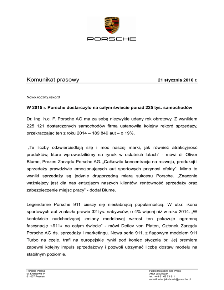 Komunikat prasowy 21 stycznia 2016 r. Nowy roczny rekord W 2015 r. Porsche dostarczyło na całym świecie ponad 225 tys. samochodów Dr. Ing. h.c. F. Porsche AG ma za sobą niezwykle udany rok obrotowy. Z wynikiem 225 121 dostarczonych samochodów firma ustanowiła kolejny rekord sprzedaży, przekraczając ten z roku 2014 – 189 849 aut – o 19%. „Te liczby odzwierciedlają siłę i moc naszej marki, jak również atrakcyjność produktów, które wprowadziliśmy na rynek w ostatnich latach” - mówi dr Oliver Blume, Prezes Zarządu Porsche AG. „Całkowita koncentracja na rozwoju, produkcji i sprzedaży prawdziwie emocjonujących aut sportowych przynosi efekty”. Mimo to wyniki sprzedaży są jedynie drugorzędną miarą sukcesu Porsche. „Znacznie ważniejszy jest dla nas entuzjazm naszych klientów, rentowność sprzedaży oraz zabezpieczenie miejsc pracy” - dodał Blume. Legendarne Porsche 911 cieszy się niesłabnącą popularnością. W ub.r. ikona sportowych aut znalazła prawie 32 tys. nabywców, o 4% więcej niż w roku 2014. „W kontekście nadchodzącej zmiany modelowej wzrost ten pokazuje ogromną fascynację »911« na całym świecie” - mówi Detlev von Platen, Członek Zarządu Porsche AG ds. sprzedaży i marketingu. Nowa seria 911, z flagowym modelem 911 Turbo na czele, trafi na europejskie rynki pod koniec stycznia br. Jej premiera zapewni kolejny impuls sprzedażowy i pozwoli utrzymać liczbę dostaw modelu na stabilnym poziomie. Porsche Polska ul. Krańcowa 44 61-037 Poznań Public Relations and Press Artur Jakubczak tel. +48 61 62 73 911 e-mail: [email protected] Nie ulega wątpliwości, że głównymi motorami wzrostu Porsche są samochody typu SUV, a w szczególności bestsellerowy Macan. Z wynikiem ponad 80 tys. dostarczonych aut został on najchętniej wybieranym modelem Porsche w ofercie, i to już po pierwszym pełnym roku dostępności na rynku. Tuż za nim uplasowało się Cayenne (73 119 sztuk). Na tle wyników z 2014 r. obie serie wypracowały dwucyfrowe wzrosty liczby dostaw. Sprzedaż Porsche Cayman wzrosła nieznacznie, o 1%. Modele Panamera i Boxster uzyskały wyniki słabsze niż w 2014 r., czego powodem są zbliżające się zmiany generacyjne - po wprowadzeniu następców Porsche spodziewa się ponownych wzrostów. W przyszłości Boxster i Cayman będą oferowane jako seria 718. Podobnie jak dotychczas, pozostaną spokrewnione od strony optycznej i technicznej. Po raz pierwszy w historii największym pojedynczym rynkiem zbytu dla Porsche były Chiny, gdzie dostarczono 58 009 samochodów - o 24% więcej niż w 2014 r. Drugie miejsce zajęły Stany Zjednoczone z wynikiem 51 756 aut, co oznacza 10-proc. wzrost. W całej Europie sprzedano 75 354 pojazdy, o 24% więcej niż przed rokiem, a najwięcej w Niemczech (28 953 szt., +21%). Grudzień Dostawy PORSCHE AG Świat 2015 Styczeń-grudzień 2014 Różnica (%) 15 227 20 644 2015 2014 Różnica (%) -26 225 121 189 849 +19 Europa 4 845 6 339 -24 75 354 60 794 +24 Niemcy 1 961 1 620 +21 28 953 23 841 +21 Ameryka 4 712 4 162 +13 62 109 55 811 +11 USA 3 937 3 275 +20 51 756 47 007 +10 Azja, Afryka i Bliski Wschód 5 670 10 143 -44 87 658 73 244 +20 Chiny 3 707 -42 58 009 46 931 +24 6 427