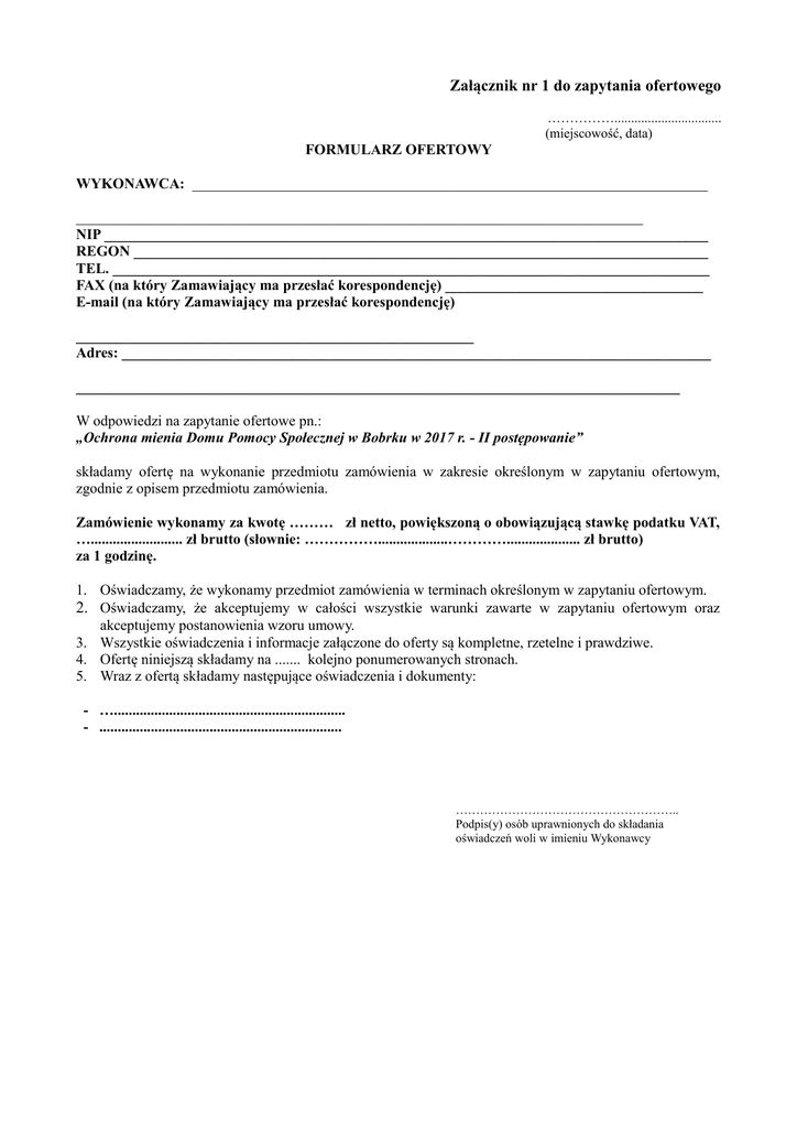 Załącznik nr 1 do zapytania ofertowego ……………................................ (miejscowość, data) FORMULARZ OFERTOWY WYKONAWCA: ______________________________________________________________________ _____________________________________________________________________________ NIP __________________________________________________________________________________ REGON ______________________________________________________________________________ TEL. _________________________________________________________________________________ FAX (na który Zamawiający ma przesłać korespondencję) ___________________________________ E-mail (na który Zamawiający ma przesłać korespondencję) ______________________________________________________ Adres: ________________________________________________________________________________ __________________________________________________________________________________ W odpowiedzi na zapytanie ofertowe pn.: „Ochrona mienia Domu Pomocy Społecznej w Bobrku w 2017 r. - II postępowanie” składamy ofertę na wykonanie przedmiotu zamówienia w zakresie określonym w zapytaniu ofertowym, zgodnie z opisem przedmiotu zamówienia. Zamówienie wykonamy za kwotę ……… zł netto, powiększoną o obowiązującą stawkę podatku VAT, …......................... zł brutto (słownie: ……………...................………….................... zł brutto) za 1 godzinę. 1. Oświadczamy, że wykonamy przedmiot zamówienia w terminach określonym w zapytaniu ofertowym. 2. Oświadczamy, że akceptujemy w całości wszystkie warunki zawarte w zapytaniu ofertowym oraz akceptujemy postanowienia wzoru umowy. 3. Wszystkie oświadczenia i informacje załączone do oferty są kompletne, rzetelne i prawdziwe. 4. Ofertę niniejszą składamy na ....... kolejno ponumerowanych stronach. 5. Wraz z ofertą składamy następujące oświadczenia i dokumenty: - …............................................................... - .................................................................. ……………………………………………….. Podpis(y) osób uprawnionych do składania oświadczeń woli w imieniu Wykonawcy
