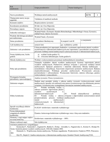Rok akademicki: Grupa przedmiotów: Nazwa przedmiotu: Walidacja metod analitycznych Tłumaczenie nazwy na jęz. angielski: Kierunek studiów: Numer katalogowy: ECTS Validation of analitical methods Bezpieczeństwo żywności Koordynator przedmiotu: Dr hab. inż. Ewa Majewska Prowadzący zajęcia: Dr hab. inż. Ewa Majewska Wydział Nauk o Żywności, Katedra Biotechnologii, Mikrobiologii i Oceny Żywności, Zakład Oceny Jakości Żywności Jednostka realizująca: 1 Wydział, dla którego przedmiot Wydział Nauk o Żywności jest realizowany: b) stopień I rok III c) stacjonarne Status przedmiotu: a) przedmiot fakultatywny Cykl dydaktyczny: semestr letni jęz. wykładowy: polski Celem przedmiotu jest zapoznanie studentów z systemami zapewnienia jakości wyników uzyskiwanych w laboratoriach badawczych oraz zapoznanie z procedurami związanymi z procesem walidacji metod analitycznych wykorzystywanych w laboratoriach badawczych. Założenia i cele przedmiotu: Formy dydaktyczne, liczba godzin: Metody dydaktyczne: Pełny opis przedmiotu: Wymagania formalne (przedmioty wprowadzające): Założenia wstępne: Efekty kształcenia: a) wykład: liczba godzin 15; b) ćwiczenia laboratoryjne: liczba godzin 0; Wykład z wykorzystaniem prezentacji multimedialnych, konsultacje Tematyka wykładów: Jakość wyników analitycznych. Systemy zapewnienia jakości wyników analitycznych. Podstawowe definicje związane z procesem walidacji metod analitycznych. Spójność pomiarowa i materiały odniesienia. Metody kalibracyjne – nomenklatura i klasyfikacja. Szacowanie niepewności pomiarów analitycznych. Badania międzylaboratoryjne. Walidacja procedur analitycznych. Wyznaczanie precyzji, powtarzalności i odtwarzalności. Wyznaczanie liniowości, zakresu roboczego, granicy wykrywalności i oznaczalności. Analiza żywności. Prawo żywnościowe. Student musi posiadać wiedzę z zakresu analizy żywności (wykorzystywanie metod analitycznych, sposoby ich realizacji) oraz prawa żywnościowego (zna dokumenty prawne związane z żywnością oraz wymaganiami stawianymi metodom analitycznym). 01Posiada niezbędną wiedzę z zakresu systemów zapewnienia jakości wyników uzyskiwanych w laboratoriach badawczych 03Potrafi zidentyfikować problemy 02Posiada wiedzę z zakresu związane z odpowiednim zastosowaniem metod przeprowadzania procesu walidacji analitycznych metod analitycznych wykorzystywanych w laboratoriach badawczych Sposób weryfikacji efektów 01,02,03- kolokwium z materiału wykładowego kształcenia: Forma dokumentacji osiągniętych efektów Pytania z końcowego kolokwium wykładowego wraz z listą ocen studentów. kształcenia: Elementy i wagi mające wpływ Kolokwium z materiału wykładowego – 100% na ocenę końcową: Miejsce realizacji zajęć: Sale dydaktyczne Literatura podstawowa i uzupełniająca: 1. Konieczka P., Namieśnik J., Zygmunt B., Bulska E., Świtaj – Zawadka A., Naganowska A., Kremer E., Rompa M.: Ocena i kontrola jakości wyników analitycznych. CEEAM, Gdańsk 2004. 2. Hulanicki A.: Współczesna chemia analityczna. Wybrane zagadnienia. Wydawnictwo Naukowe PWN, Warszawa 2001 3. Hyk W., Stojek Z: Analiza statystyczna w laboratorium analitycznym. Komitet Chemii Analitycznej PAN, Warszawa 2000 4. Kealey D., Haines P.J.: Chemia analityczna. Wydawnictwo Naukowe PWN, Warszawa 2005 5. Polska Norma PN-EN ISO/IEC 17025:2005. Ogólne wymagania dotyczące kompetencji laboratoriów badawczych i wzorcujących. 6. Przydatność metod analitycznych do określonych celów. Przewodnik walidacji metod w laboratorium i zagadnienia związane. Biuletyn Informacyjny KPLB POLLAB, 2000 UWAGI: Warunkiem zaliczenia przedmiotu jest uzyskanie minimum 51% ogólnej liczby punktów na kolokwium z materiału wykładowego. Nie zaliczenie kolokwium z materiału wykładowego w pierwszym terminie skutkuje tym, iż do oceny końcowej wliczana jest każda kolejna ocena niedostateczna. Wskaźniki ilościowe charakteryzujące moduł/przedmiot: Szacunkowa sumaryczna liczba godzin pracy studenta (kontaktowych i pracy własnej) niezbędna dla osiągnięcia zakładanych efektów kształcenia - na tej podstawie należy wypełnić pole ECTS: Łączna liczba punktów ECTS, którą student uzyskuje na zajęciach wymagających bezpośredniego udziału nauczycieli akademickich: Łączna liczba punktów ECTS, którą student uzyskuje w ramach zajęć o charakterze praktycznym, takich jak zajęcia laboratoryjne, projektowe, itp.: 30 h 1 ECTS 0 ECTS Tabela zgodności kierunkowych efektów kształcenia efektami przedmiotu: Nr /symbol efektu 01 02 03 04 05 Wymienione w wierszu efekty kształcenia: posiada niezbędną wiedzę z zakresu systemów zapewnienia jakości wyników uzyskiwanych w laboratoriach badawczych posiada wiedzę z zakresu przeprowadzania procesu walidacji metod analitycznych wykorzystywanych w laboratoriach badawczych potrafi identyfikować problemy związane z odpowiednim zastosowaniem metod analitycznych Dodaj tekst Dodaj tekst Odniesienie do efektów dla programu kształcenia na kierunku K_W04, K_W06, K_W08, K_W09, K_W14 K_W15, K_W20 K_K02 Dodaj tekst Dodaj tekst